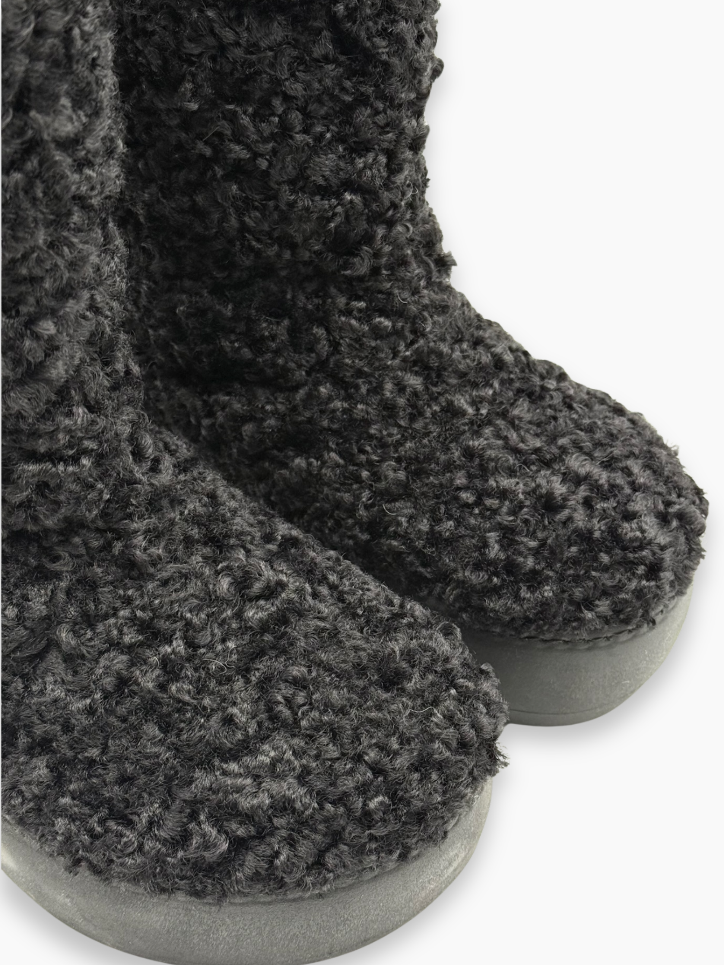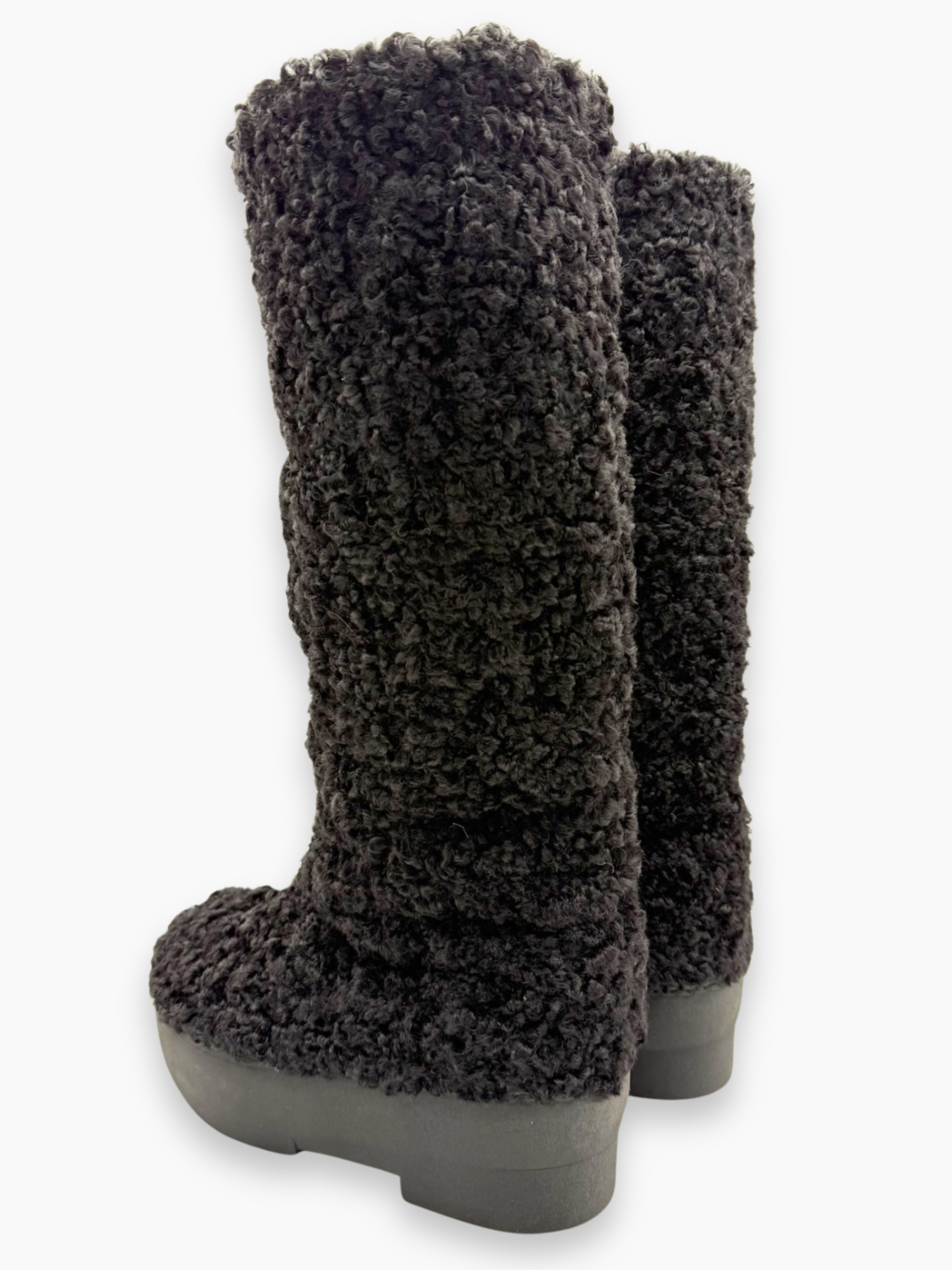 Tall boots crafted from soft black shearling, featuring a soft, warm texture that envelops the foot and leg. The chunky, tonal rubber sole provides stability and a contemporary touch, making this style perfect for cozy, urban-chic outfits this winter.