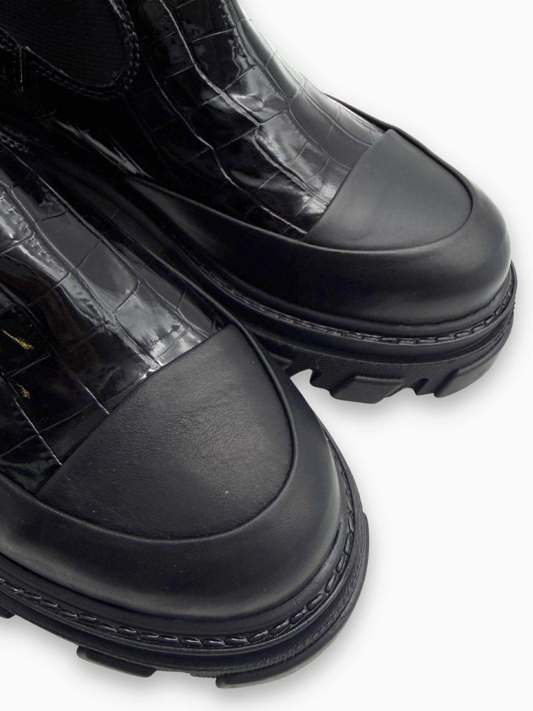 Stivali alti neri con finitura effetto cocco, pensati per chi cerca un modello deciso e ricercato. La tomaia combina materiali strutturati e inserti elasticizzati che garantiscono aderenza e comfort, mentre la suola chunky scolpita aggiunge carattere e stabilità. Perfetti per elevare outfit minimal, streetwear o più sofisticati, grazie al mix di texture e alla linea audace.