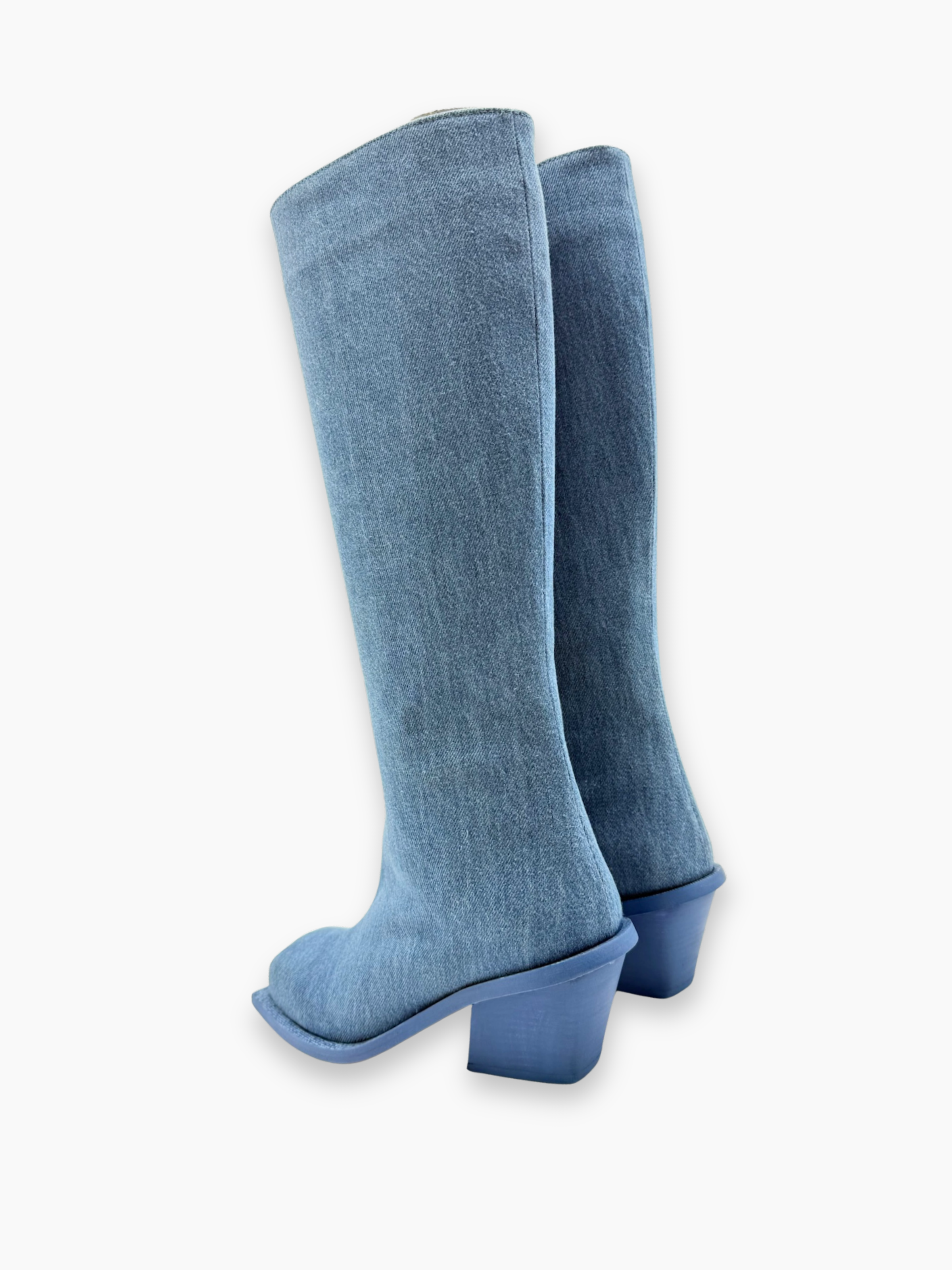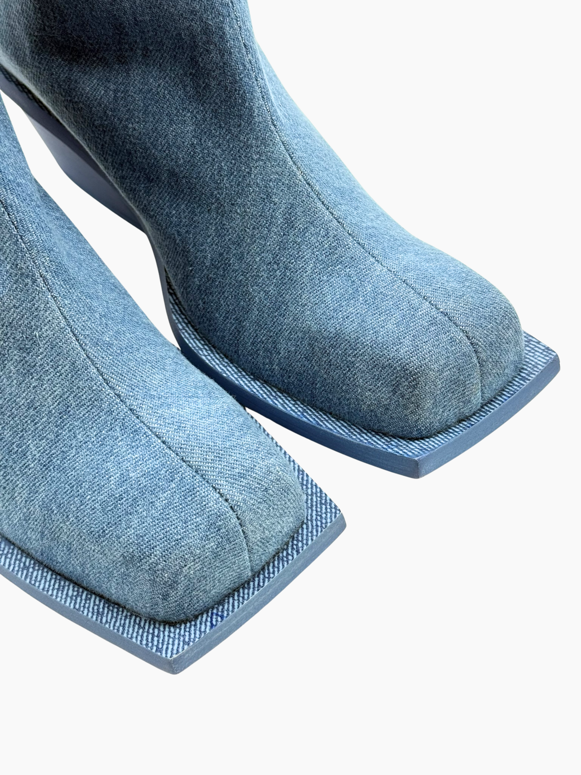 Stivale in denim azzurro dal design moderno e scultoreo. Caratterizzato da punta tonda con dettaglio Tabi e tacco geometrico sfaccettato, questo modello unisce lo spirito casual del jeans con un’estetica couture. Un accessorio statement, perfetto per aggiungere personalità ai look da giorno e da sera.