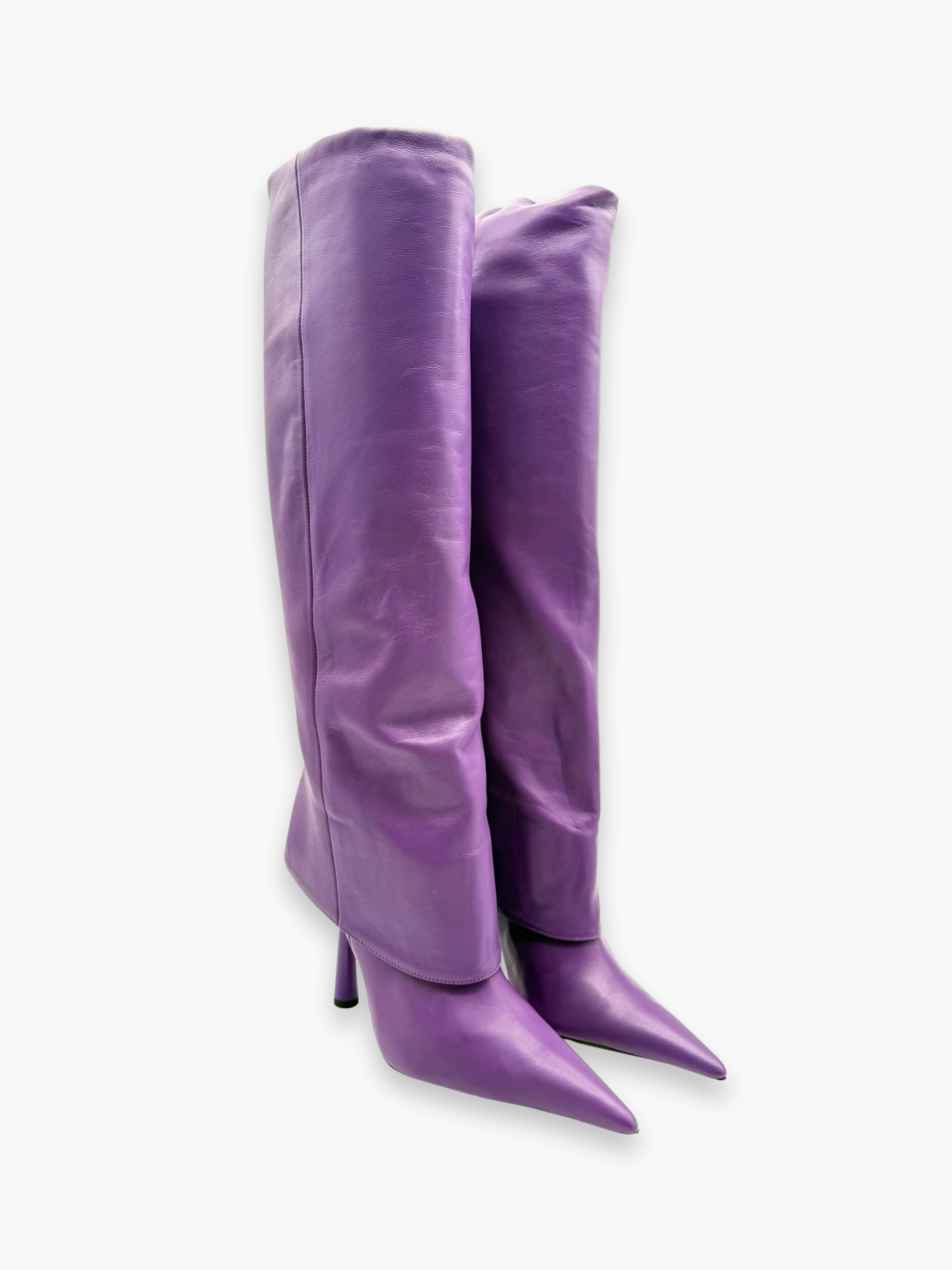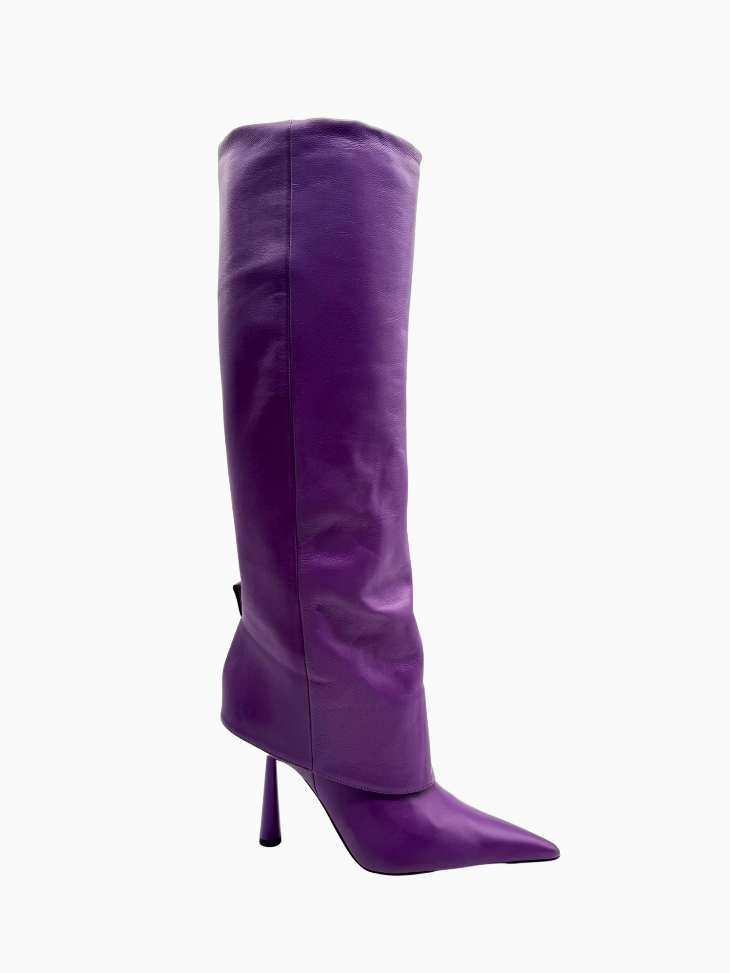 Stivale in pelle viola firmato Gia Borghini, con una silhouette decisa e contemporanea. Il design elegante è valorizzato da una punta affusolata e da un tacco scultoreo che dona slancio e personalità. Un modello iconico che fonde minimalismo e carattere, perfetto per dare colore e stile ai look urbani e da sera.