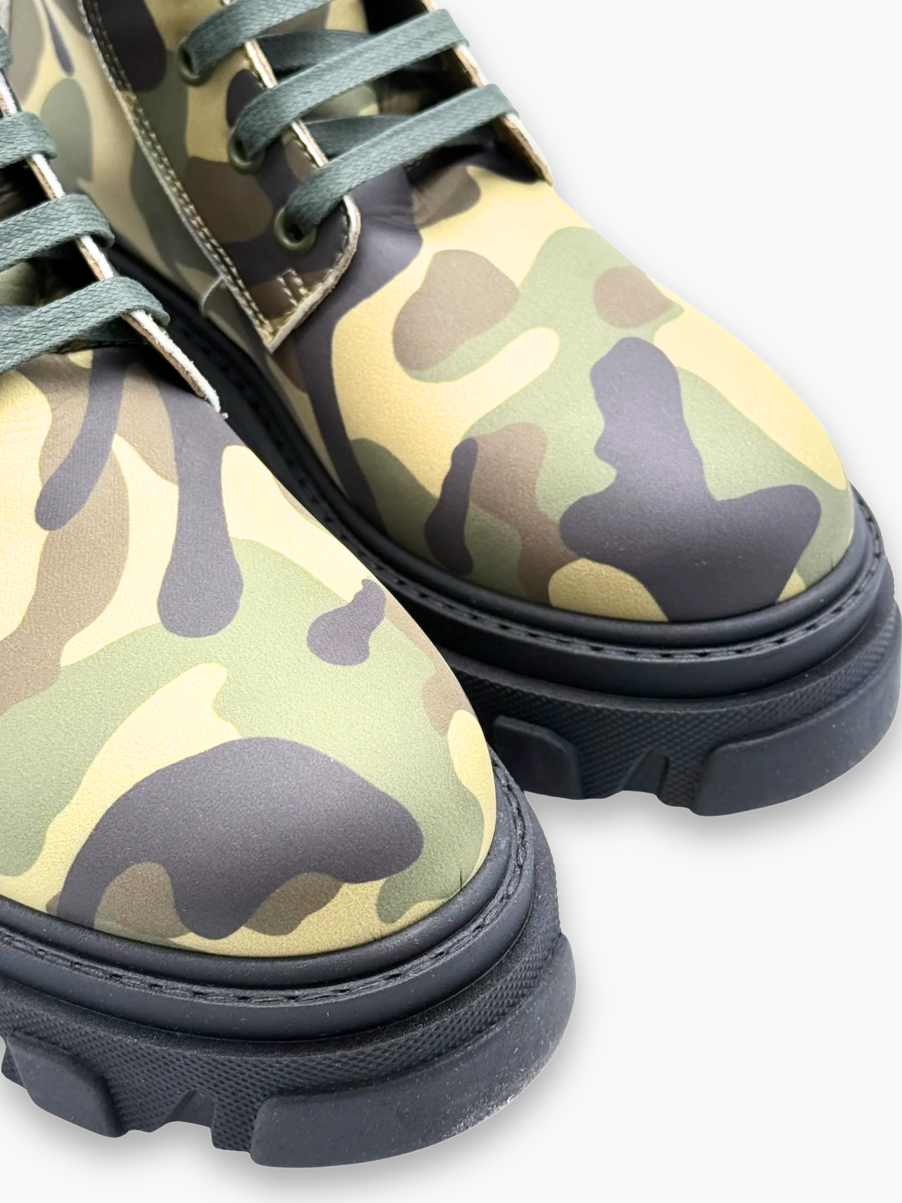 Gia Borghini ankle boots with a bold, contemporary feel. Crafted from camouflage-print leather, they feature a structured profile with a lace-up front and padded collar. The chunky black rubber sole lends a bold look and ensures maximum stability and comfort.