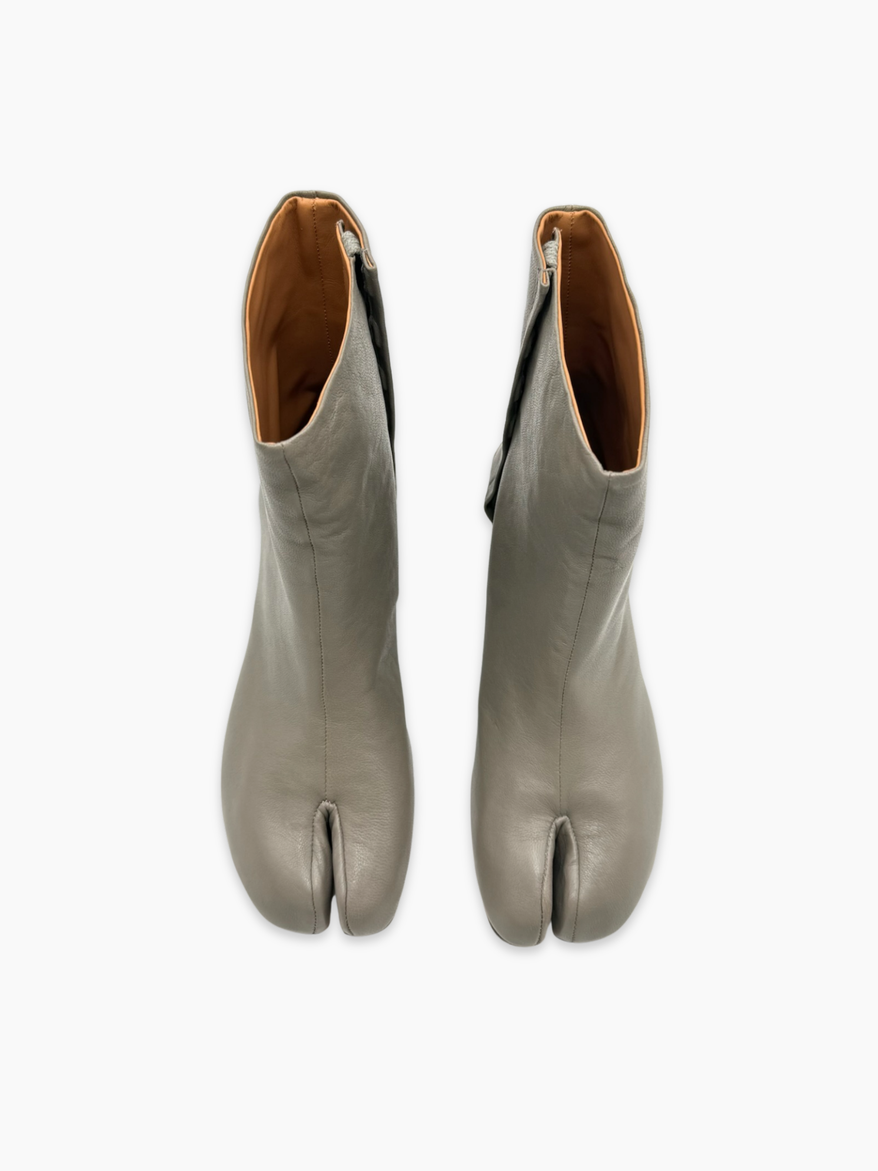 Maison Margiela's iconic Tabi boots stand out in this elegant and refined gray leather version. The famous split toe and low wooden heel make them a recognizable and timeless model. Ideal for those who want to express a bold style with a touch of avant-garde.