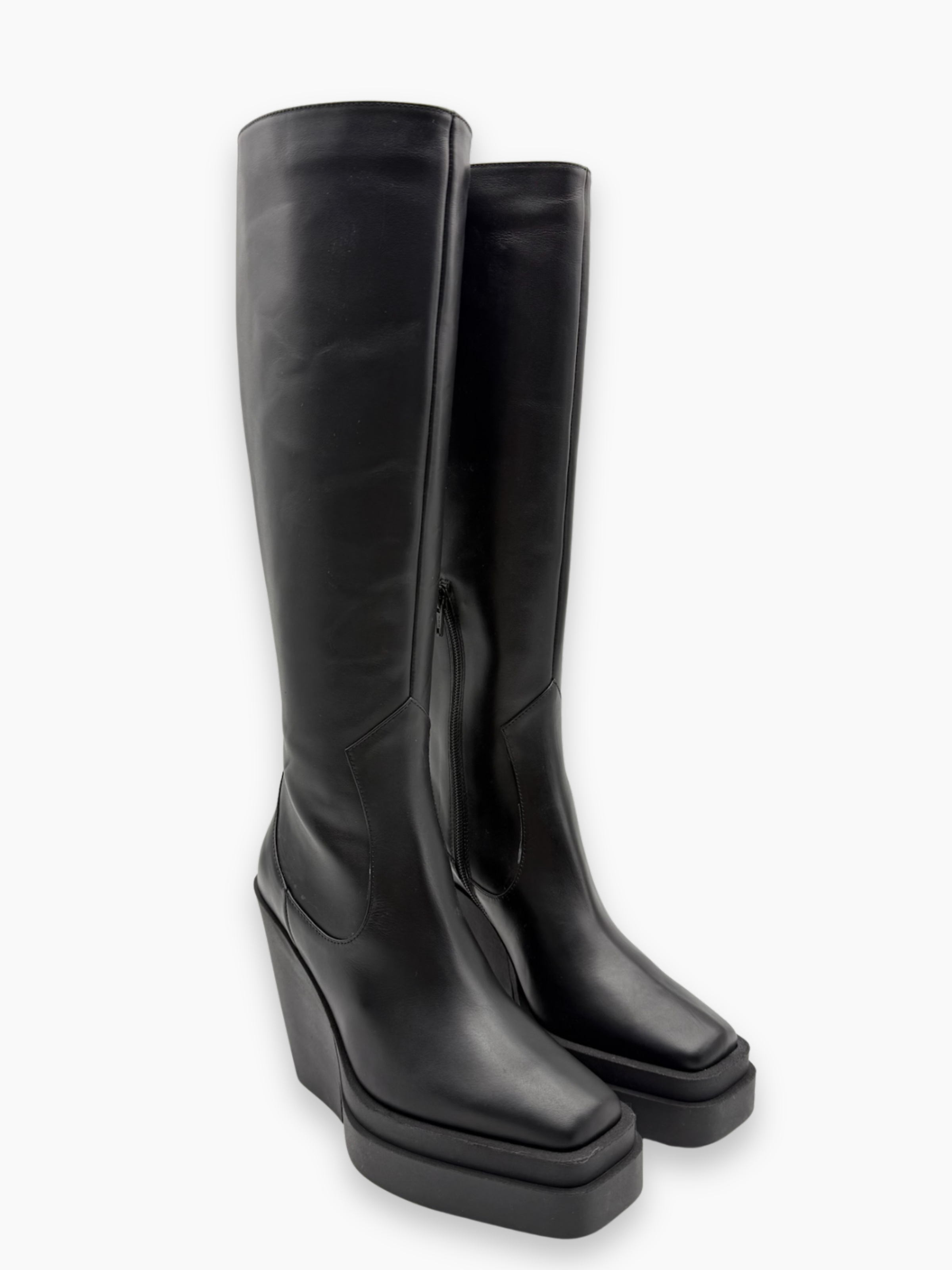 Gia Borghini thigh-high boots crafted from premium black leather, featuring a modern design with a geometric wedge heel and square toe. The balance of elegance and boldness makes this model perfect for completing contemporary looks with a touch of character.