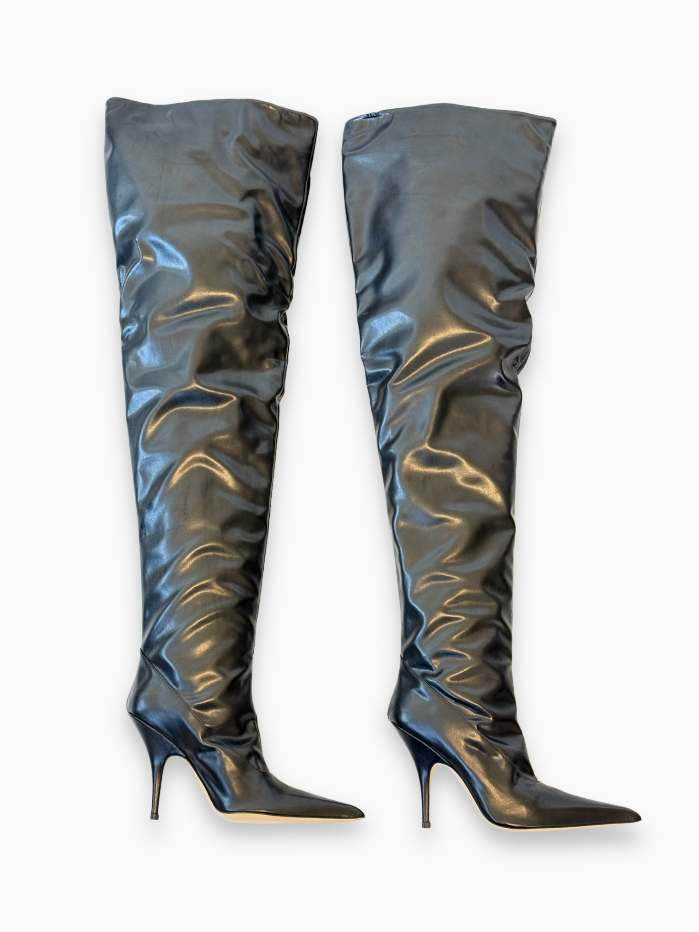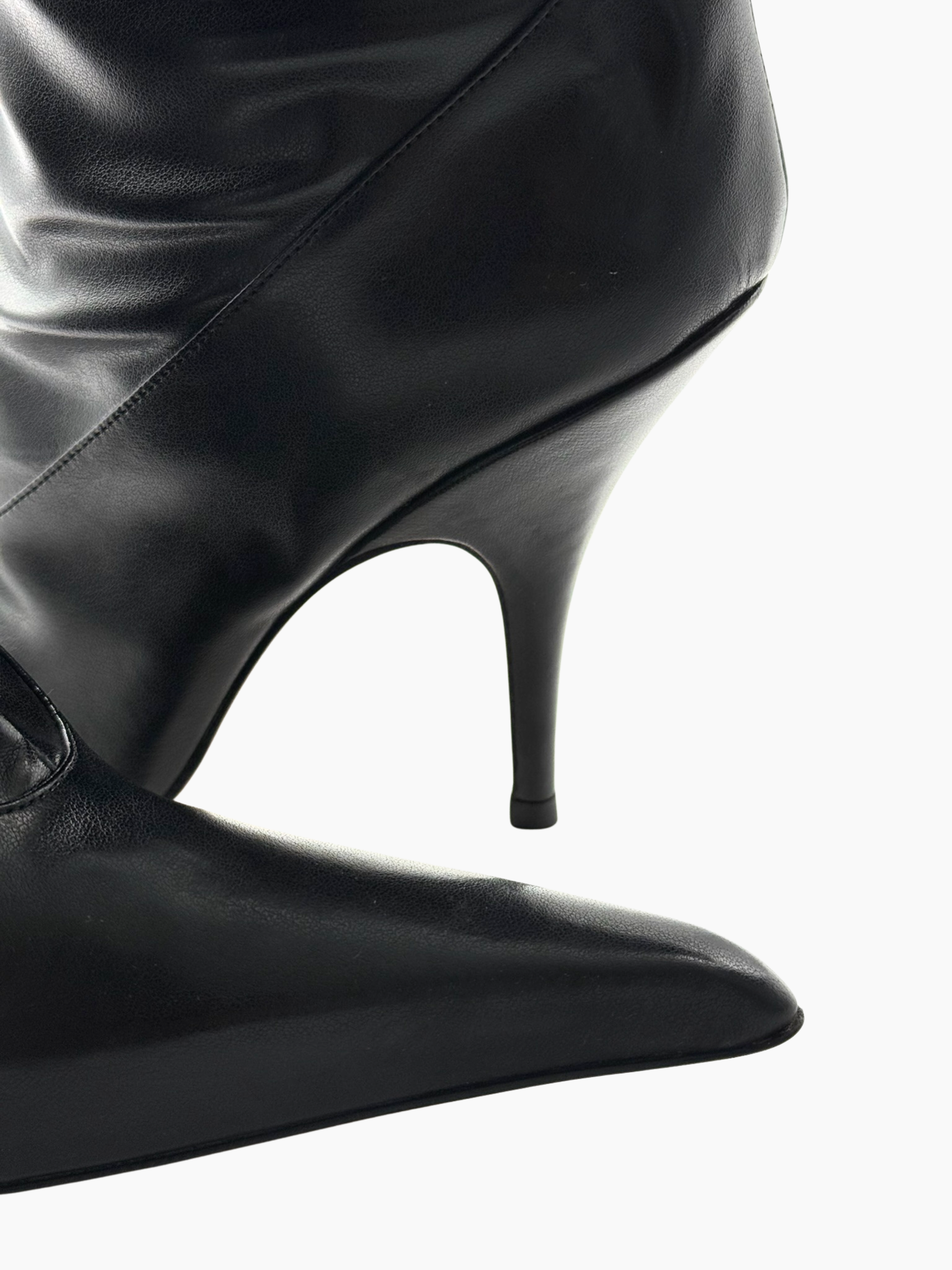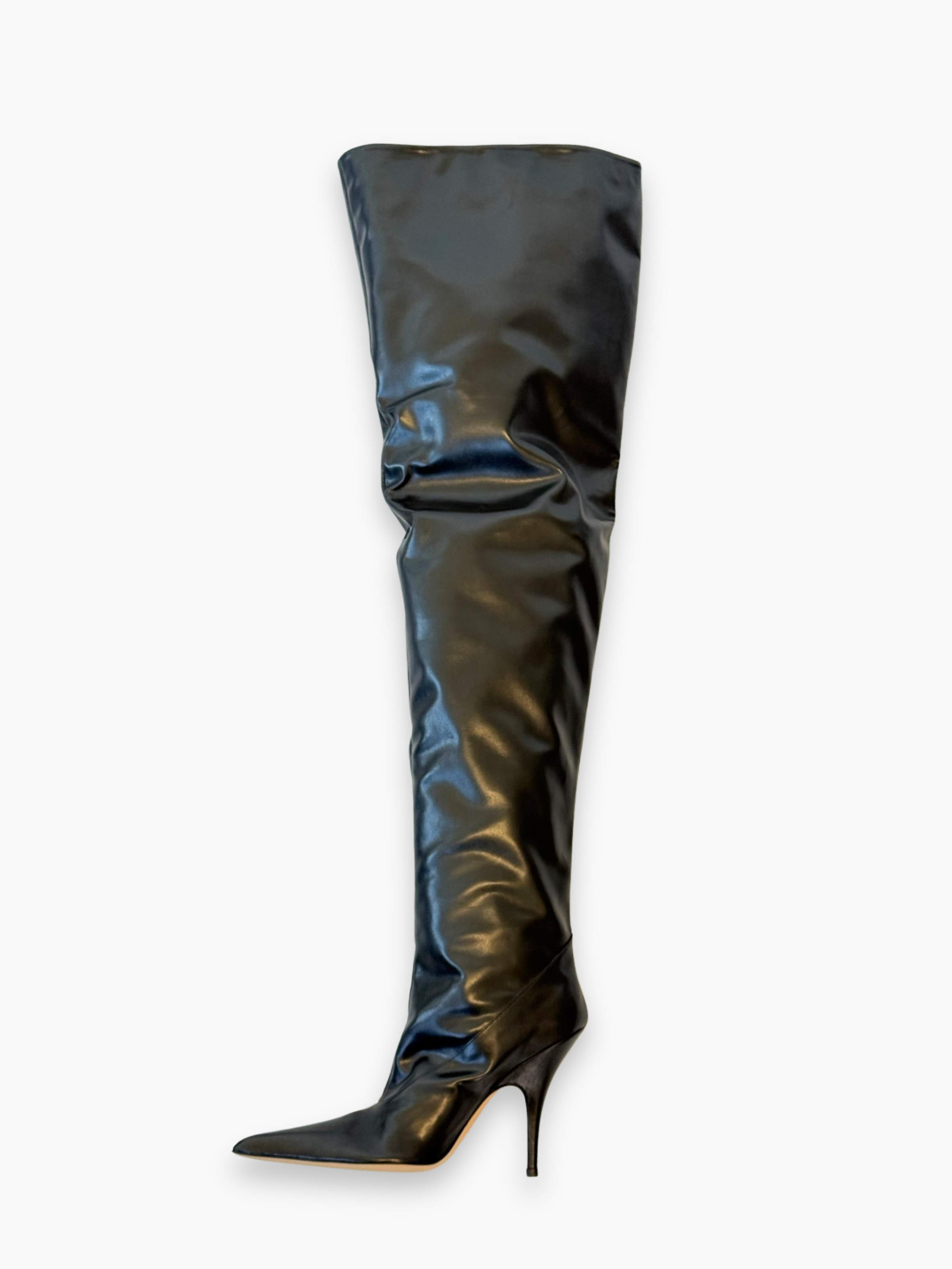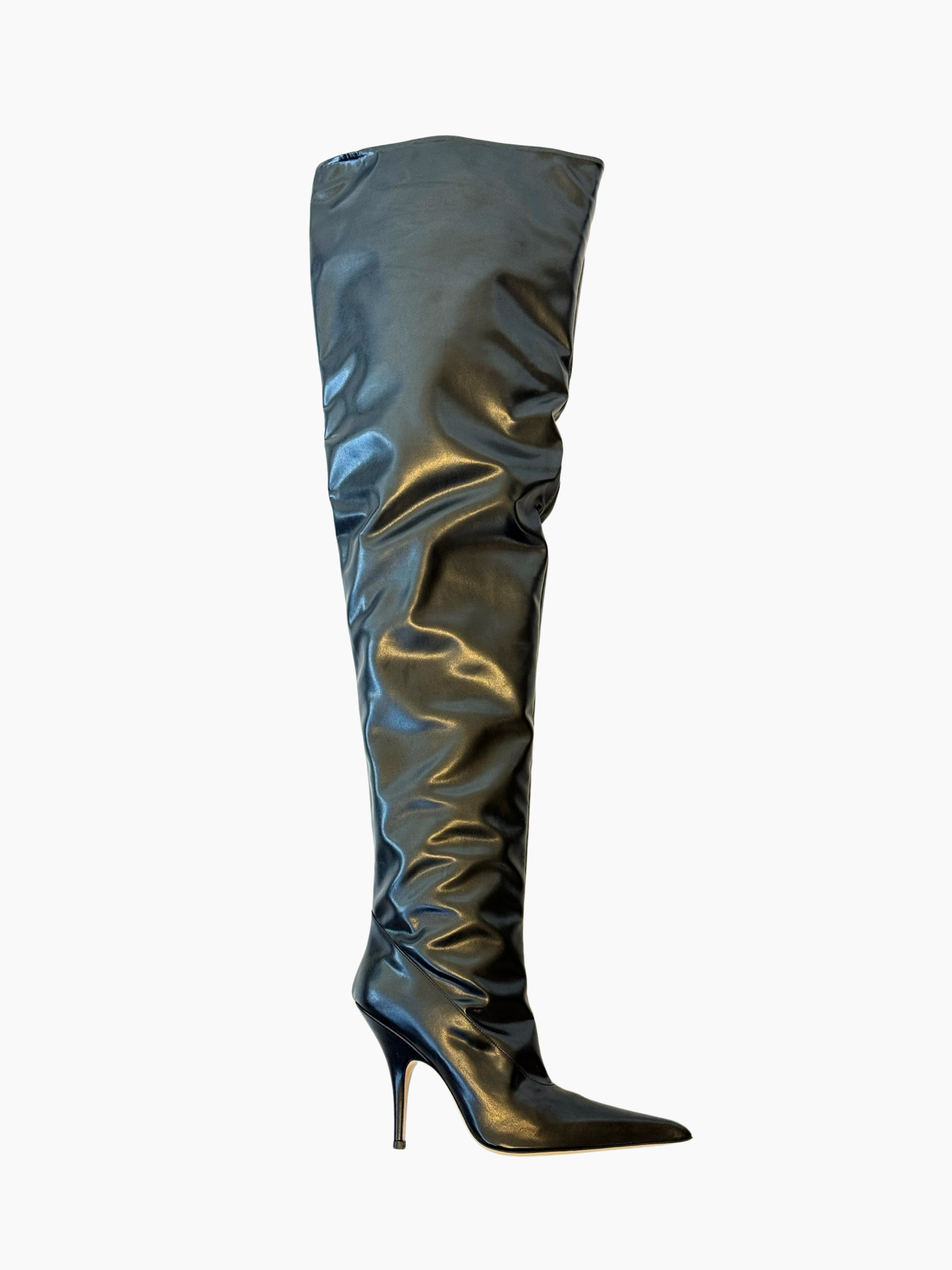 Stivali over-the-knee firmati Gia Borghini dal design sensuale e audace. Realizzati in morbida pelle nera lucida, avvolgono la gamba con una linea aderente e fluida, enfatizzata dalla punta affusolata e dal tacco a spillo sottile. Un modello dallo stile deciso, ideale per aggiungere un tocco glamour e sofisticato a look da sera o outfit minimal dal carattere strong.