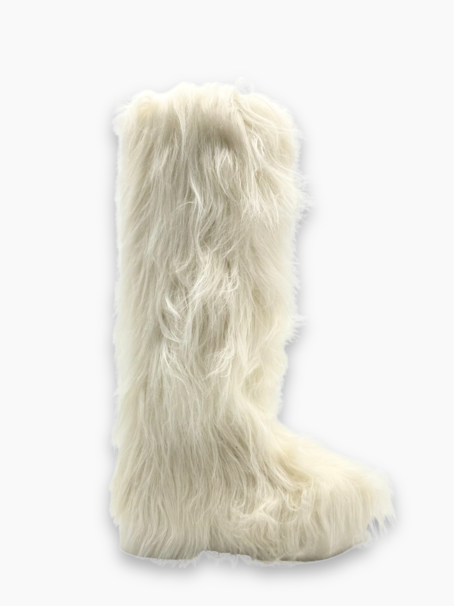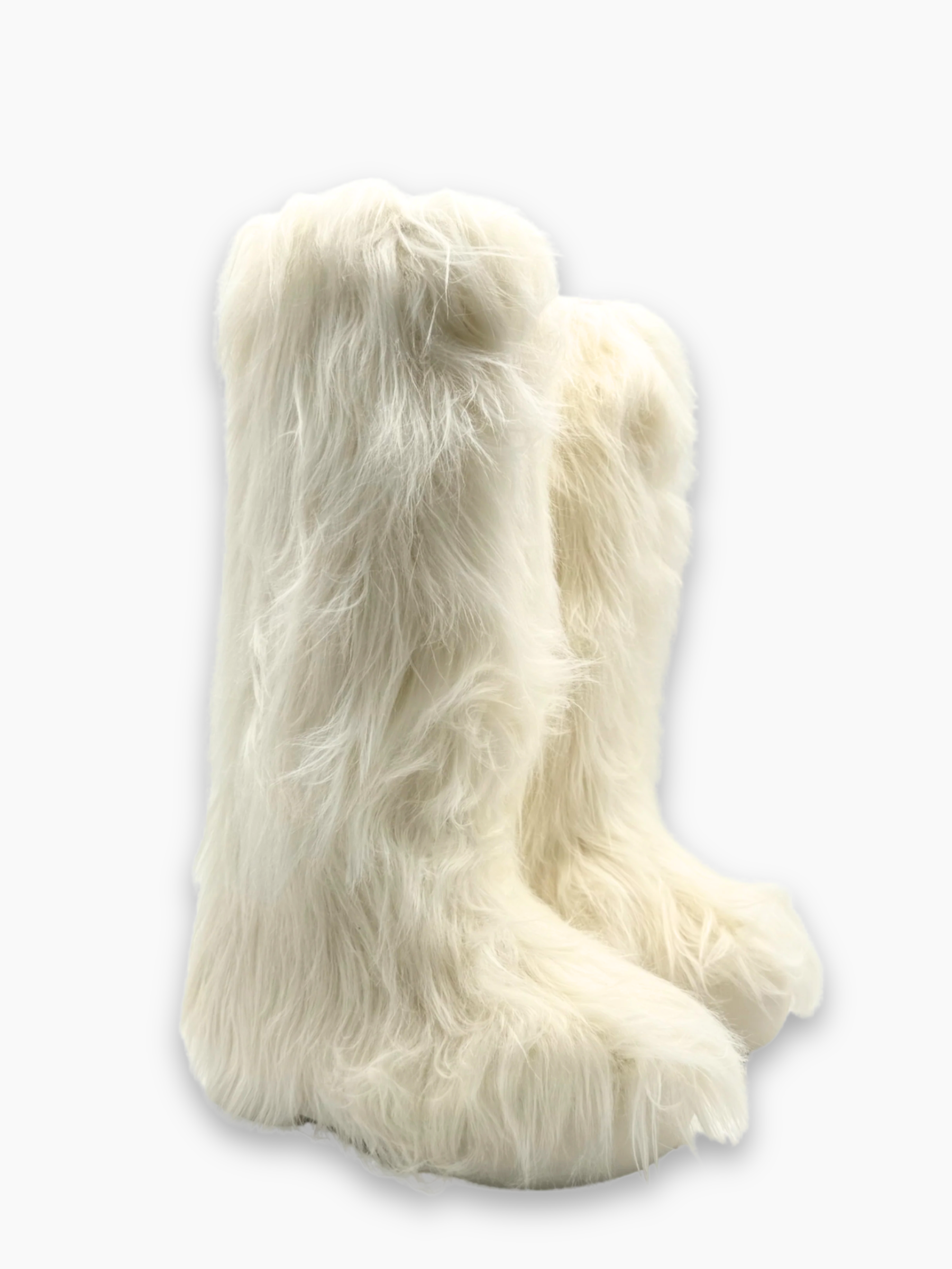 Gia Borghini boots with an original and dramatic design. Crafted from soft white faux fur, they're the perfect choice for those who want to stand out with a statement look. The high shaft and oversized silhouette create a voluminous yet balanced effect, ideal for statement winter outfits.