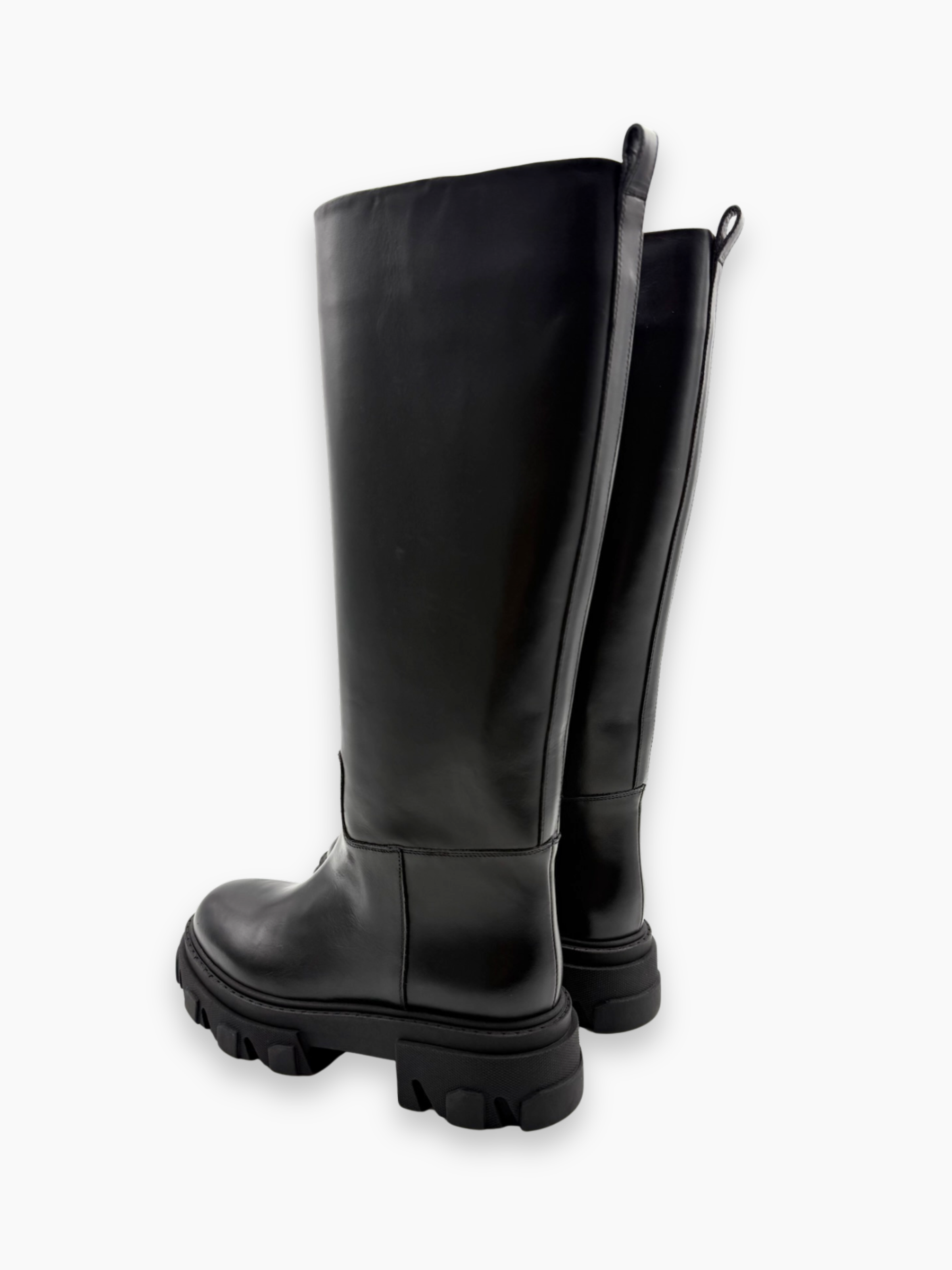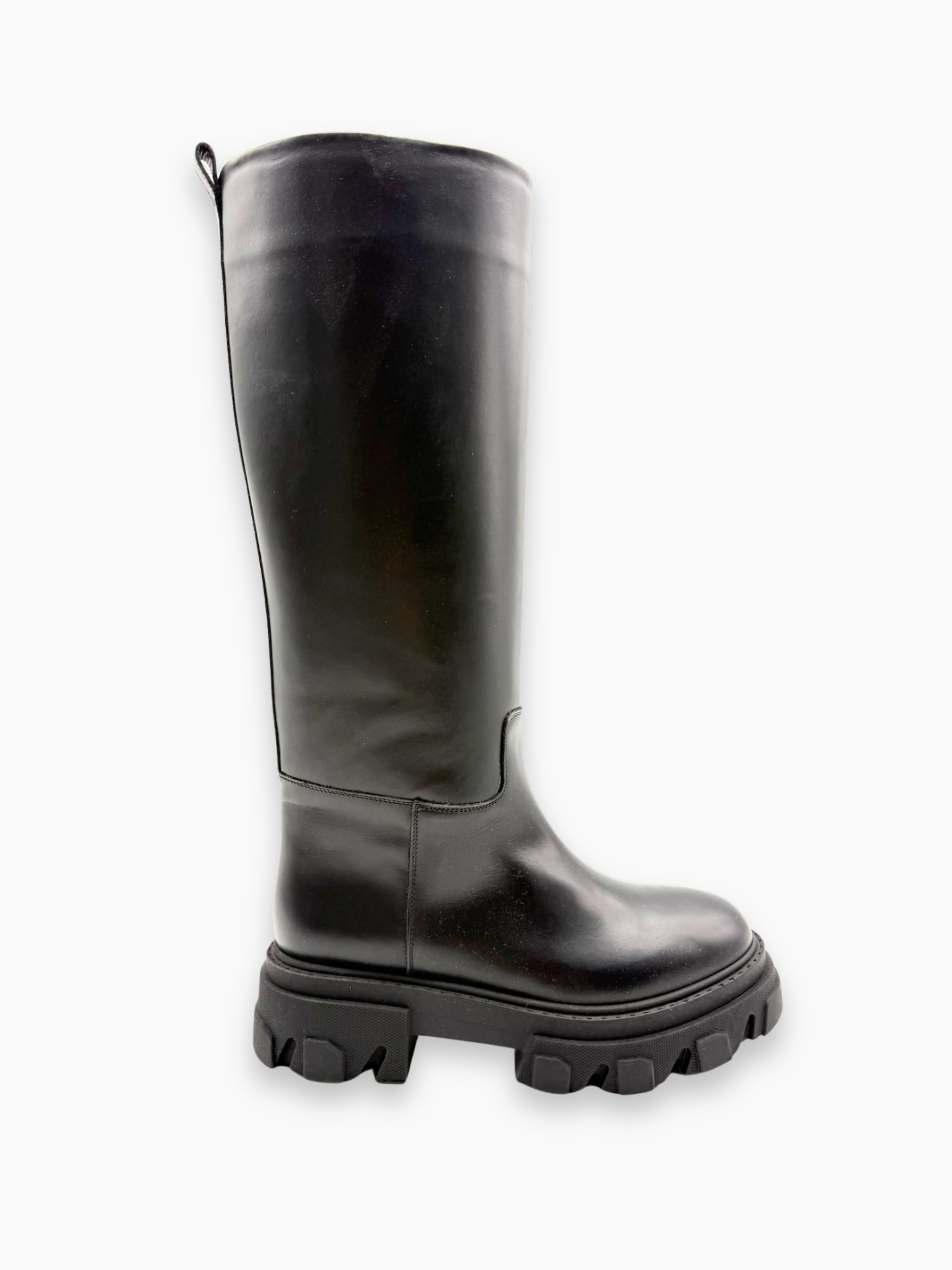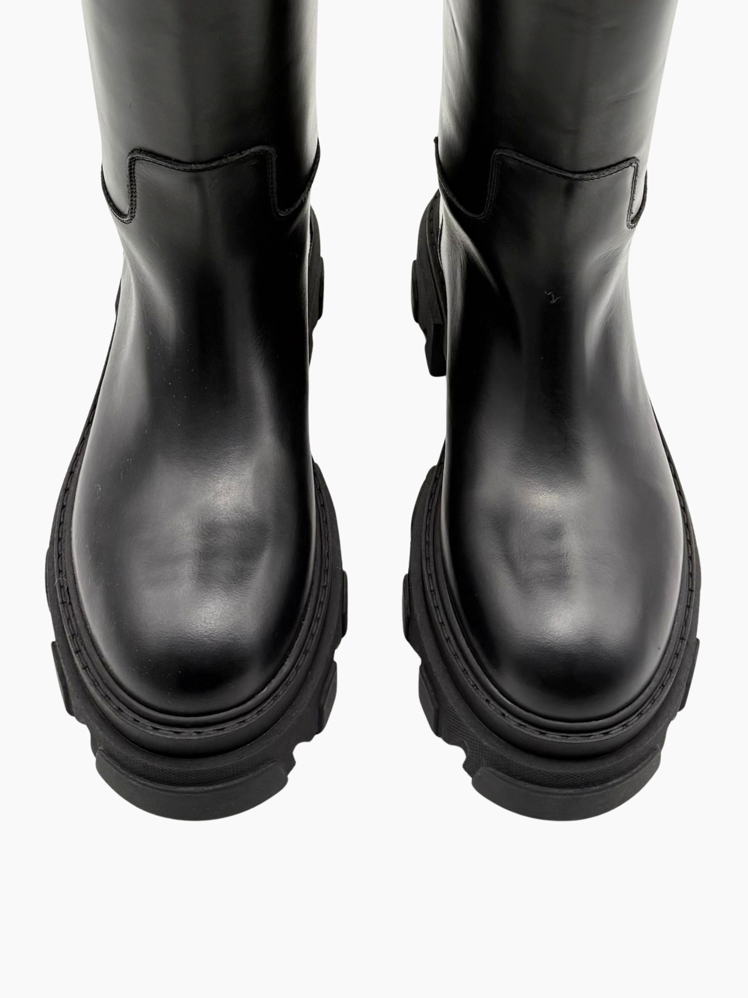 Stivali alti firmati Gia Borghini, realizzati in pelle nera con suola chunky in gomma. Il design minimal e contemporaneo, unito alla struttura robusta e al comfort della calzata, li rende perfetti per affrontare la stagione con stile e personalità.