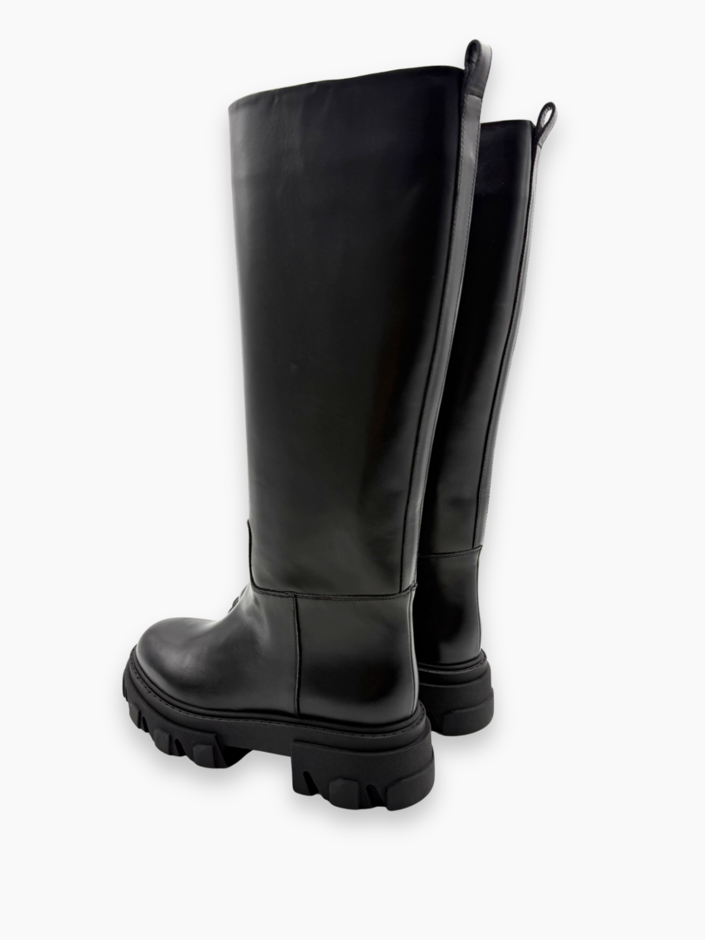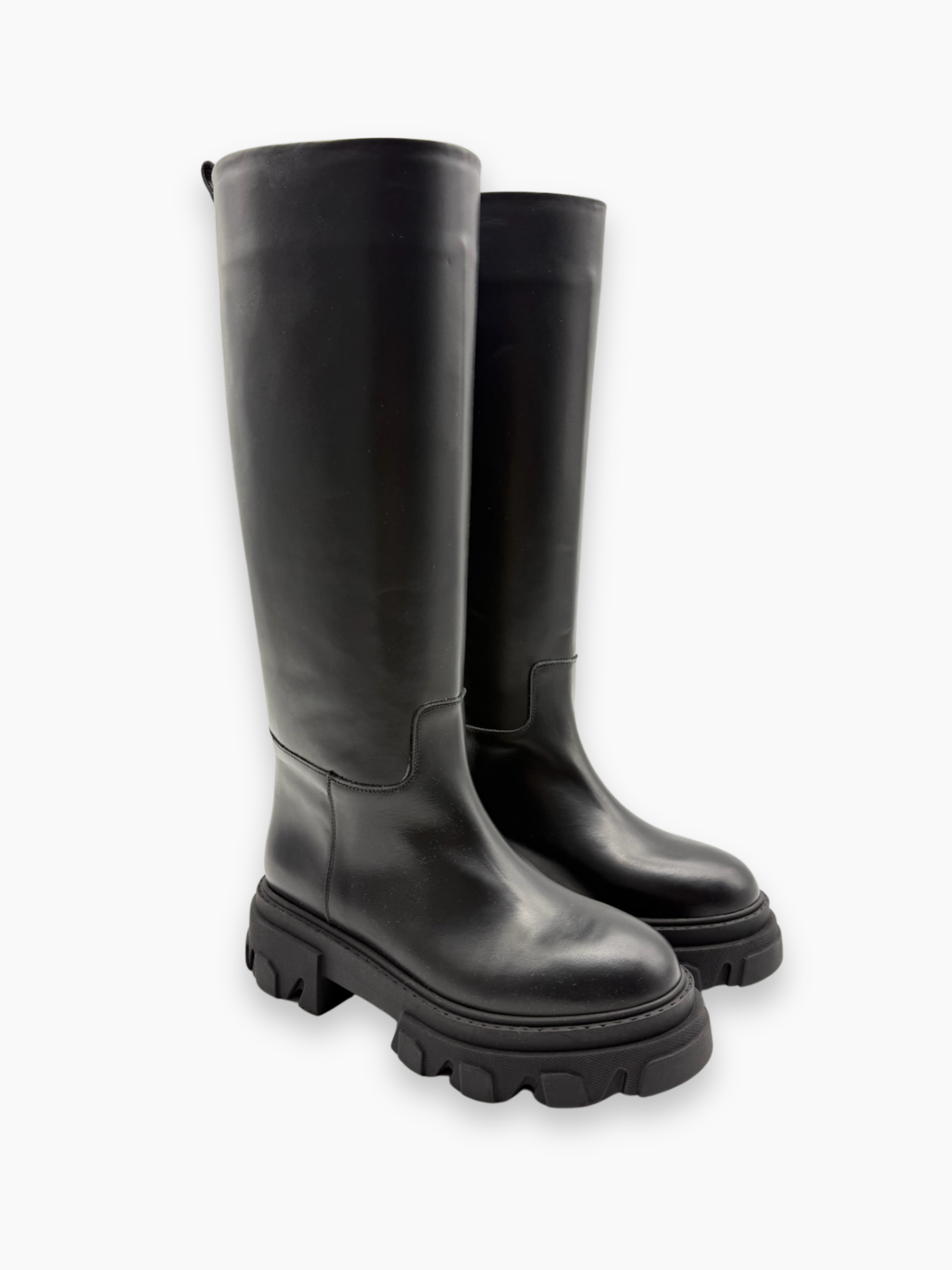 Gia Borghini thigh-high boots in black leather with chunky rubber soles. The minimalist, contemporary design is enhanced by clean lines and a sturdy construction, perfect for a bold, modern look. Ideal for pairing with both mini dresses and oversized outerwear.