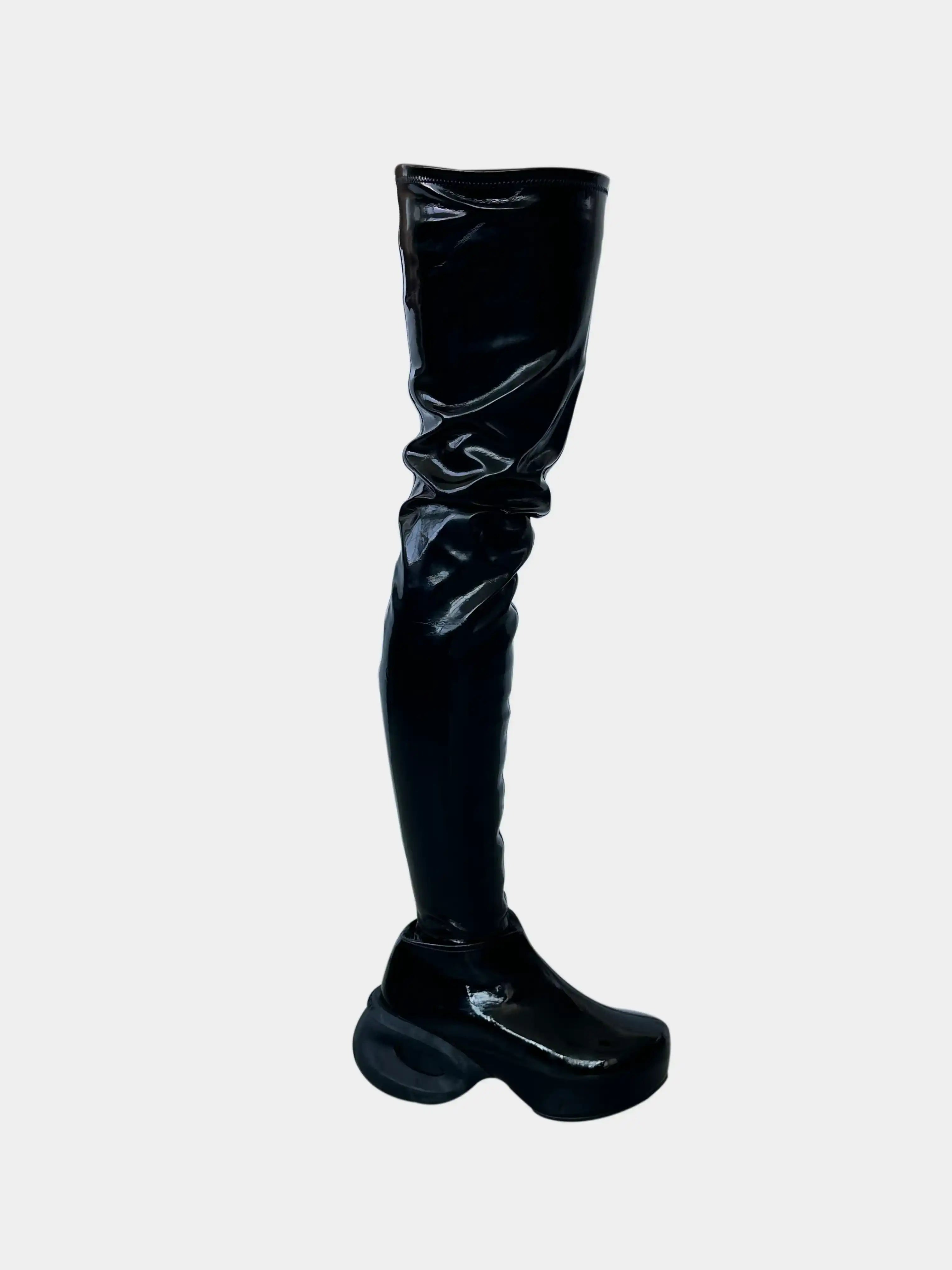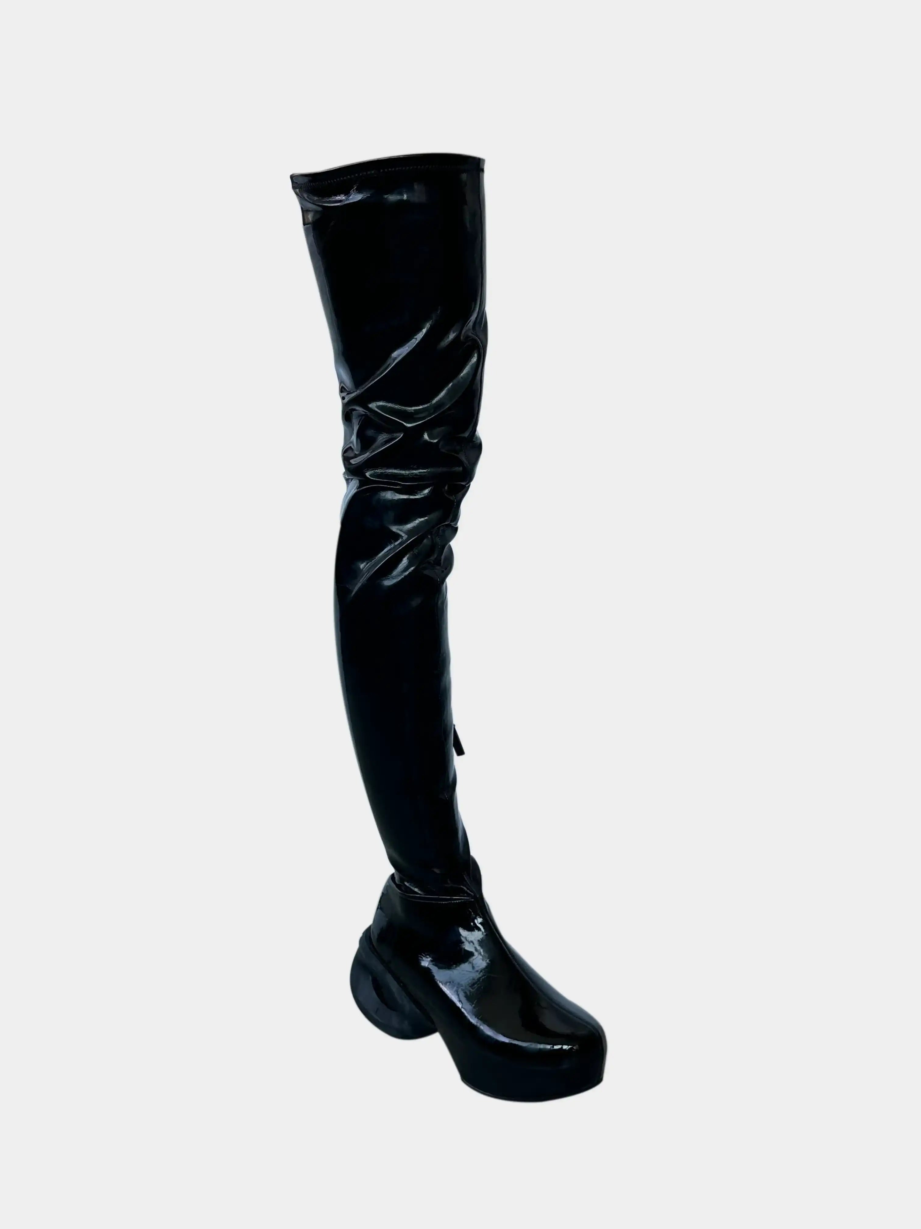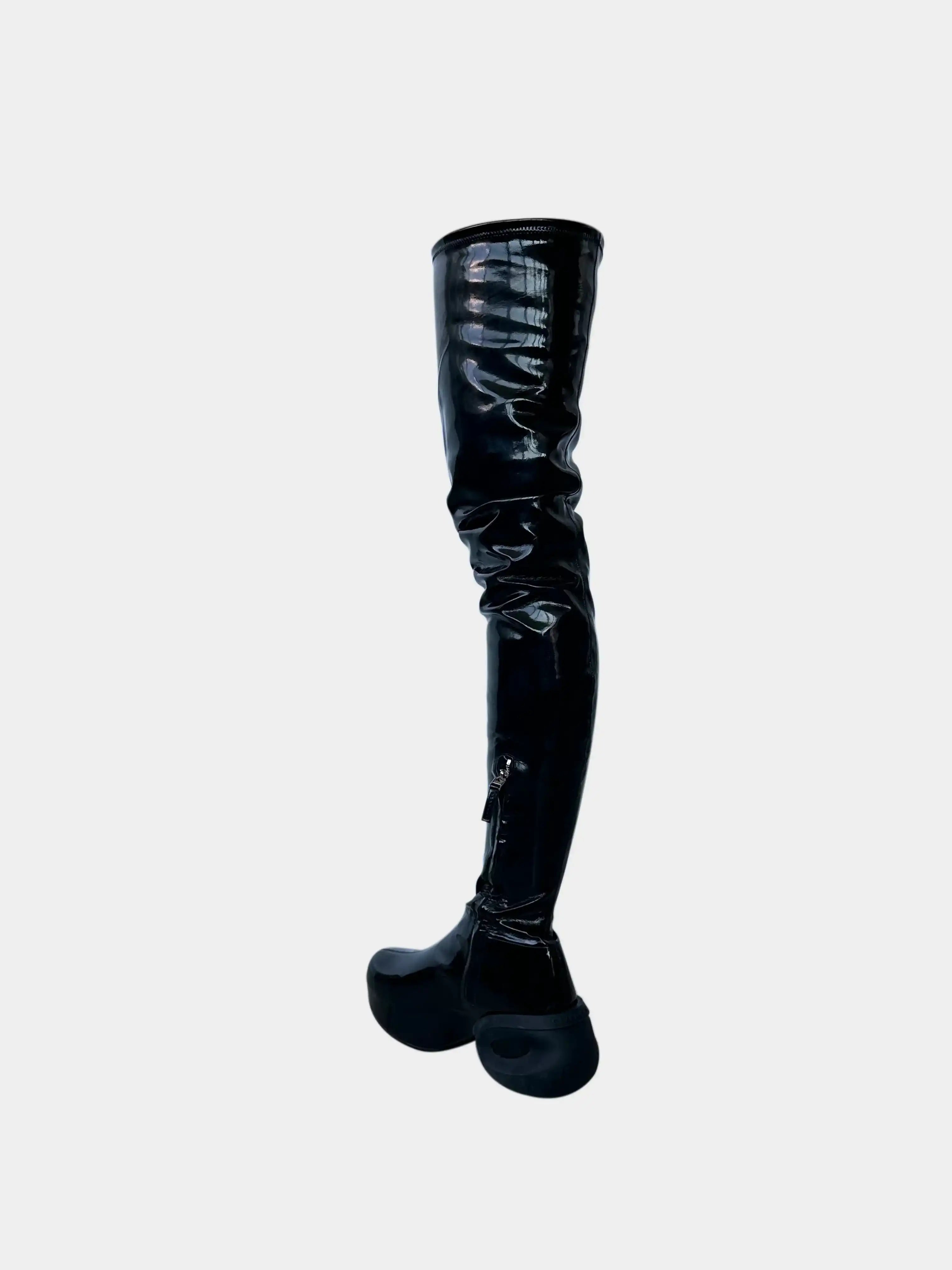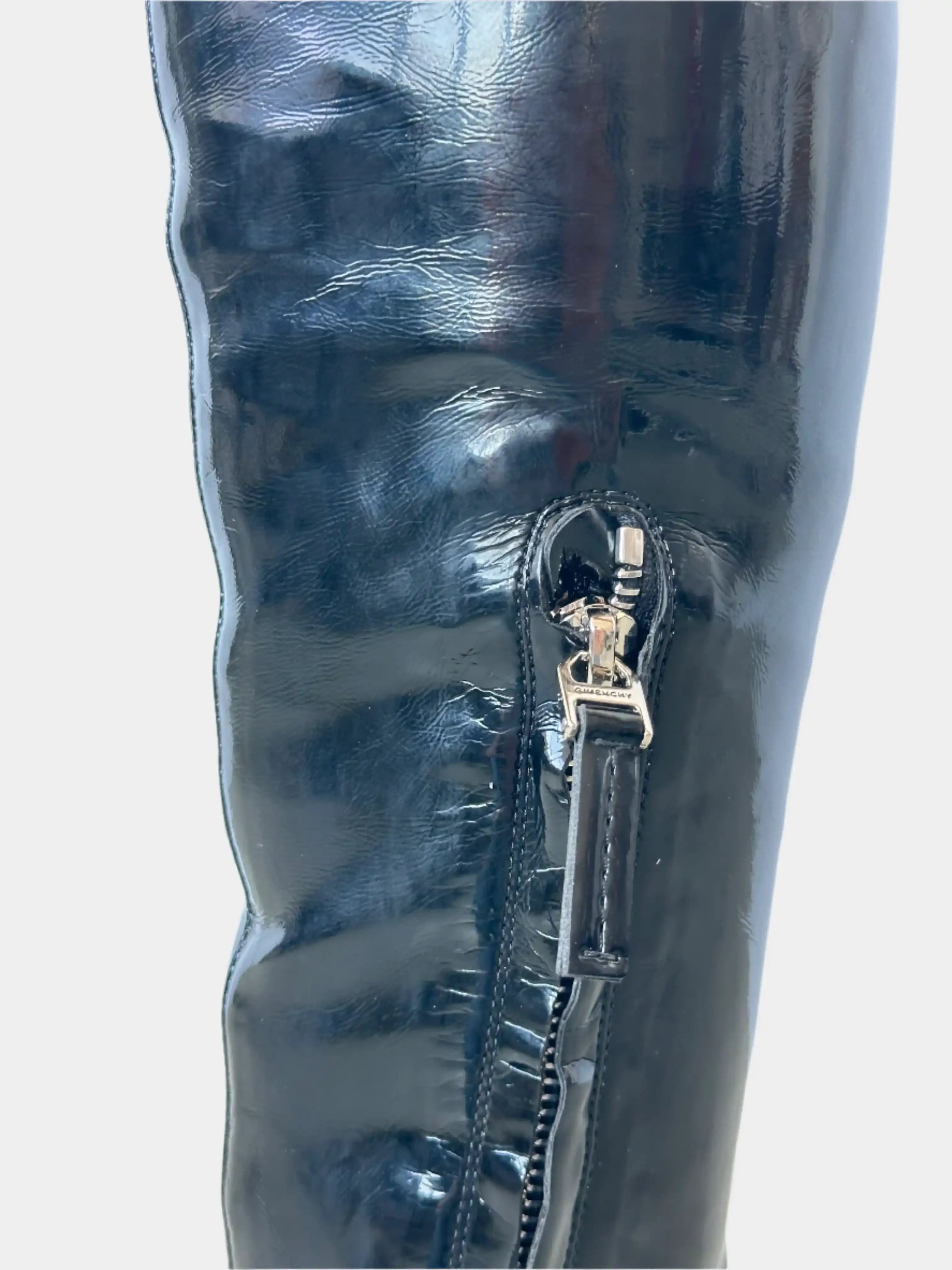 These Givenchy flat boots are the perfect fusion of boldness and contemporary style. Crafted from shiny black patent leather, they are designed to wrap around the leg up to the thigh with a slim and elegant silhouette. The chunky sculpted sole, with a futuristic design, adds a touch of originality and character to the look. Side zip with logo zip puller and made in Italy details underline their sartorial quality.