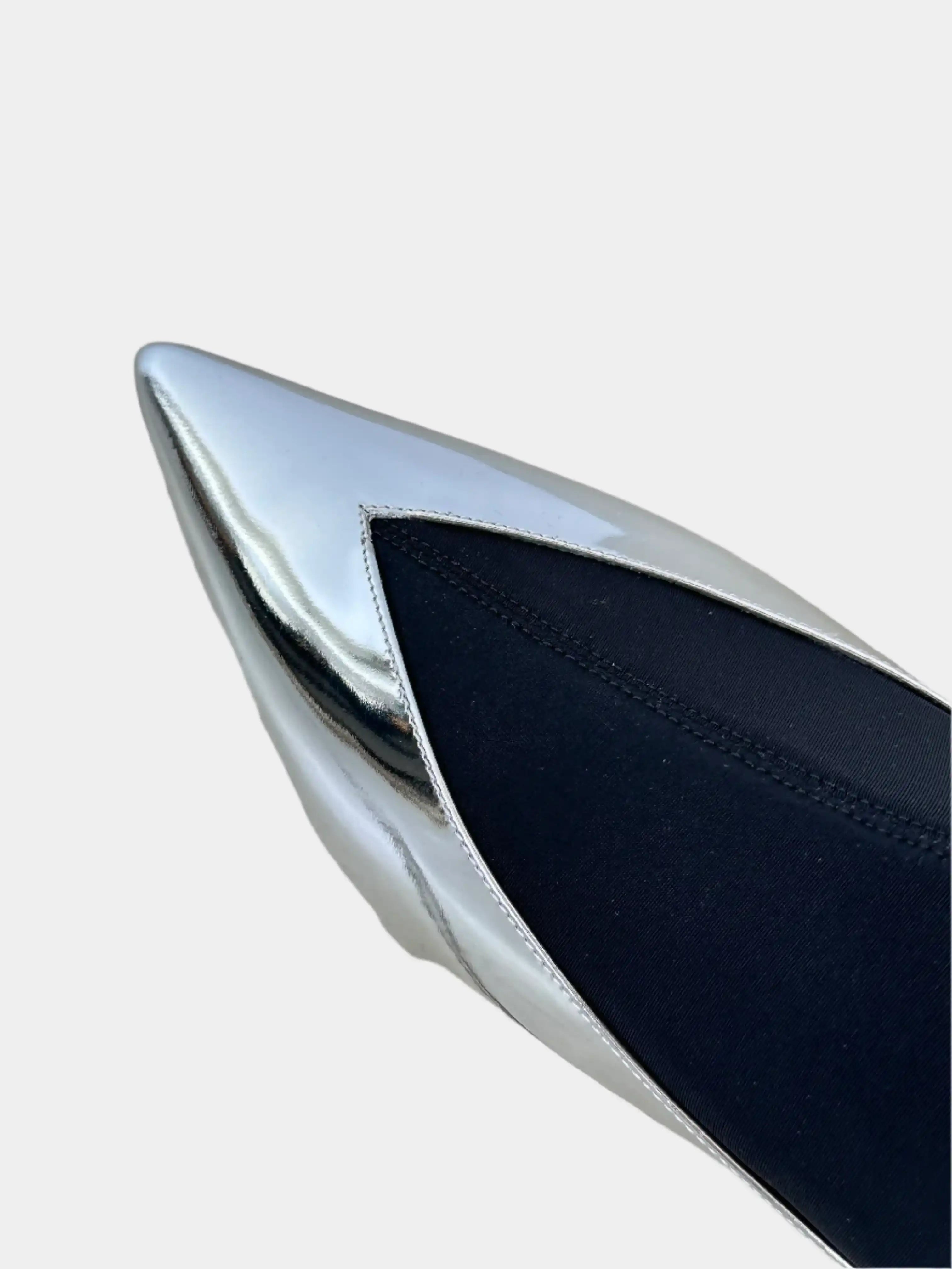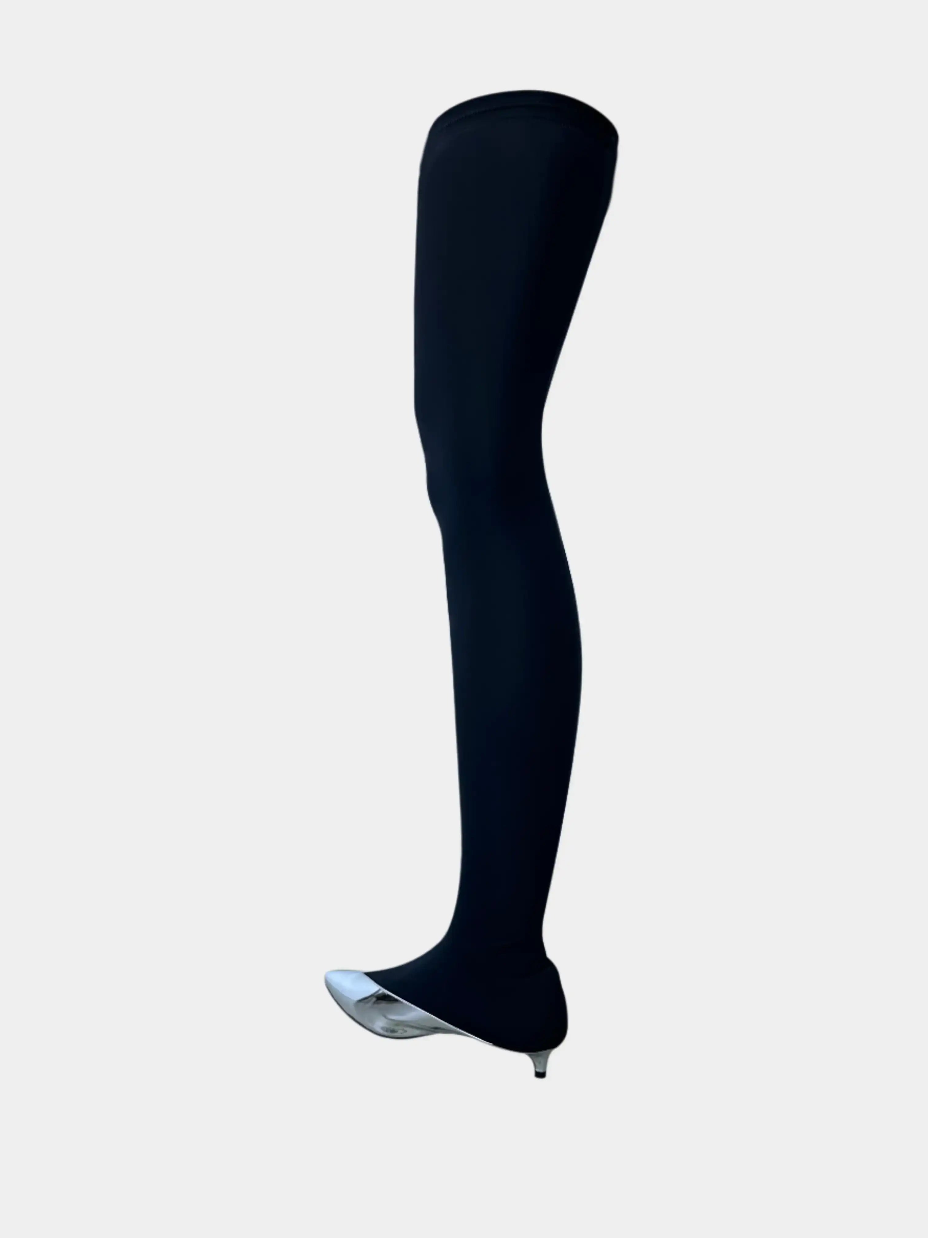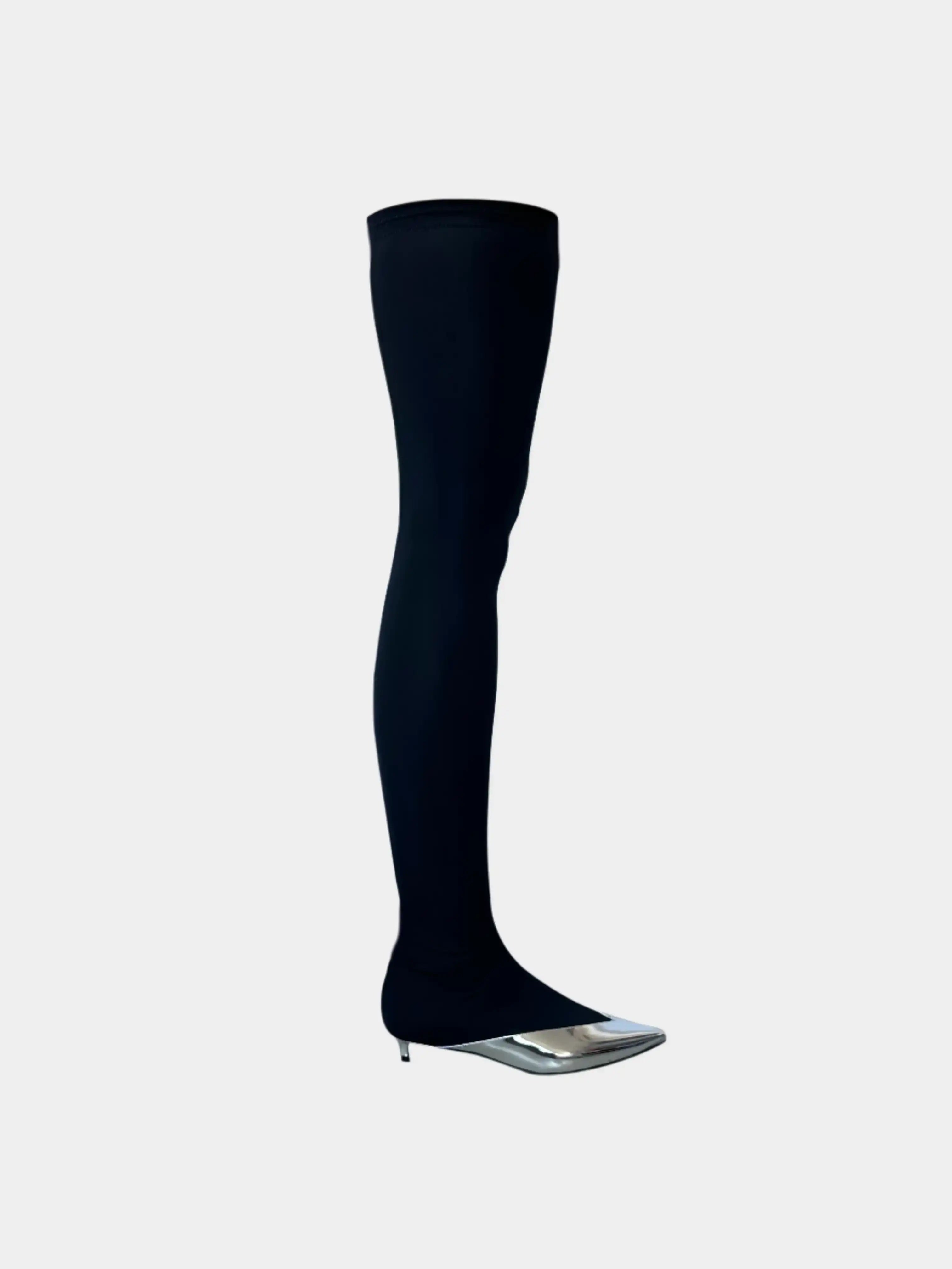 Bold and futuristic, the Show Over The Knee boot by Givenchy stands out for its sharp mirror-like tip in shiny silver. The black stretch fabric sock-effect shaft elegantly adheres to the leg, creating a perfect contrast with the metallic aesthetic of the front part. Designed for those who love to be noticed, these boots combine the comfort of a stretch fit with the decisive character of a high-shine detail. Made in Italy.