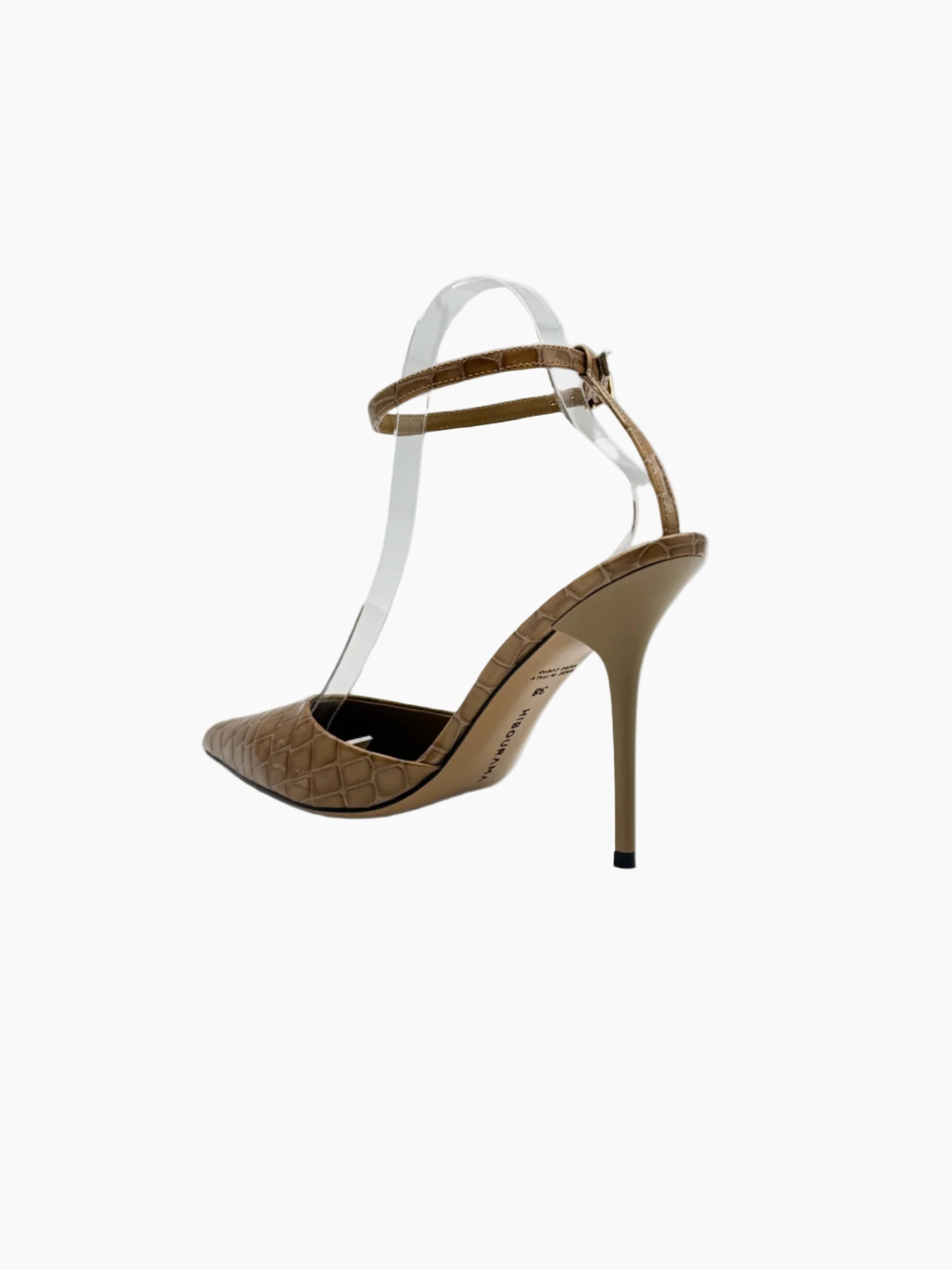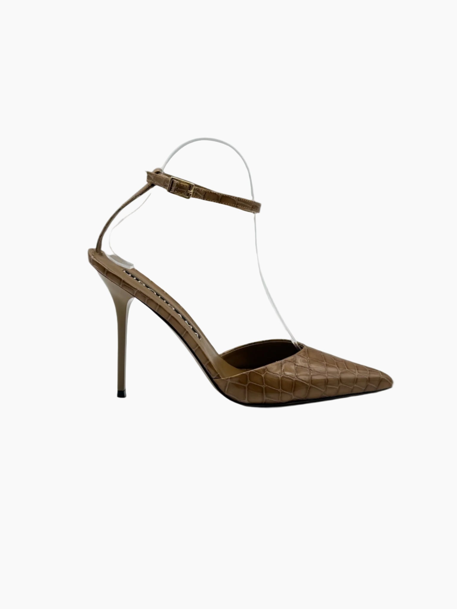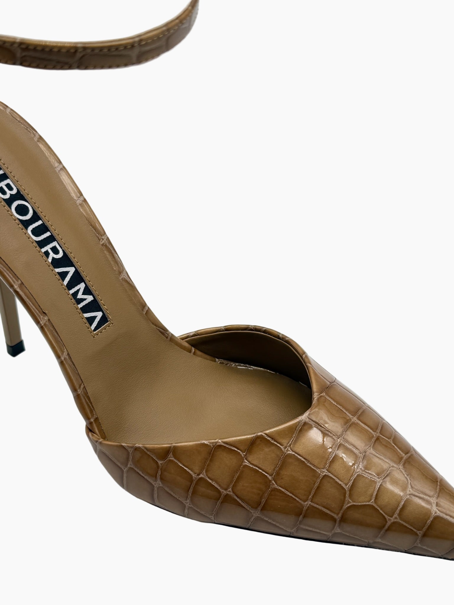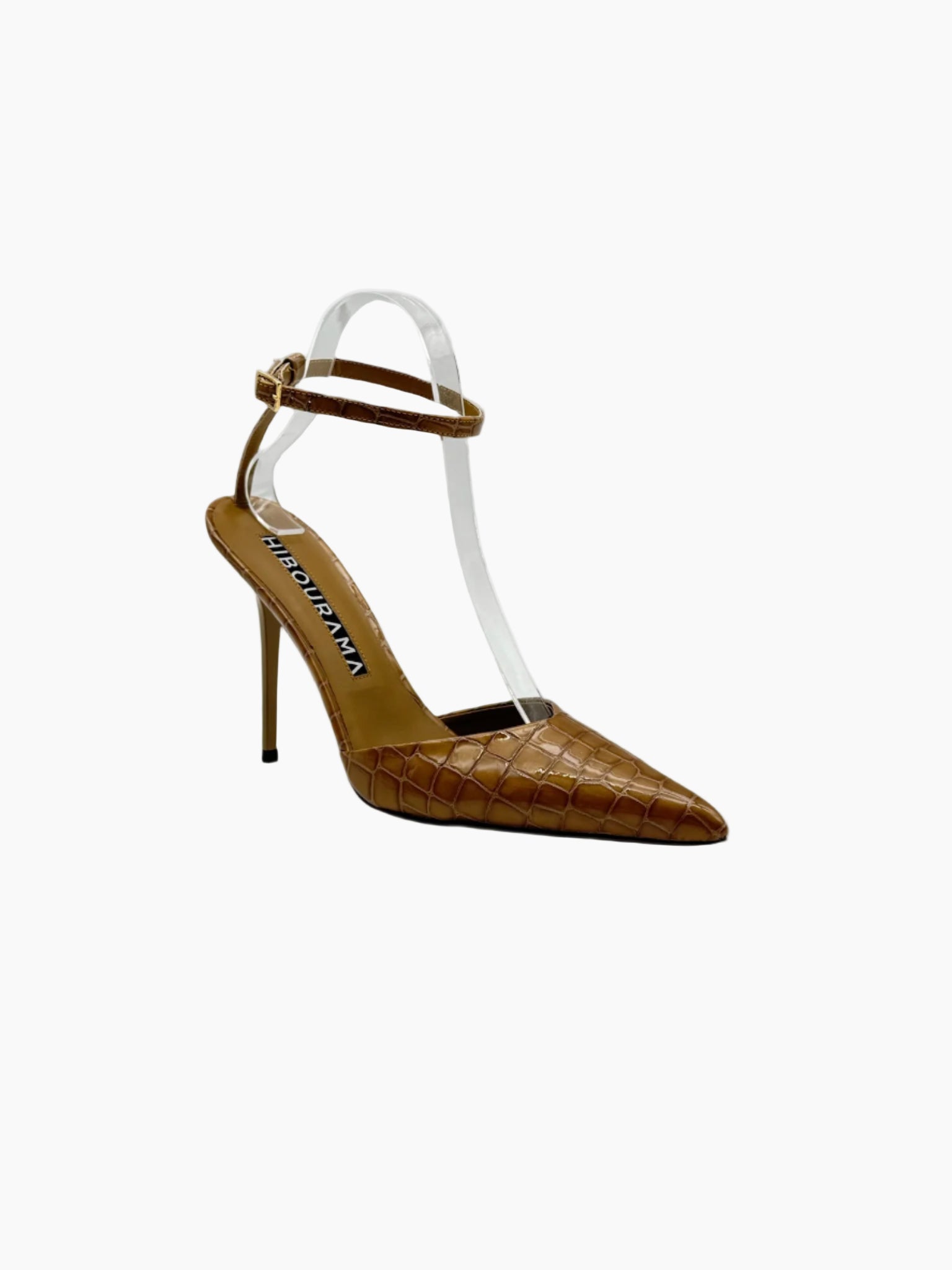 Elegant and tapered, these beige pumps from Hibourama strike the perfect balance between femininity and character. The crocodile-effect texture adds a sophisticated yet bold touch, while the thin ankle strap accentuates the leg. A slender stiletto heel completes this style, designed for evening looks or special occasions.