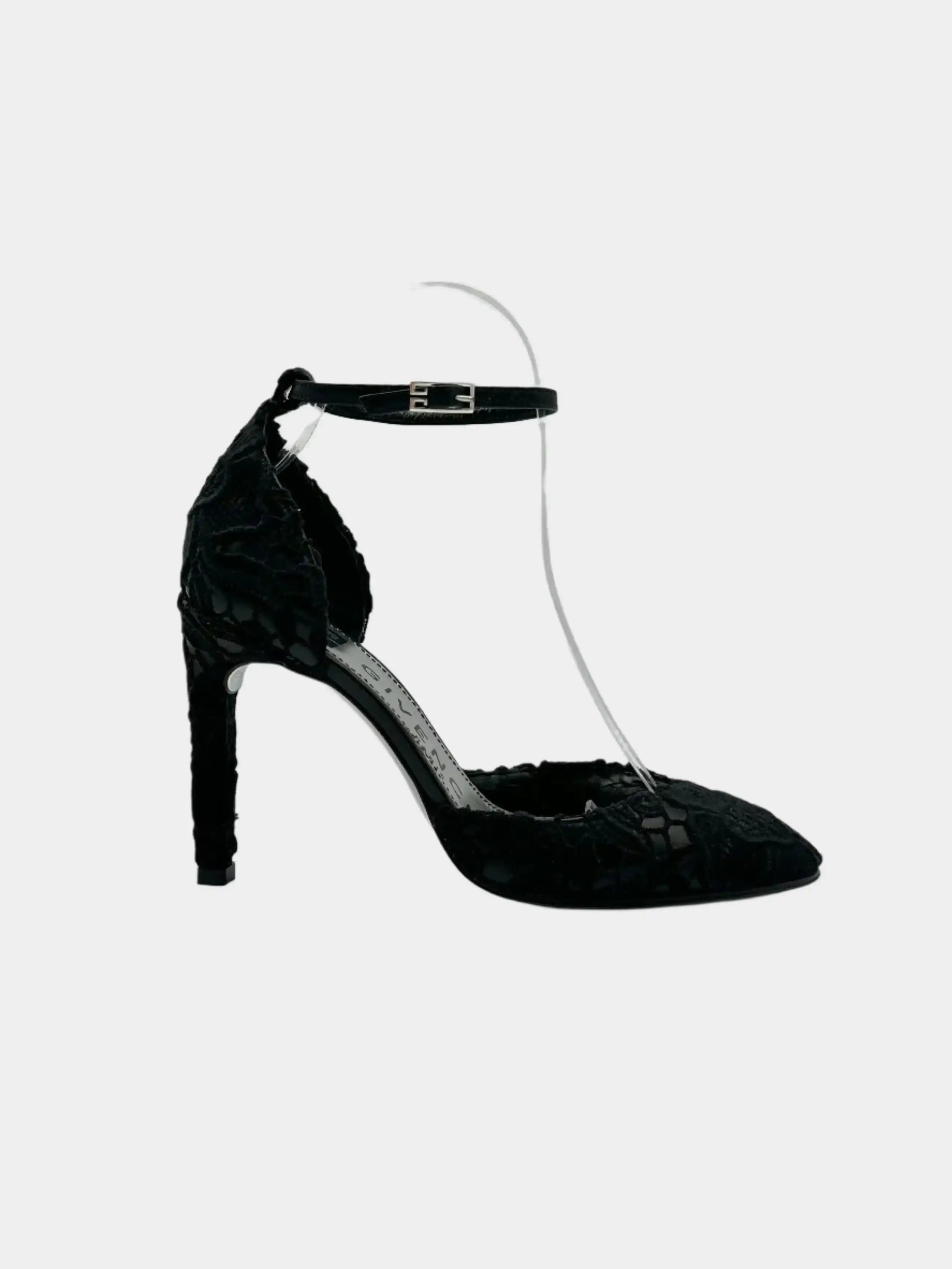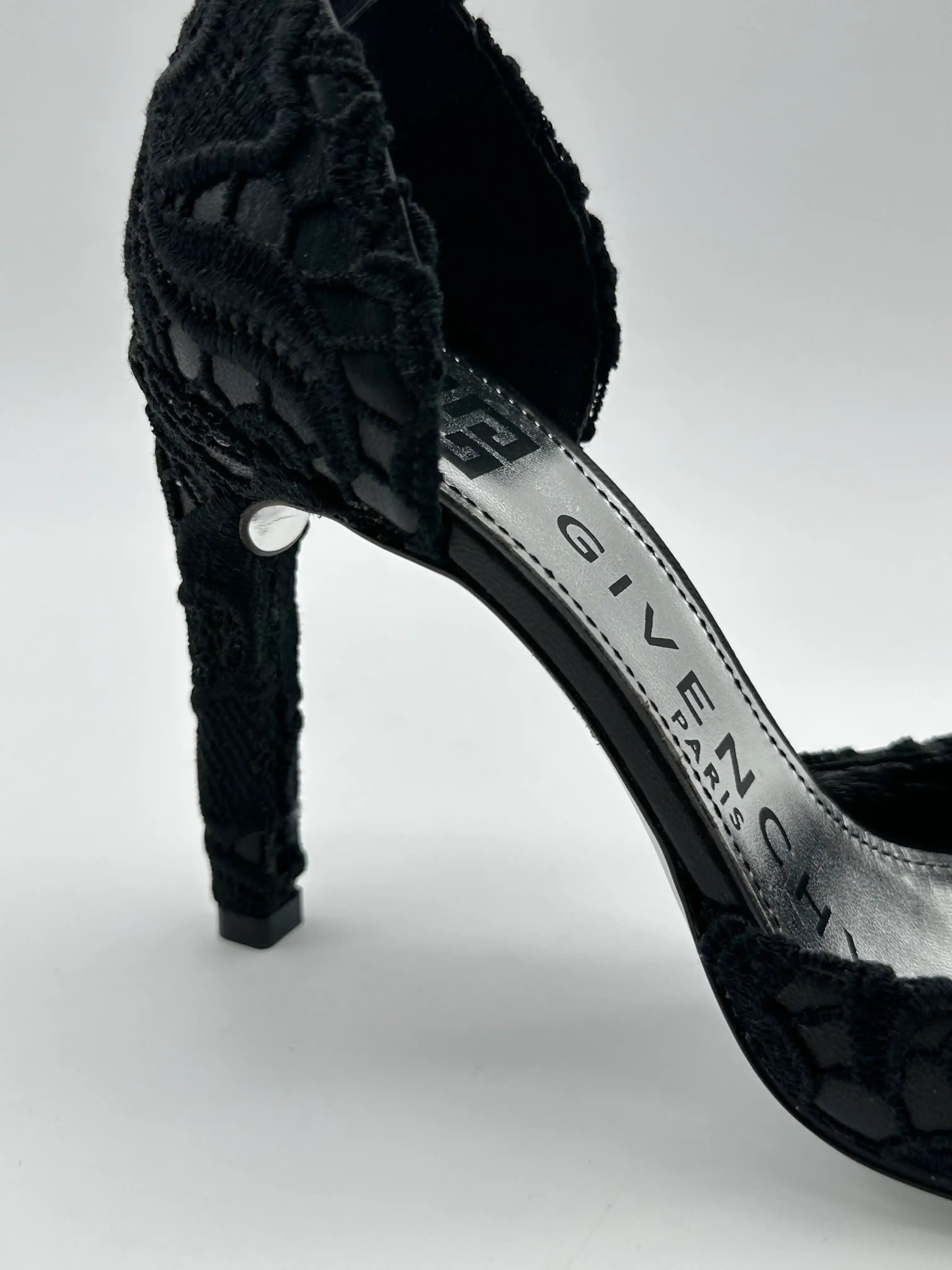 Elegant pumps by Givenchy, crafted from refined black lace with a floral motif. The tapered silhouette with a closed toe is embellished with a thin ankle strap, for a secure and feminine fit. The covered stiletto heel completes the sophisticated design, ideal for evening events or formal occasions.