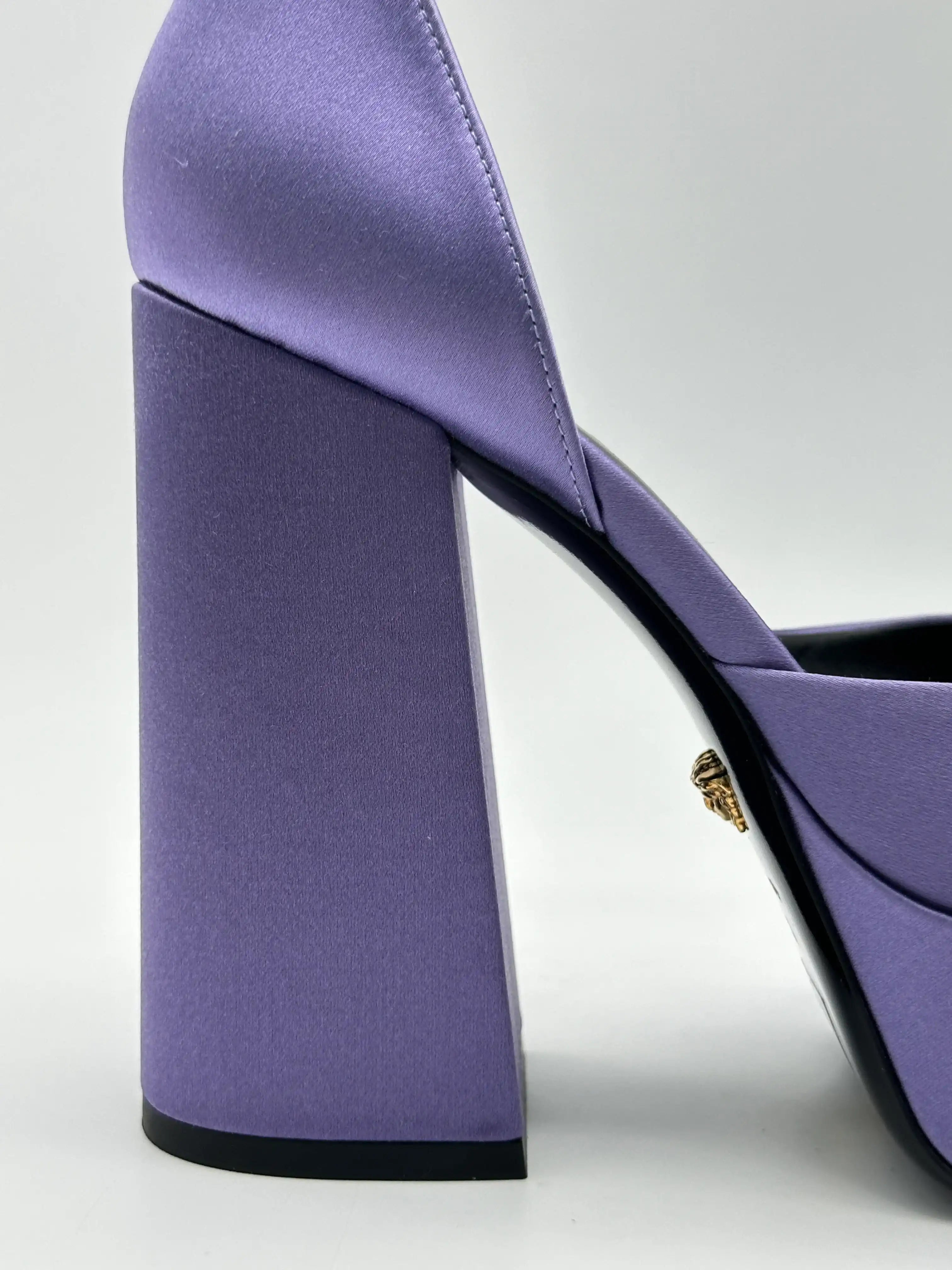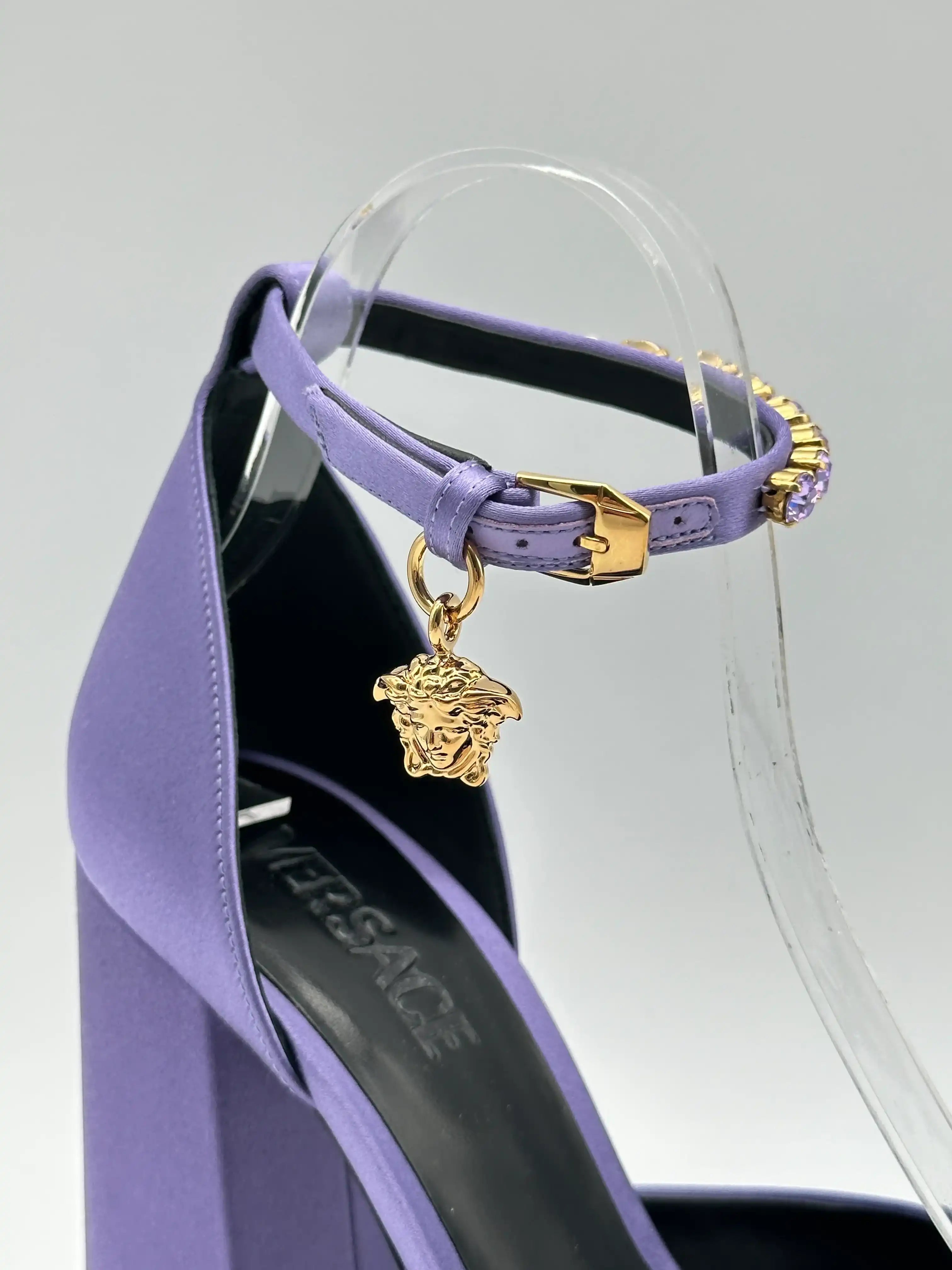 These lilac satin Versace pumps express the bold and glamorous nature of the house. The 12 cm block heel and platform design ensure a sleek and stable fit, while the adjustable ankle strap is embellished with tone-on-tone rhinestones and the iconic gold Medusa charm, the brand's unmistakable symbol. The rounded square toe adds a modern touch to an already striking style. Finished with a leather lining and sole, they are perfect for bold and sophisticated looks.
