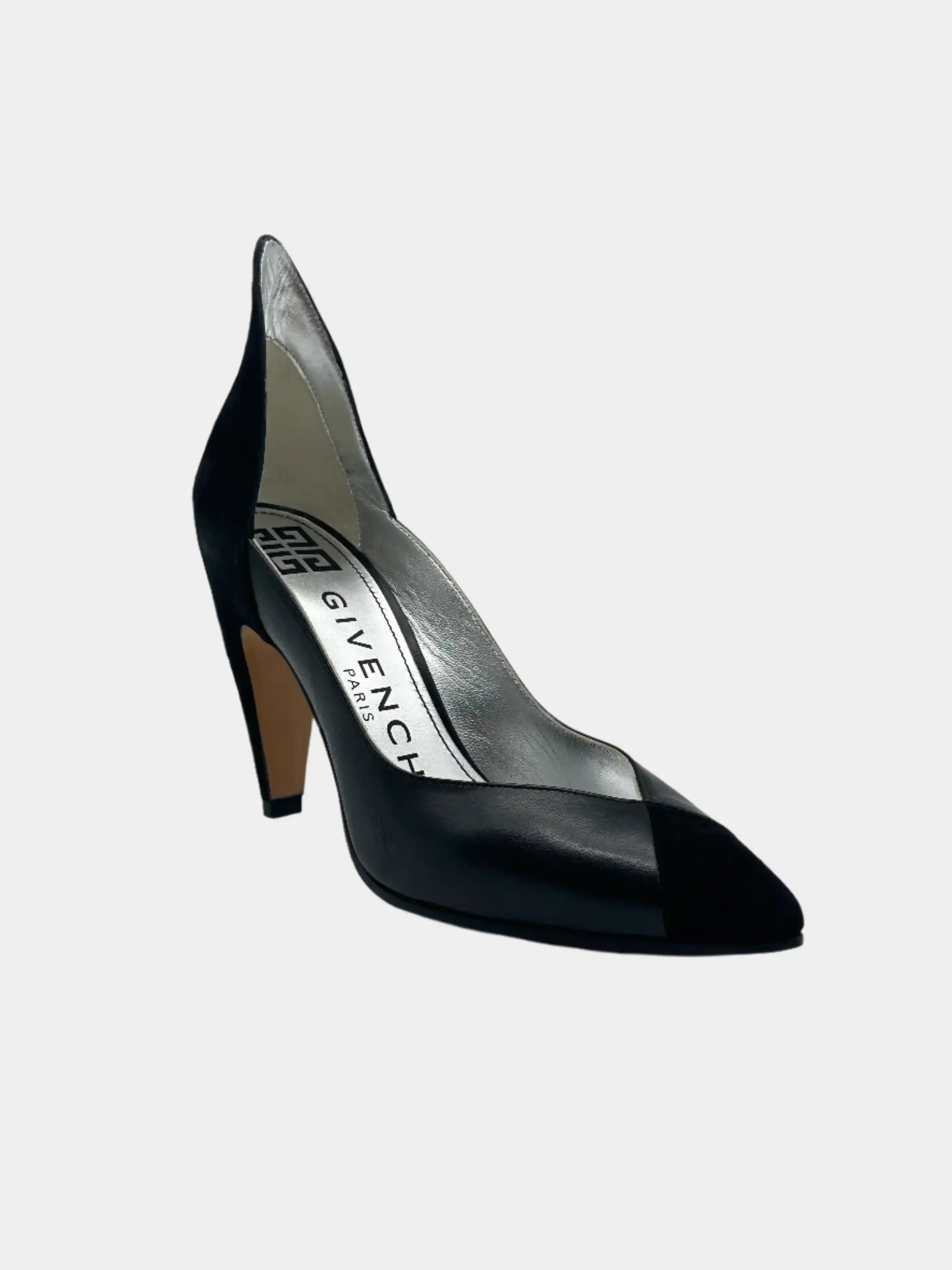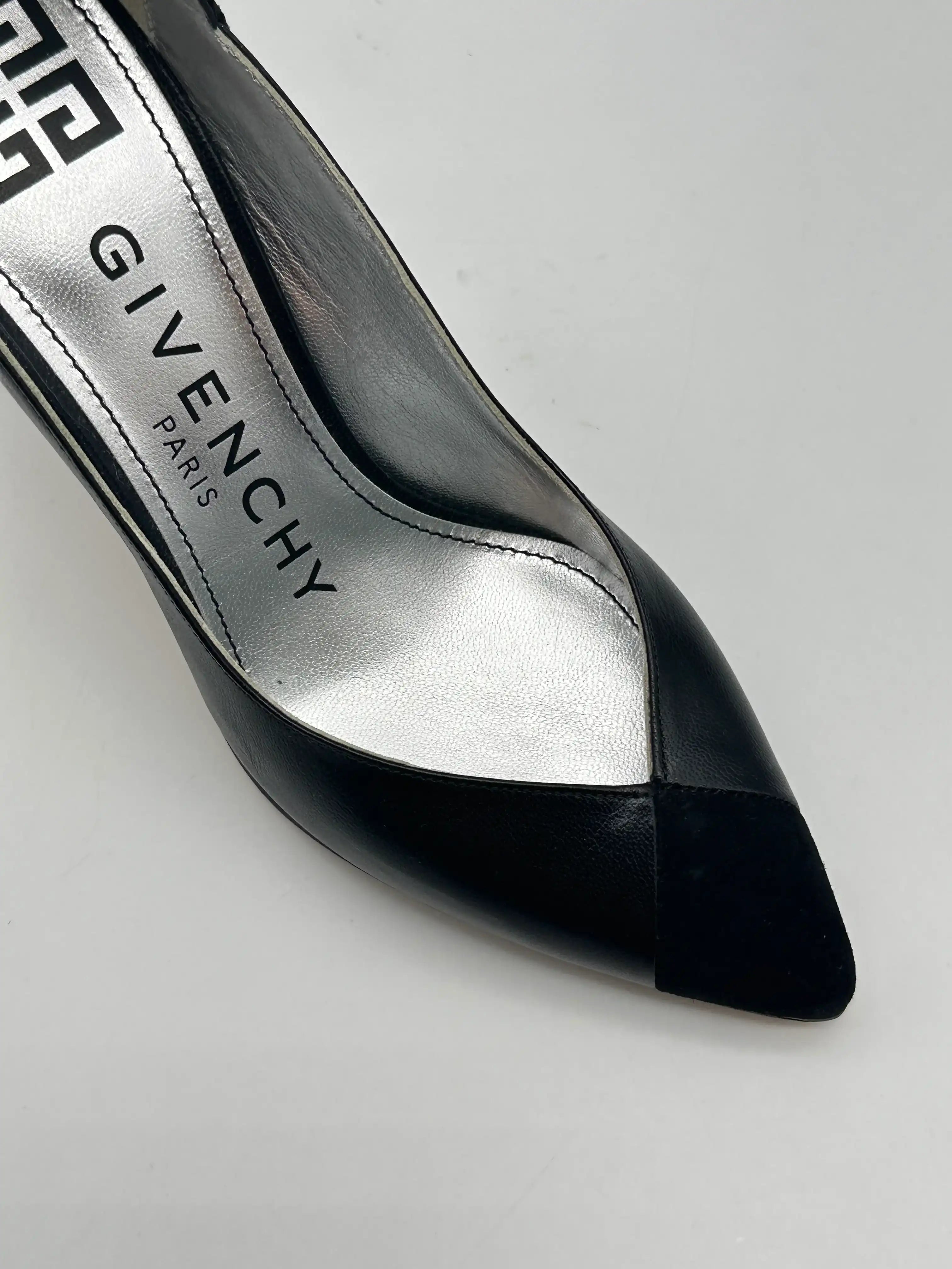 Elegant and distinctive, this black Givenchy pump with a sculptural heel combines smooth leather and suede inserts for a refined interplay of materials. The pointed profile and sculptural silhouette flatter the figure, while the metallic logo lining adds a luxurious and modern touch. A sophisticated model, ideal for completing evening or formal looks with character.