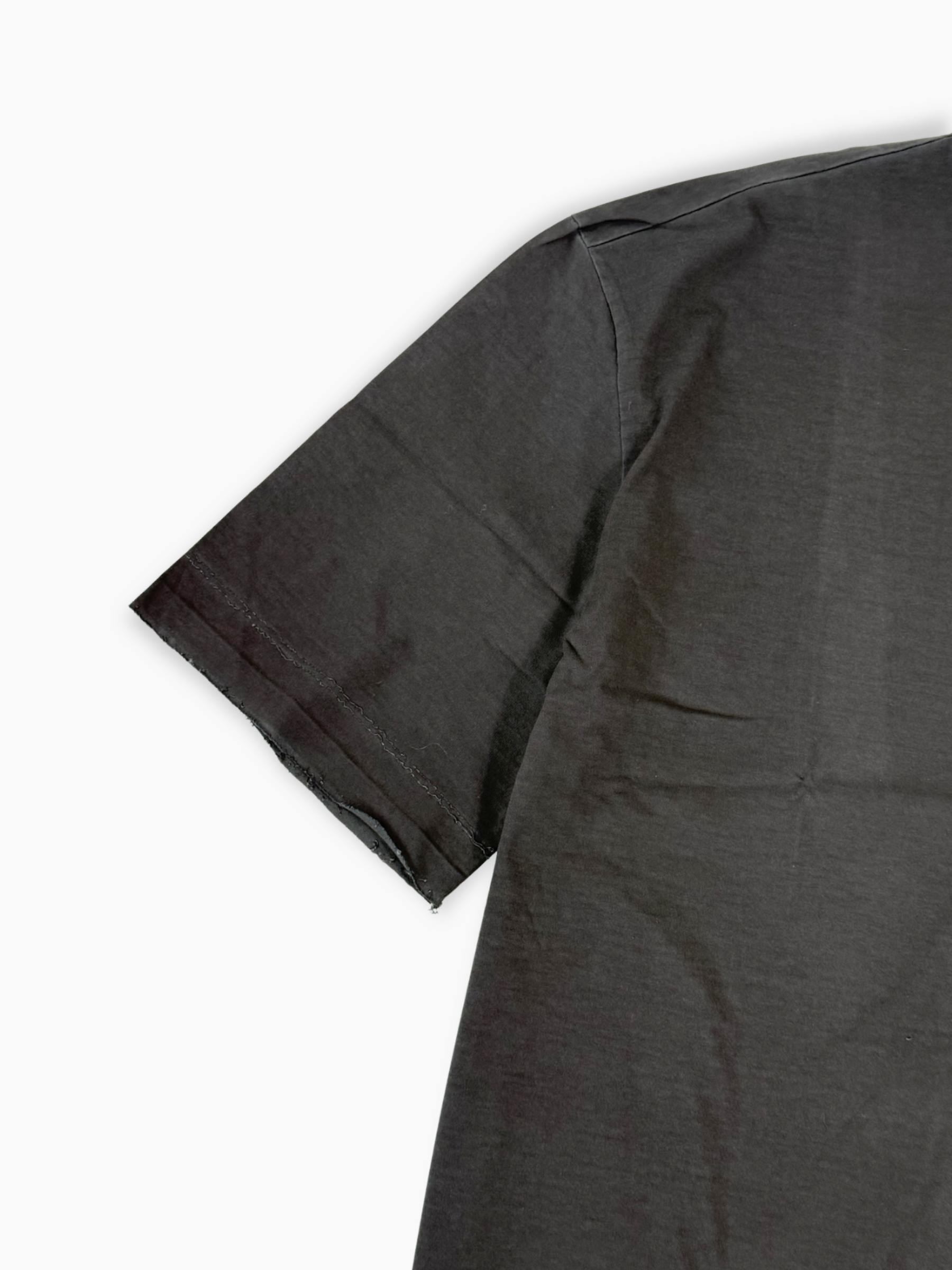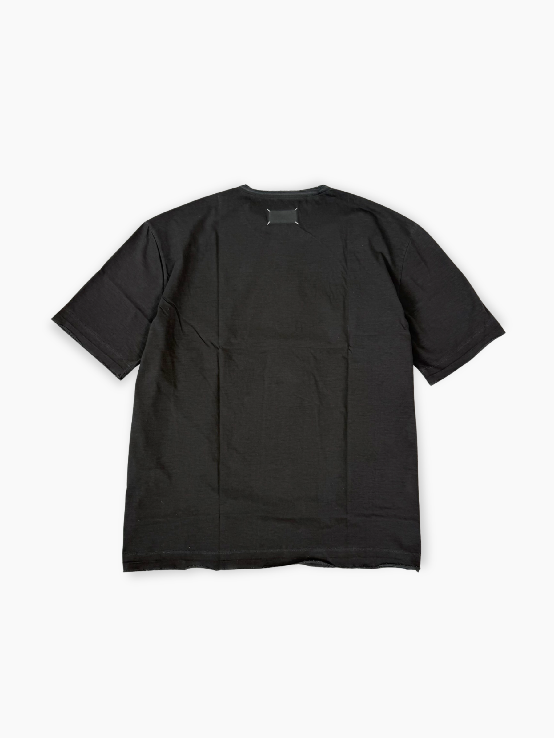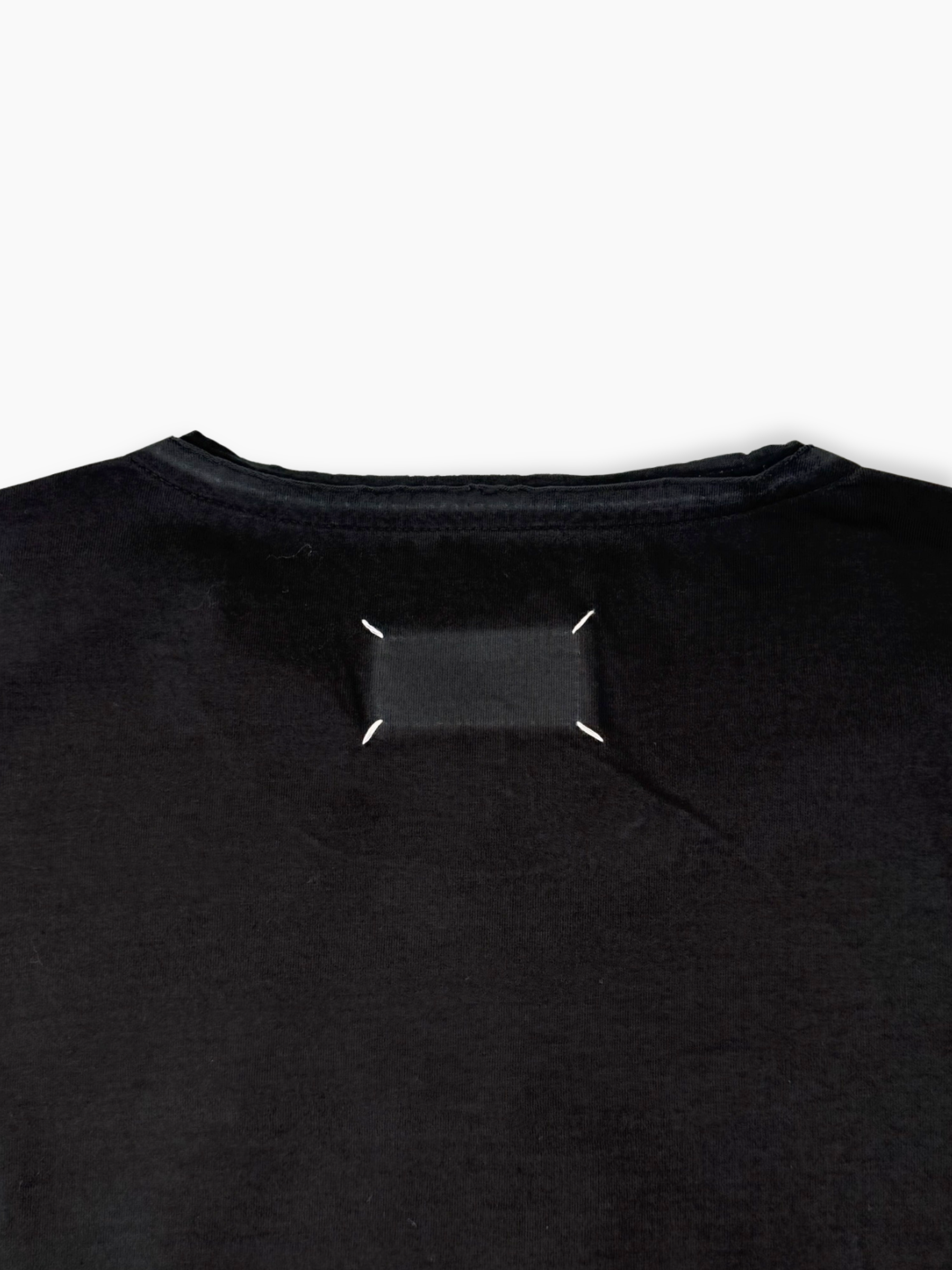 Maison Margiela black cotton T-shirt with a clean cut and raw-cut hem. A minimal yet iconic piece, it features a white label sewn onto the back of the neck, a distinctive symbol of the house. Versatile and contemporary, it's ideal for completing casual and urban looks with a refined touch.