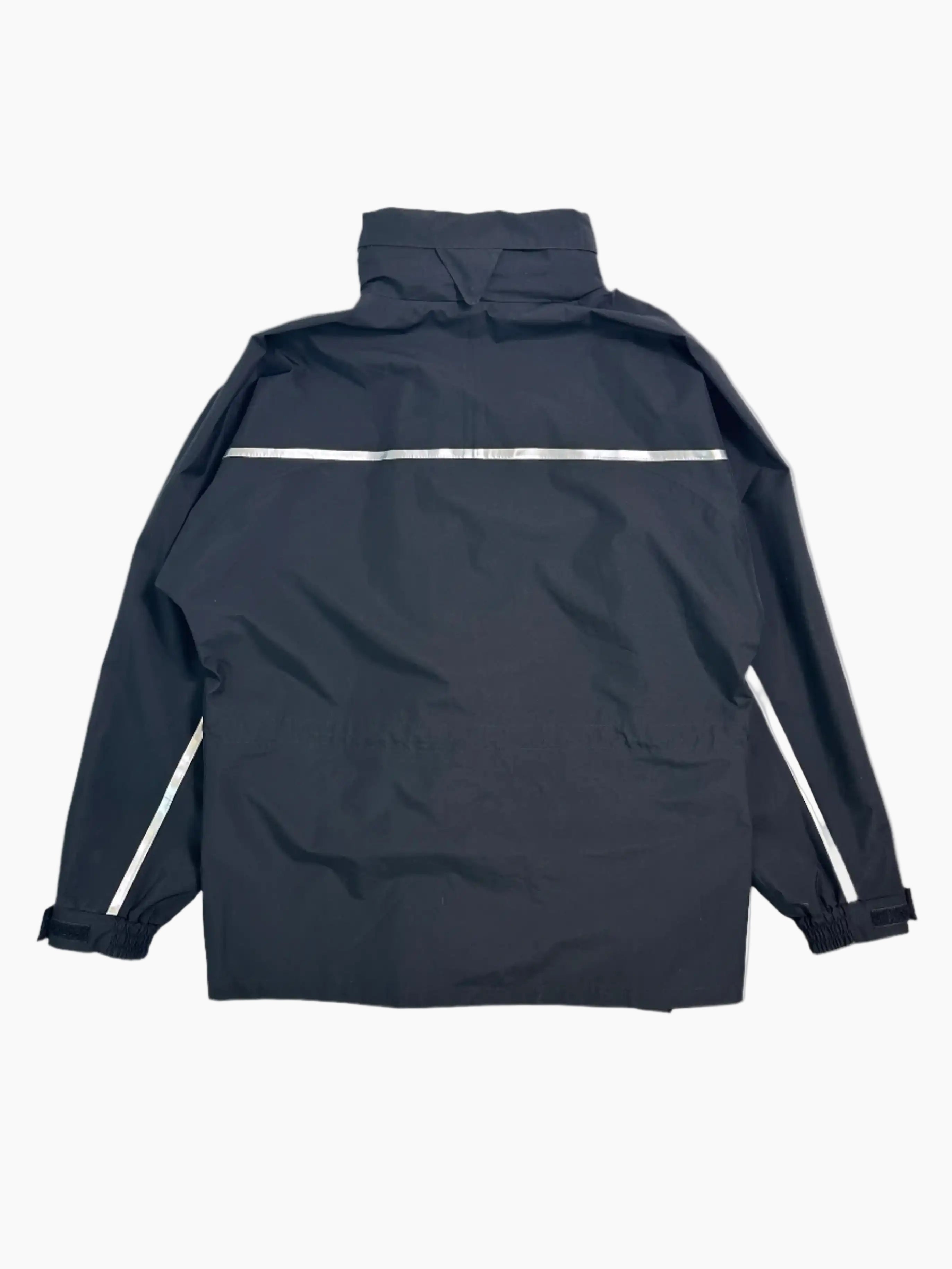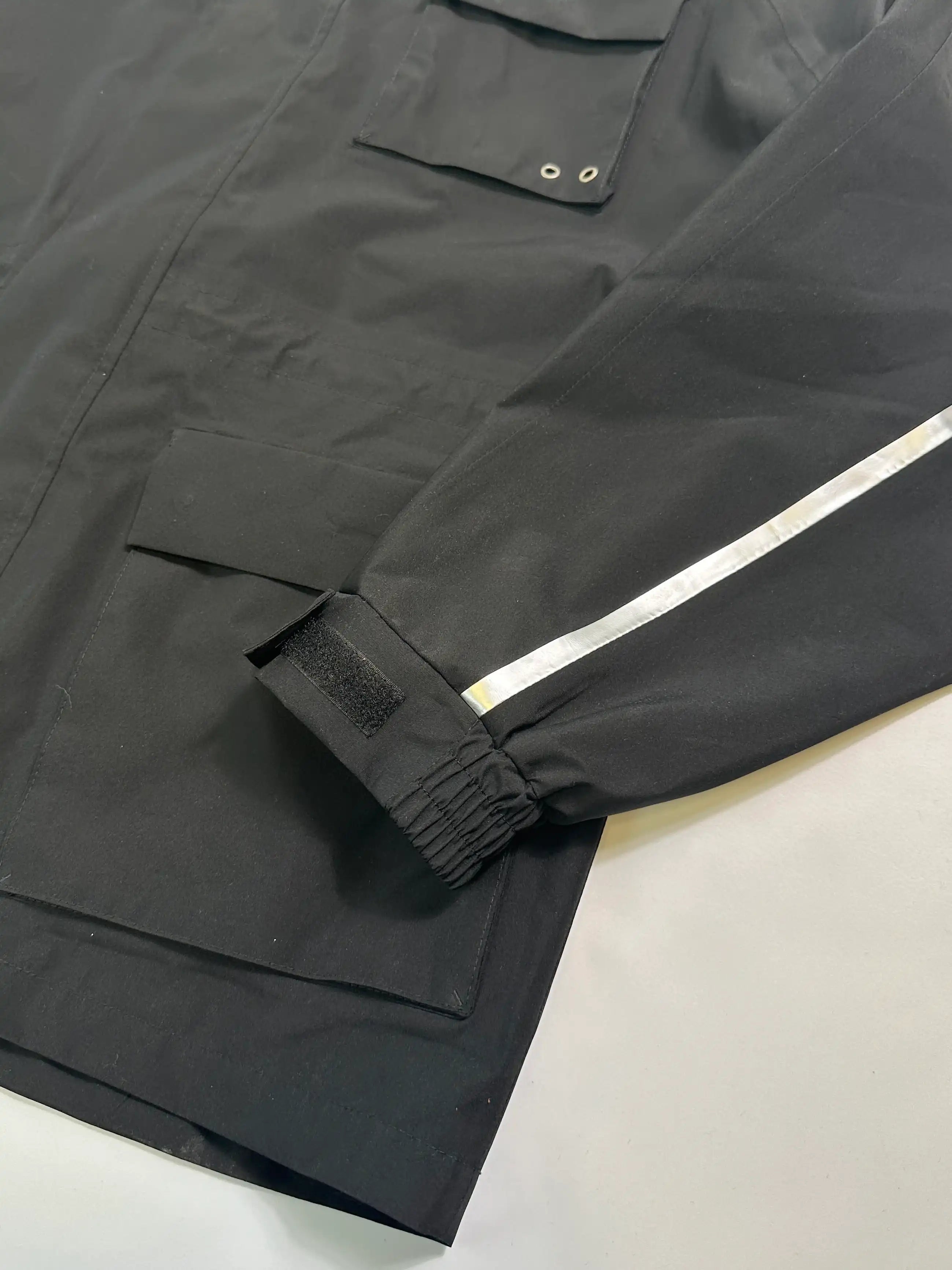 The Off-White Technical Jacket is an essential and functional outerwear piece, perfect for facing the elements in style. Crafted from black waterproof technical fabric, it guarantees protection and comfort in any situation. The concealed hood, which folds inside the collar, offers versatility and practicality, while reflective details on the sleeves and back improve visibility.