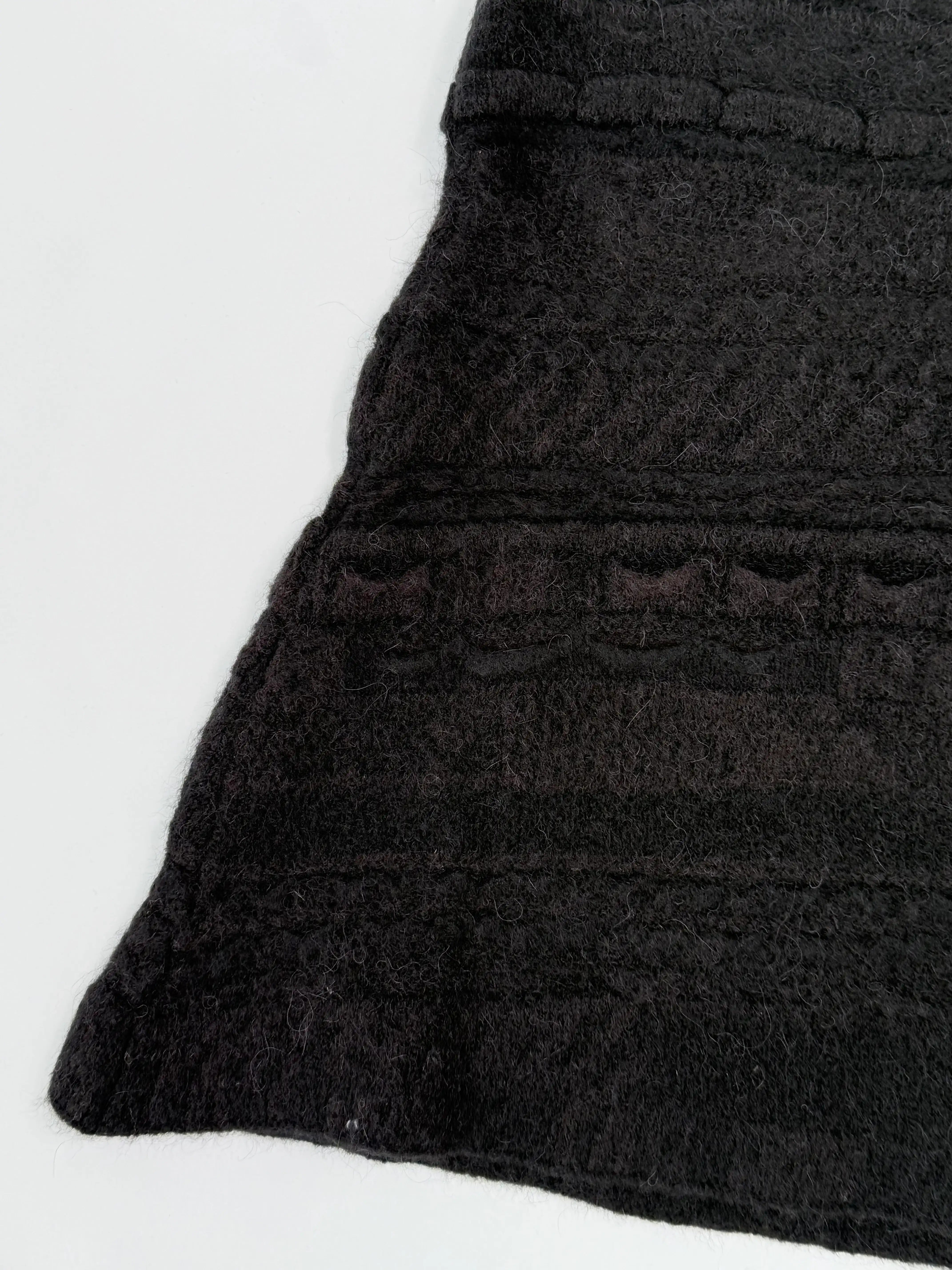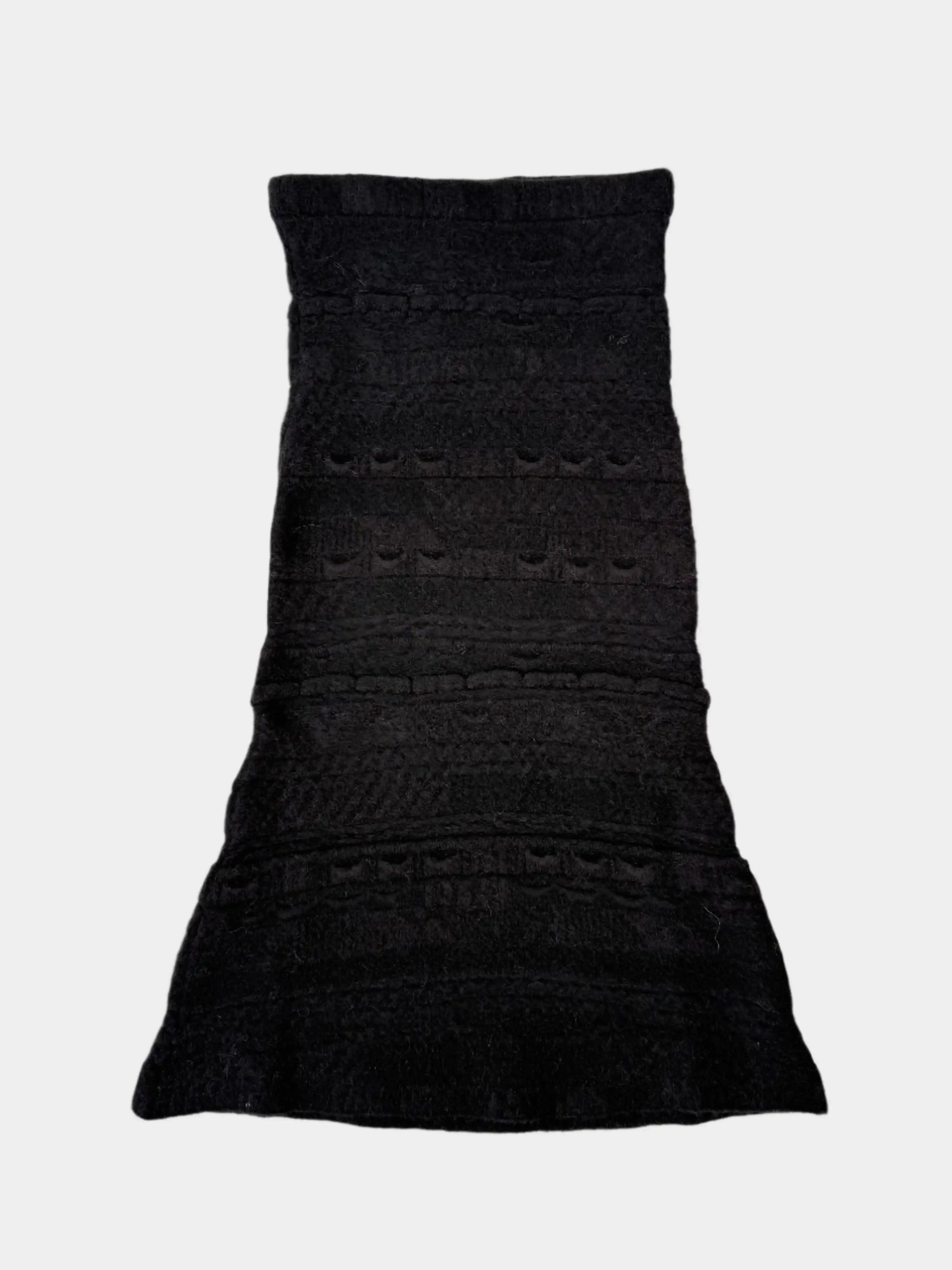 With a sophisticated design and three-dimensional texture, this black knitted skirt stands out for its woven motif workmanship. The slightly flared line enhances the silhouette, while offering comfort and style. A refined and versatile garment, ideal for the cold season.