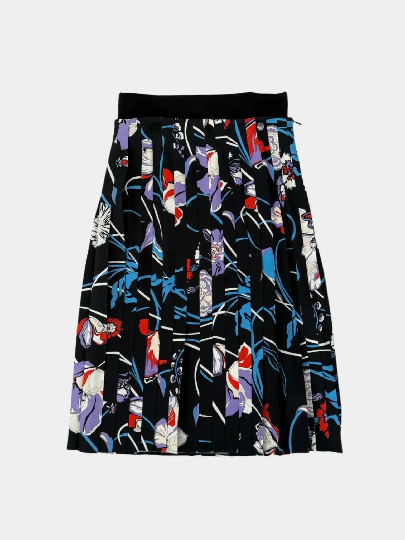 This pleated skirt by Emilio Pucci stands out for its graphic dynamism and refined sartorial construction. Featuring a lively floral pattern in shades of purple, red and light blue on a black base, it expresses the unmistakable aesthetic of the brand. The black elasticated waist and the regular pleated effect enhance the silhouette with elegance and movement. A perfect garment to give personality to even the most essential looks.