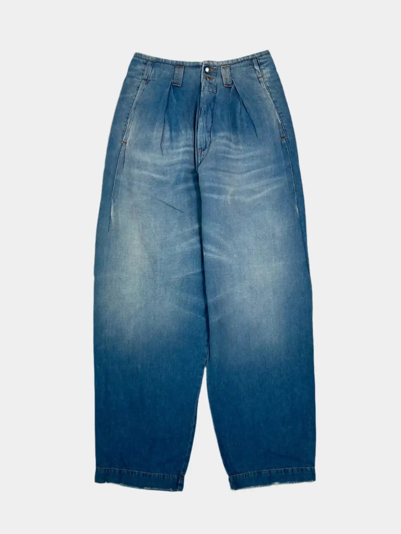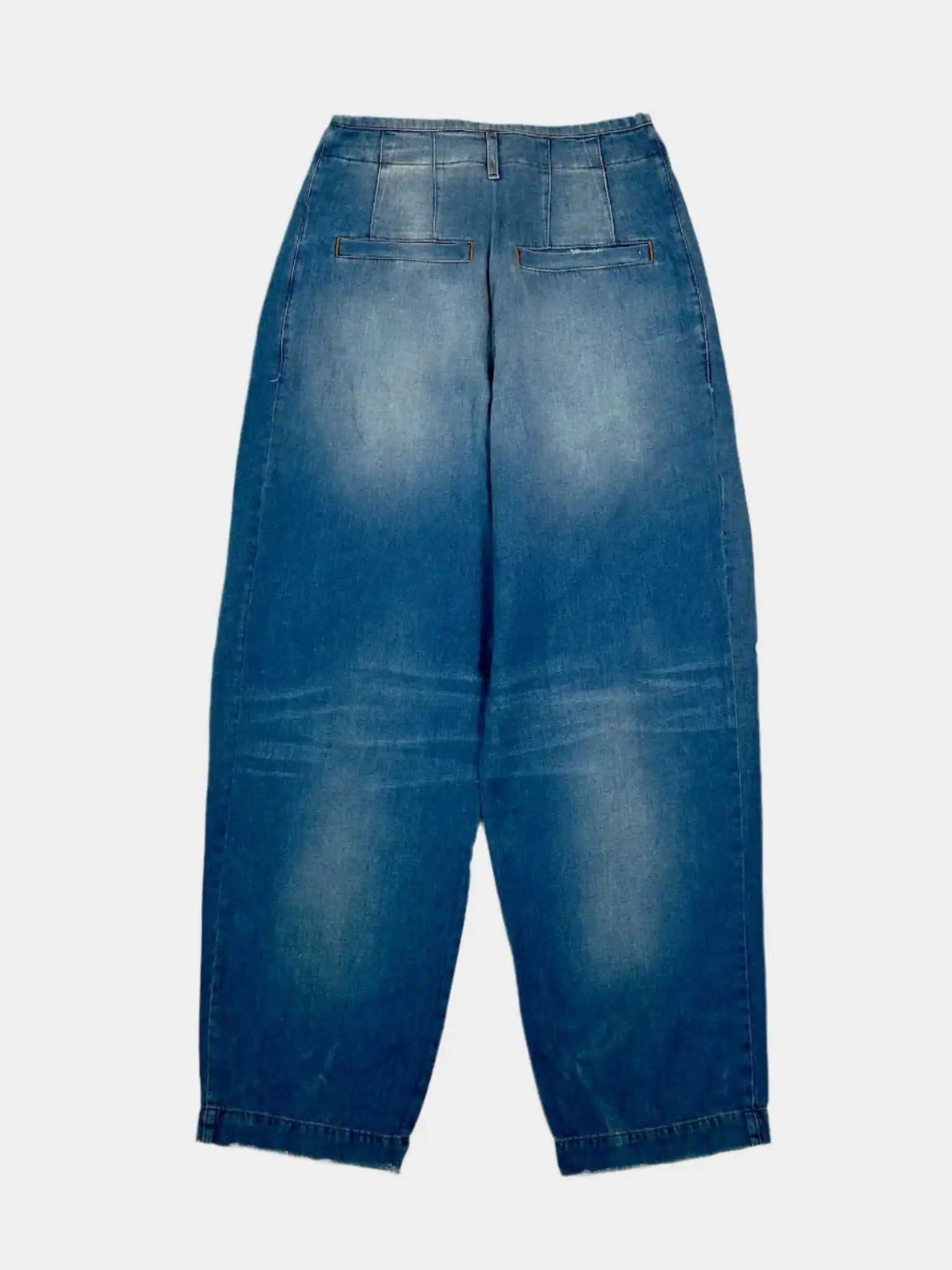 These Darkpark jeans stand out for their contemporary, wide silhouette, enhanced by front pleats and a faded light blue shade. The faded wash with a light used effect gives a vintage look, while the darts and wide leg offer comfort and style. Ideal for sophisticated urban looks.