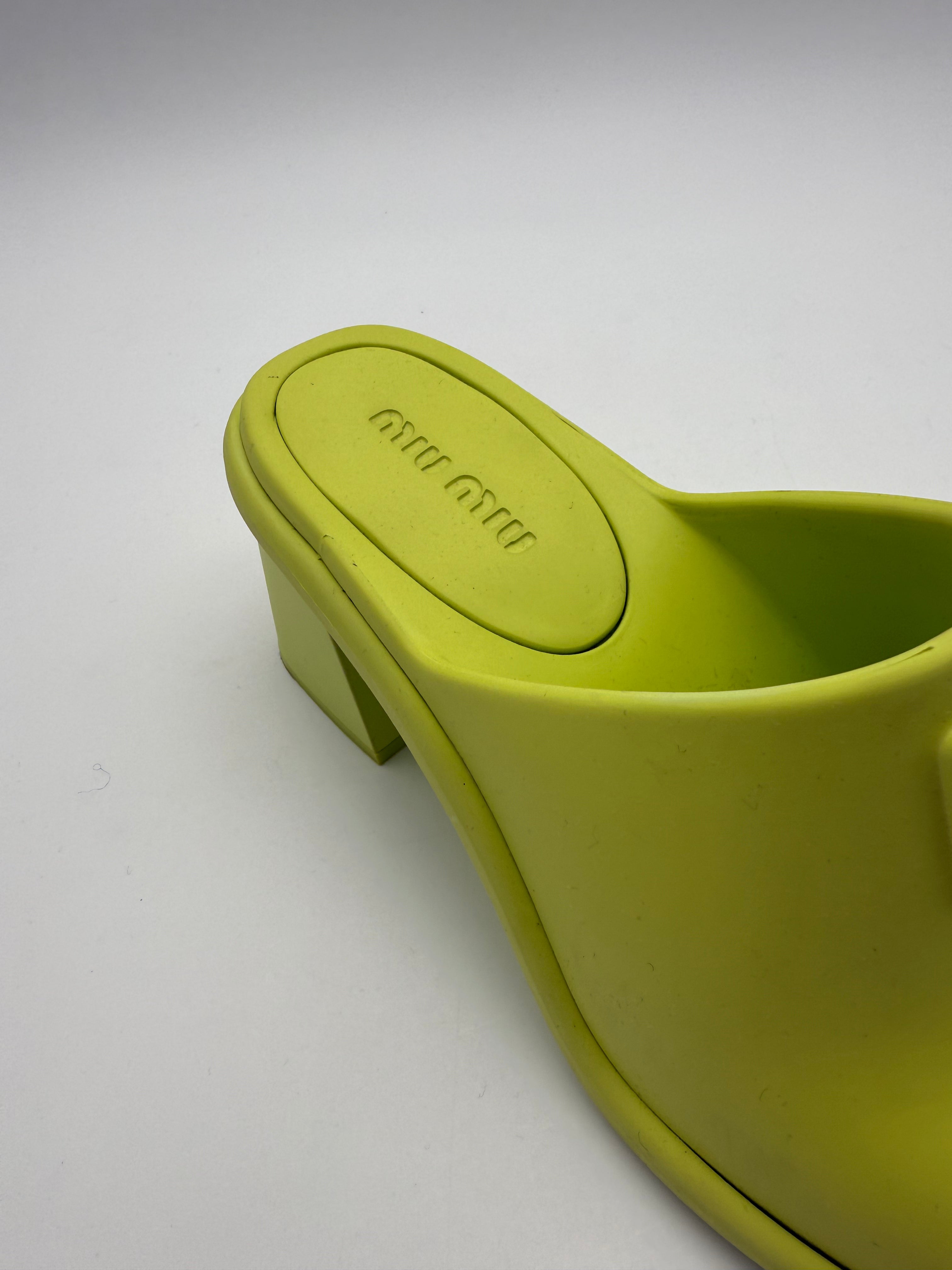 The Miu Miu mule in neon yellow rubber is a true statement of contemporary style. Featuring bold lines and a block geometric heel, it adds a pop and playful touch to your summer looks. The all-rubber construction makes it easy to clean and comfortable, while the embossed logo on the front underscores the brand's luxury and fashion-forward identity.