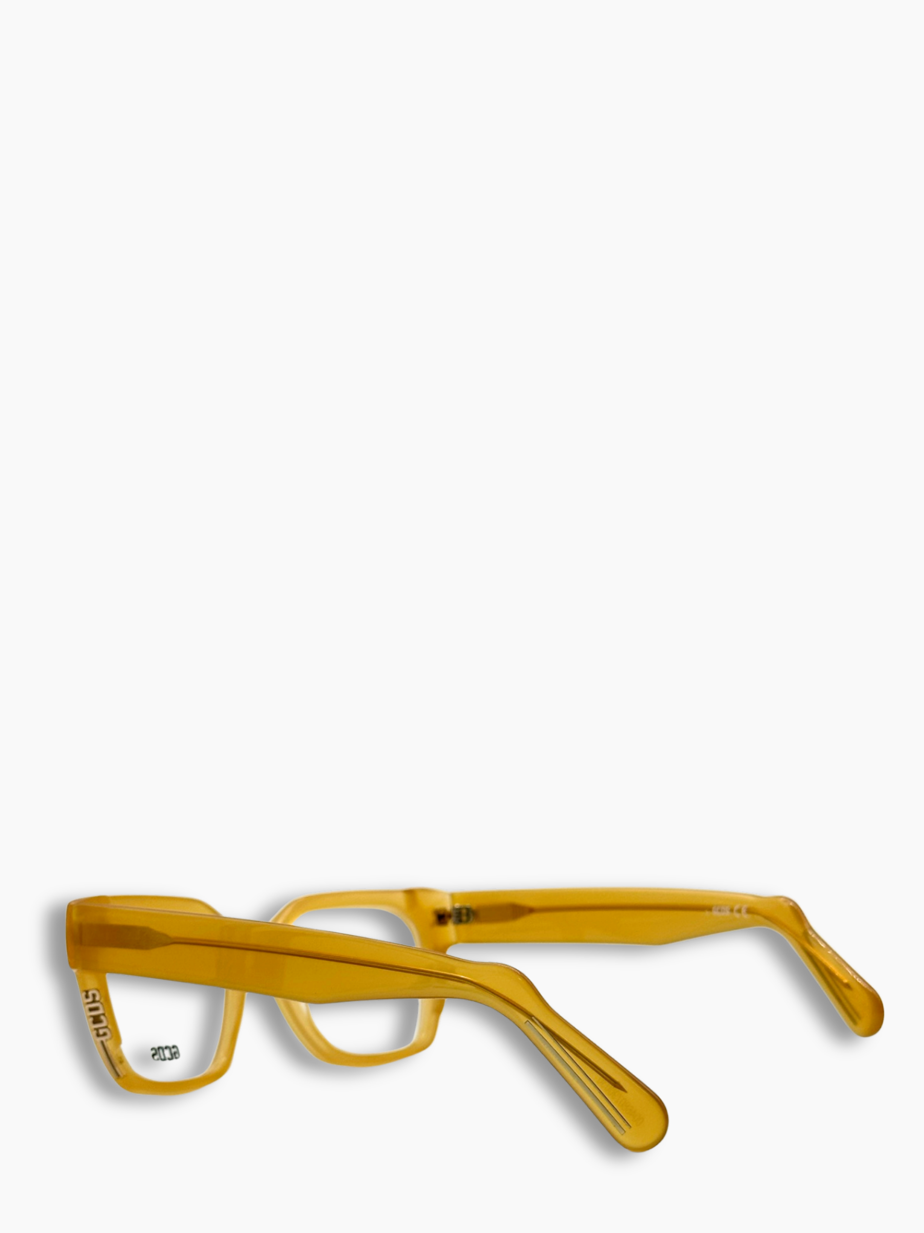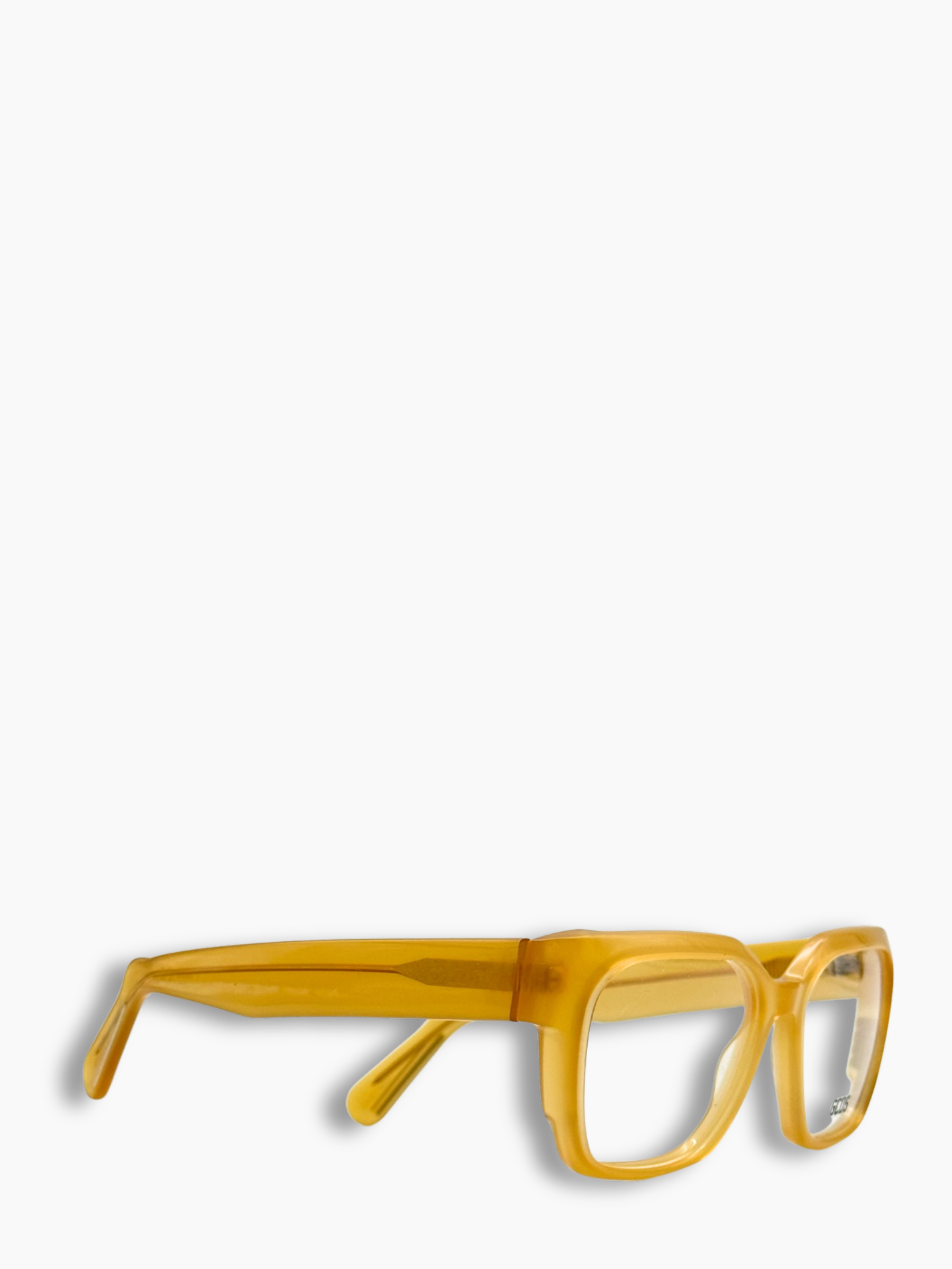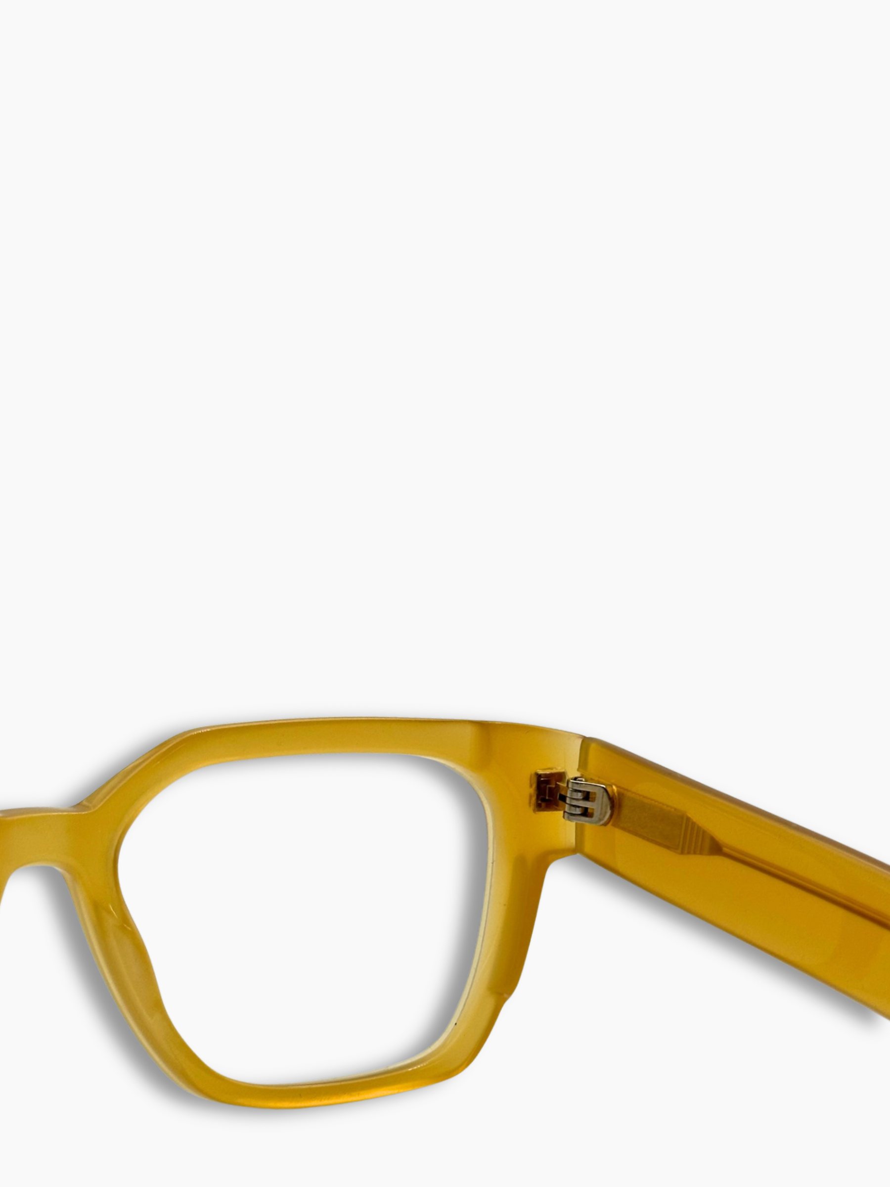 Occhiali da vista dal design contemporaneo con montatura rettangolare in acetato giallo opaco. Un modello leggero, fresco e distintivo, ideale per aggiungere un tocco di colore ai look quotidiani senza rinunciare alla pulizia delle linee.