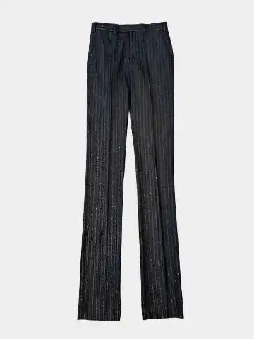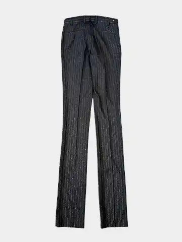 Classic elegance and a contemporary touch meet in these grey pinstriped trousers by Laneus. Crafted from a fine virgin wool blend with lurex inserts, they feature a narrow leg silhouette and tailored details such as front pleats and belt loops. A versatile and refined garment, perfect for pairing with blazers or soft knits for a sophisticated look.