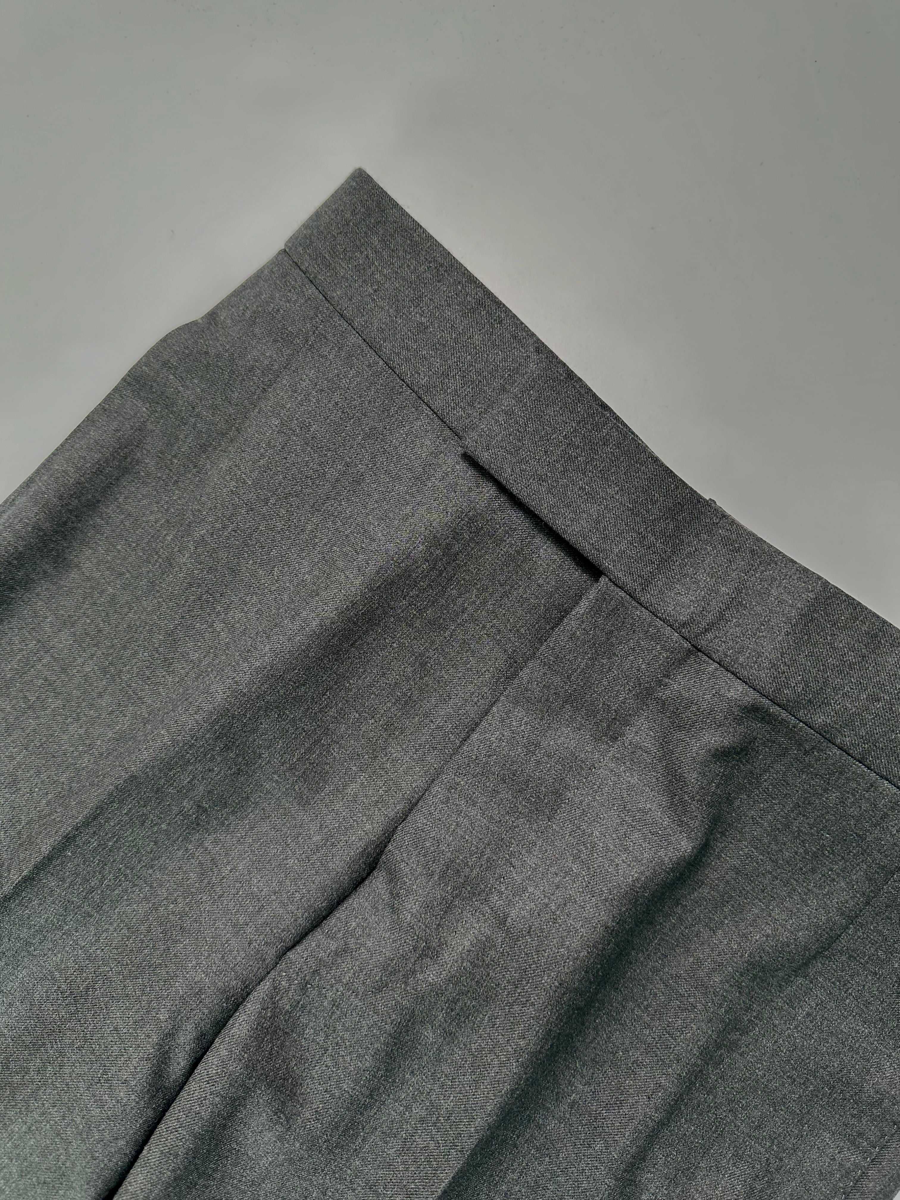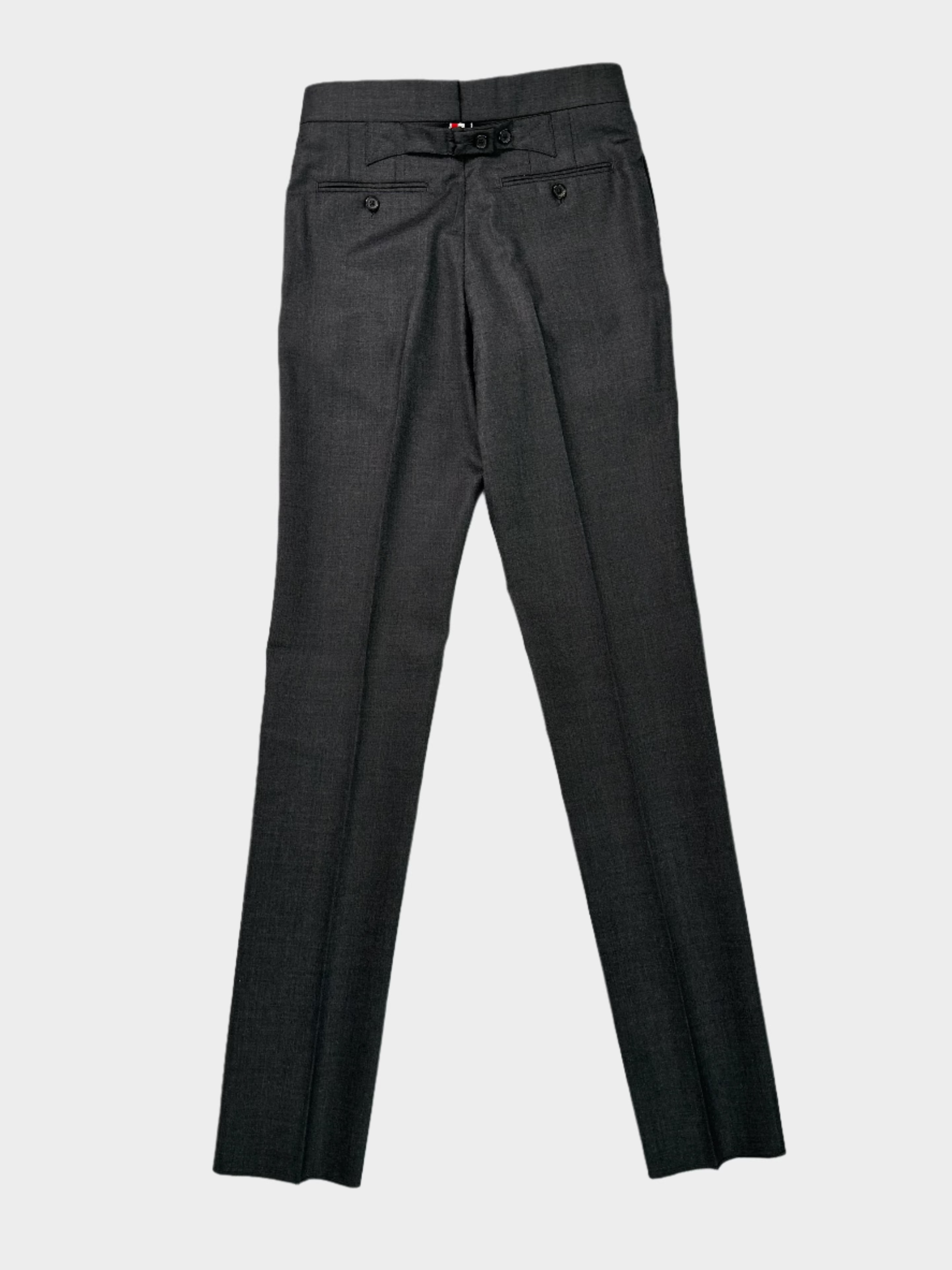 Timeless elegance with the Thom Browne tailored trousers in grey wool melange. Featuring refined details such as the button fastening, back pockets with buttons and the tricolour logo on the back, they are ideal for formal or casual chic looks.