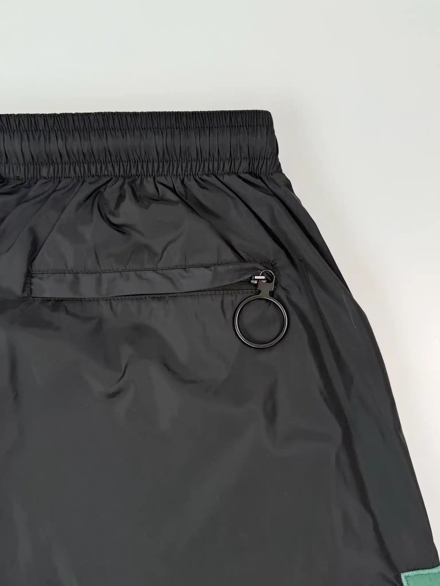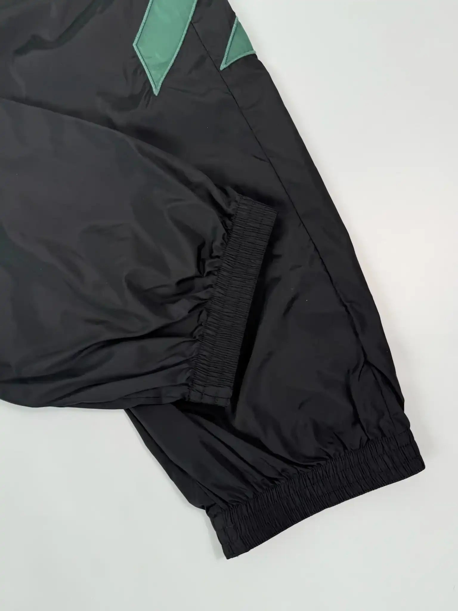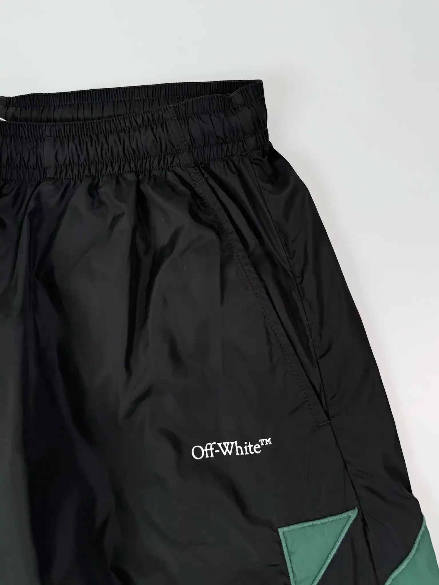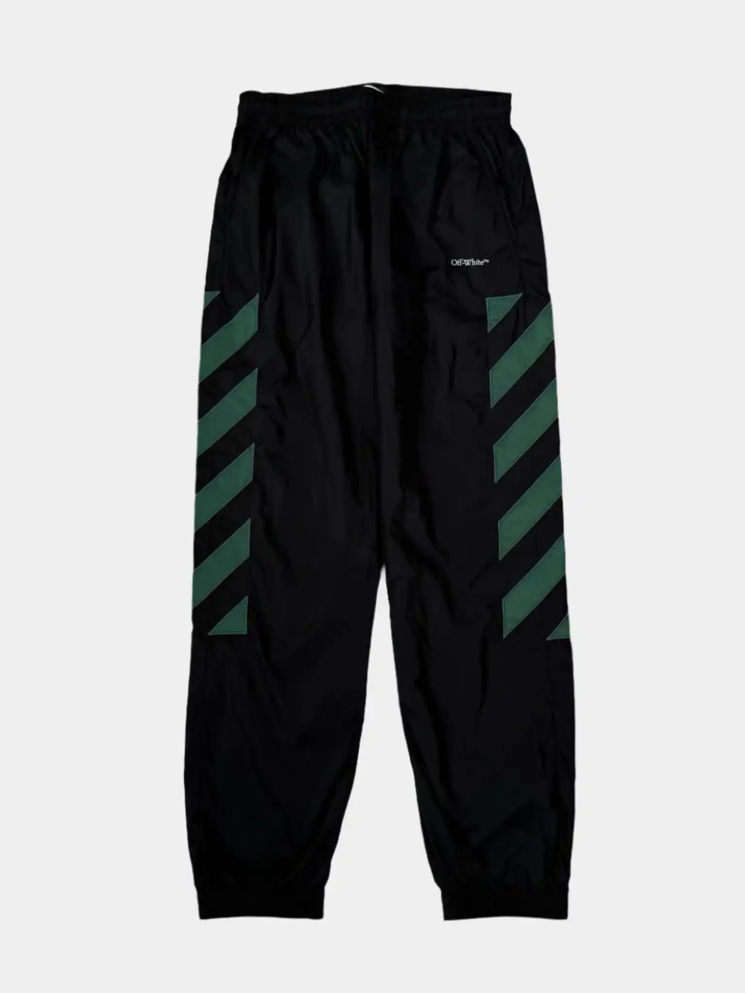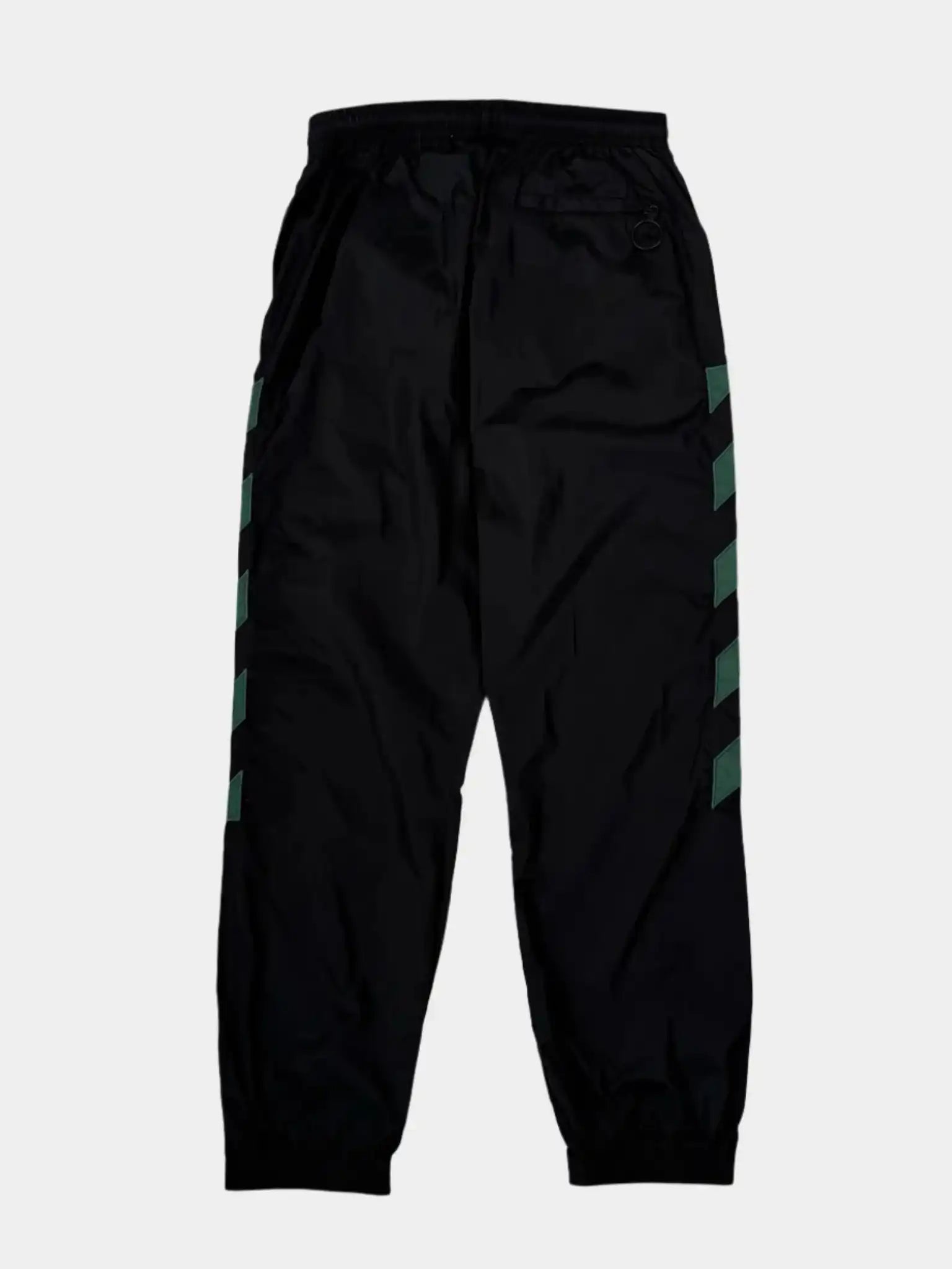 These Off-White track pants combine urban aesthetics and functionality. Crafted from black technical fabric, they stand out for their iconic petrol green diagonal stripes down the legs and the Off-White logo printed on the left side. The comfortable fit with elastic waist and ankles makes them ideal for a relaxed yet distinctive look.