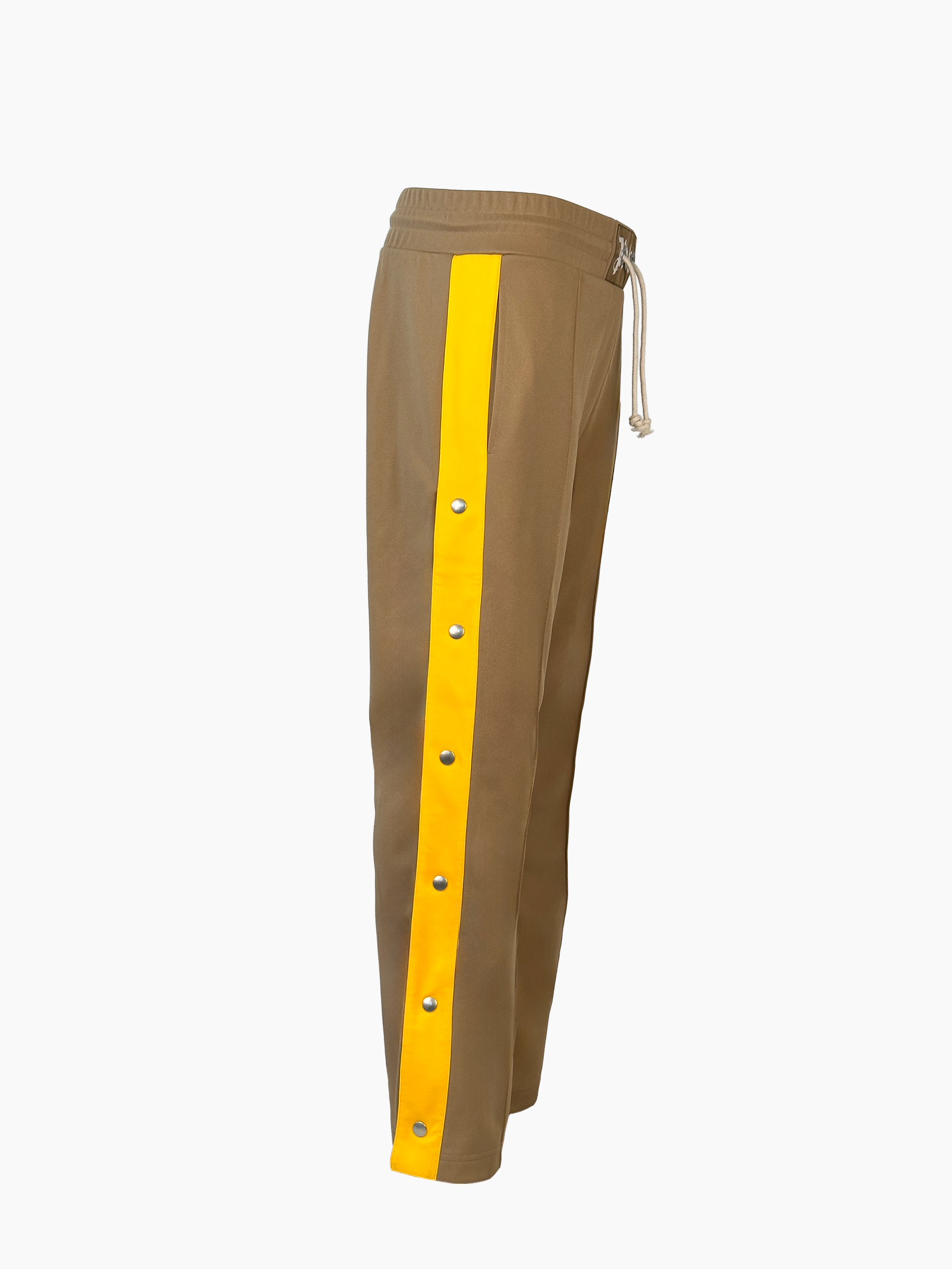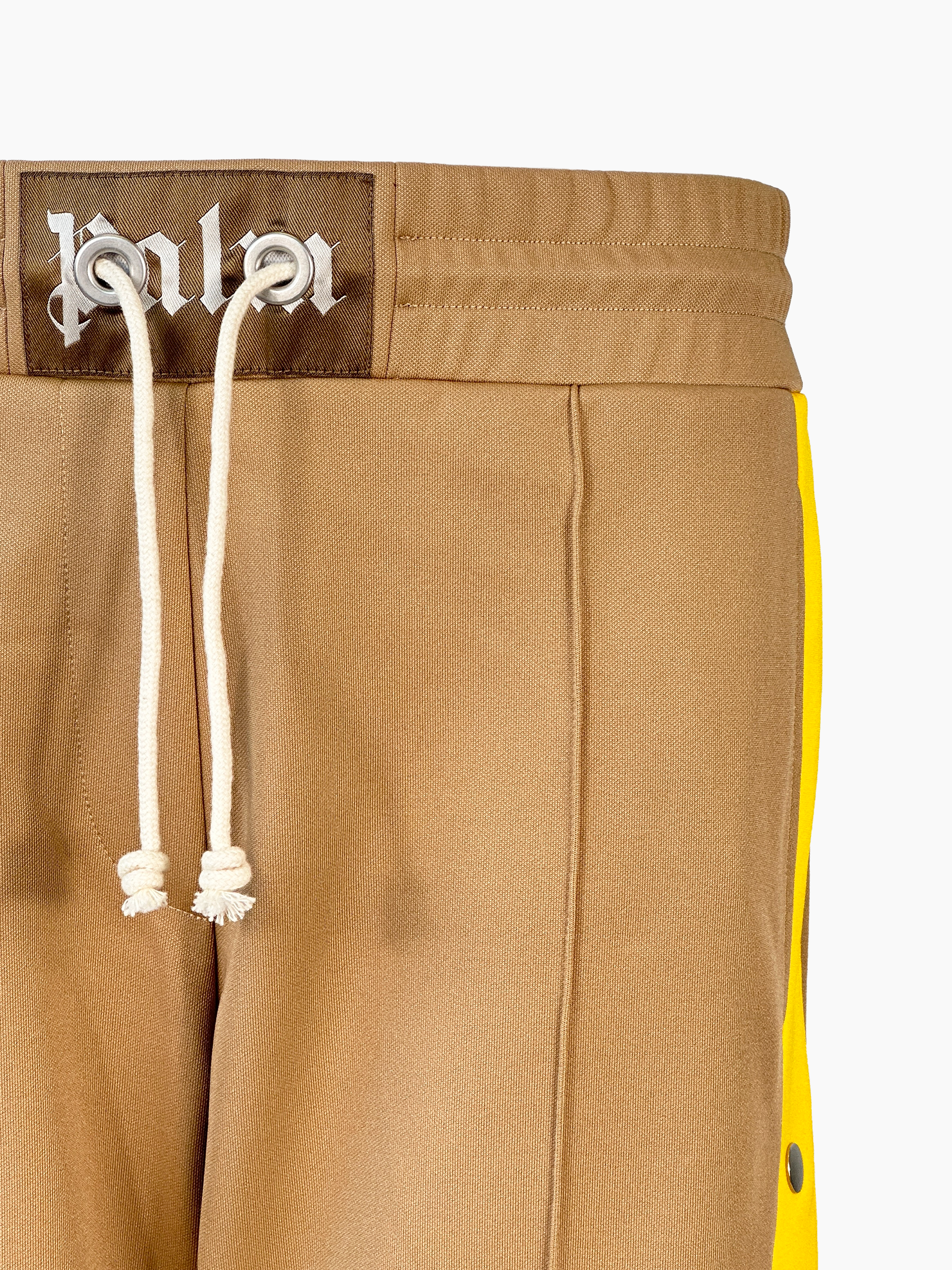 The Palm Angels tracksuit bottoms in beige stand out for their iconic yellow side stripes with snap buttons. A retro-inspired sporty design that allows you to open the legs at the sides for a personalized touch. The drawstring waist ensures comfort and an adjustable fit, while the slightly flared line adds character to the look. Ideal for trendy streetwear and casual outfits.
