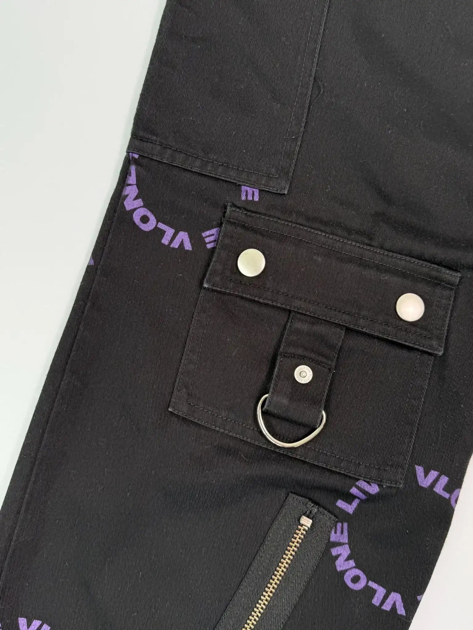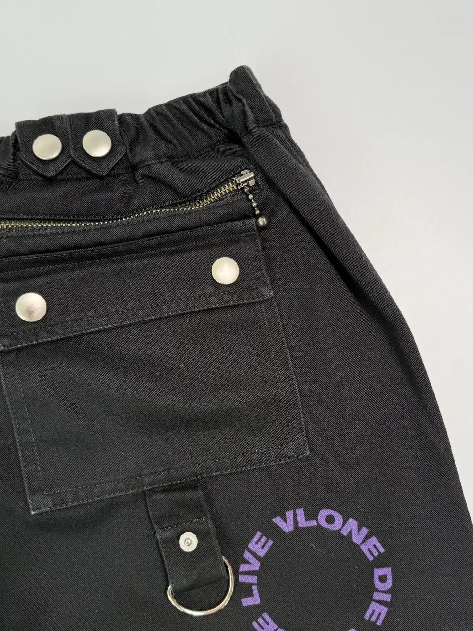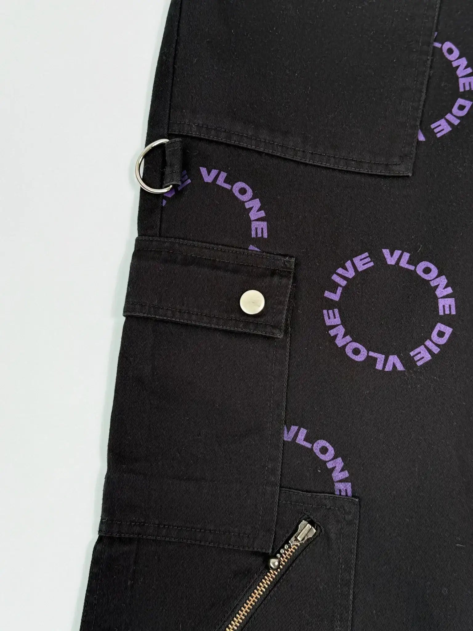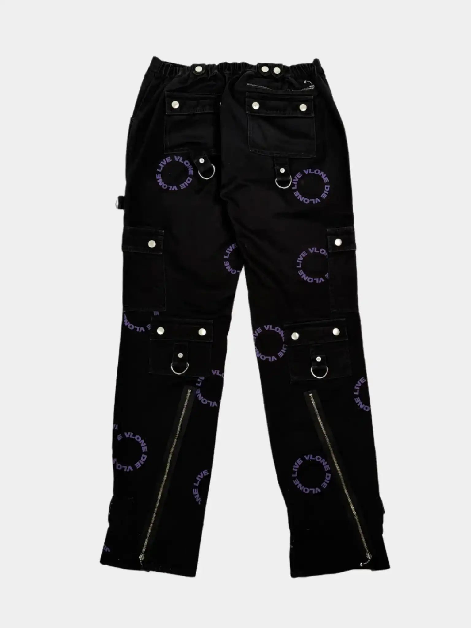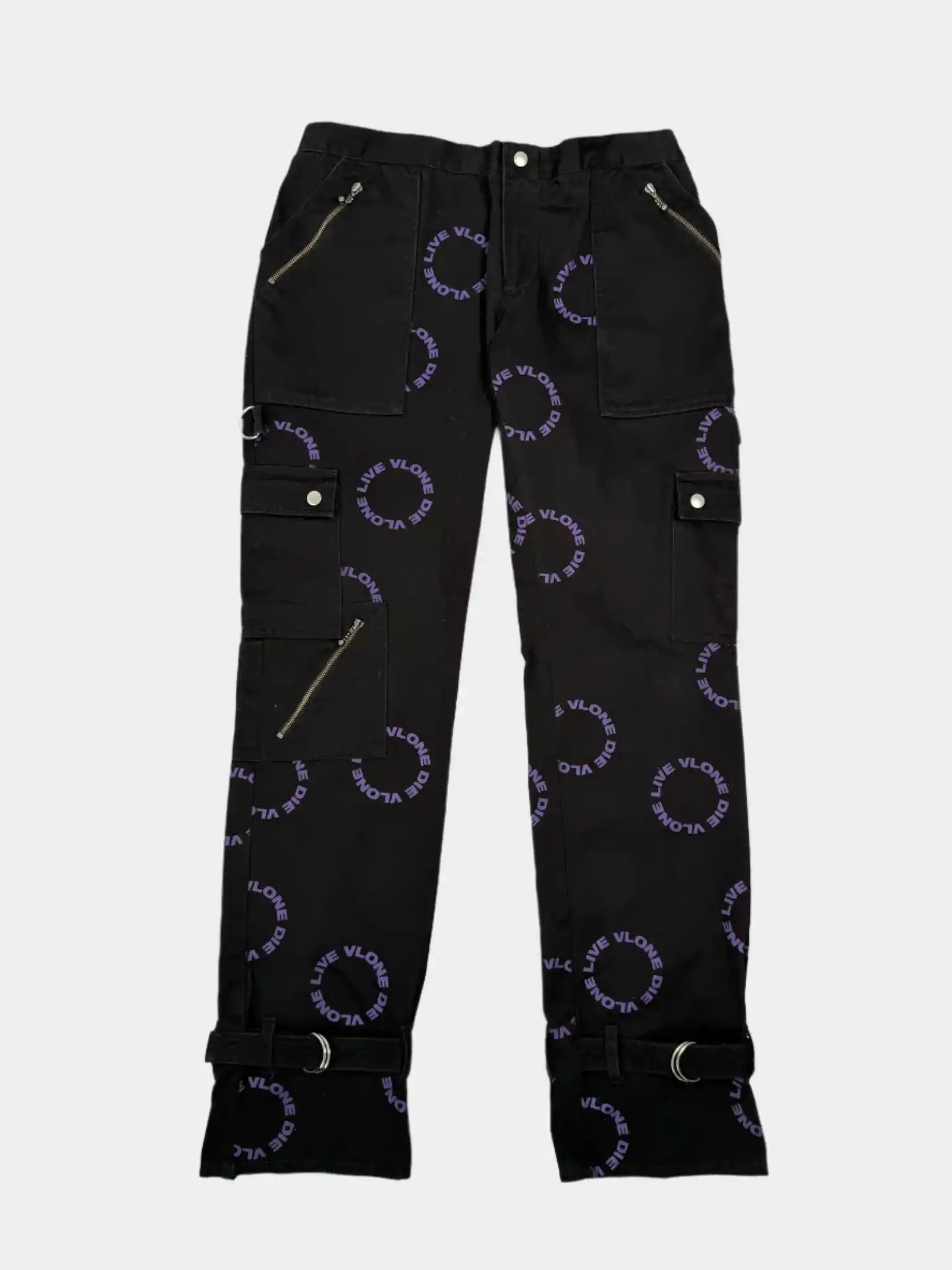 Explore the streetwear aesthetic with these Vlone pants. Crafted from black cotton, they feature a circular “LIVE VLONE DIE VLONE” print in purple that makes them instantly recognizable. The design is enriched by metal zips, D-rings, snap pockets and adjustable straps at the bottom, for an urban look with a strong character.
