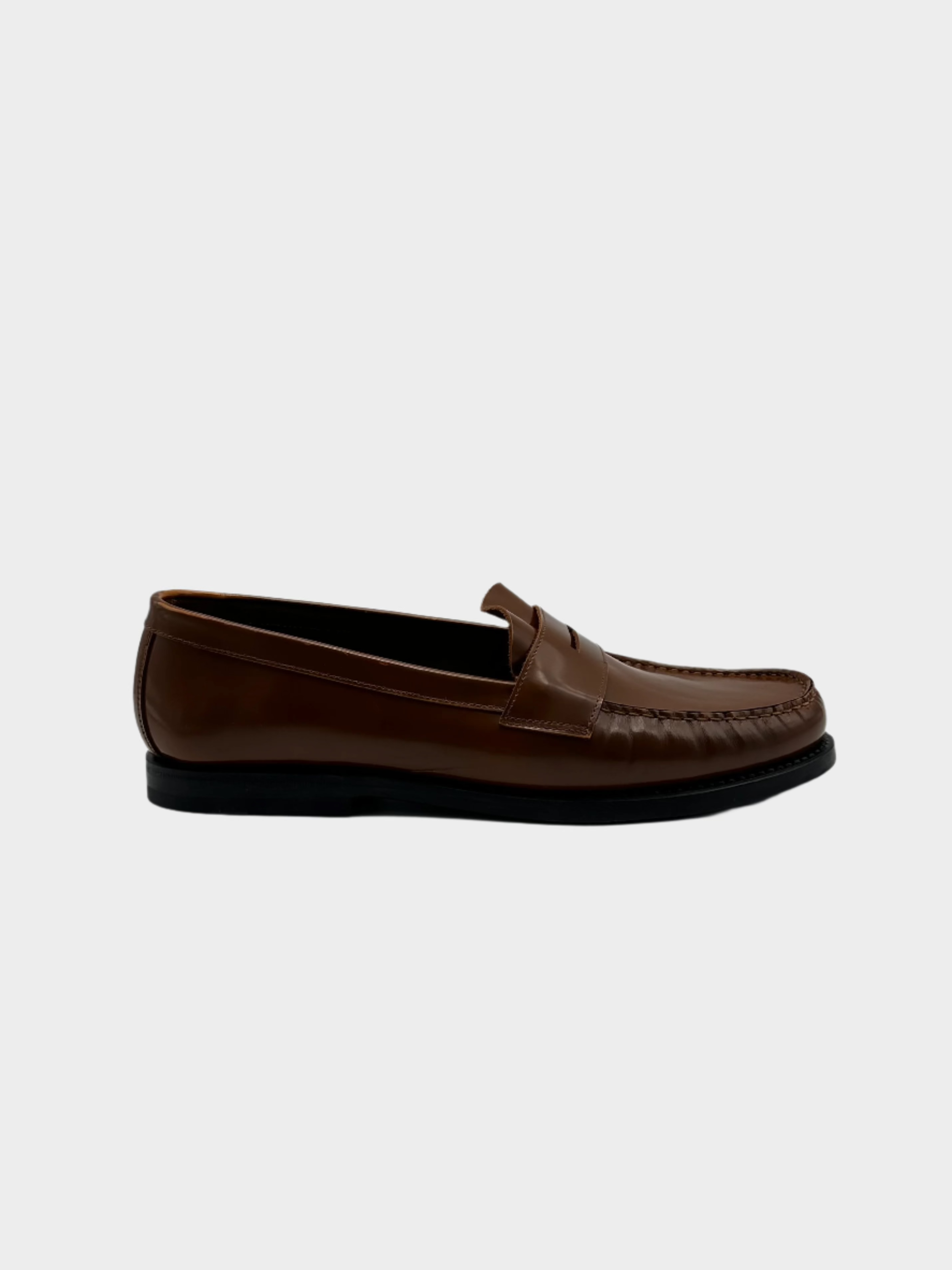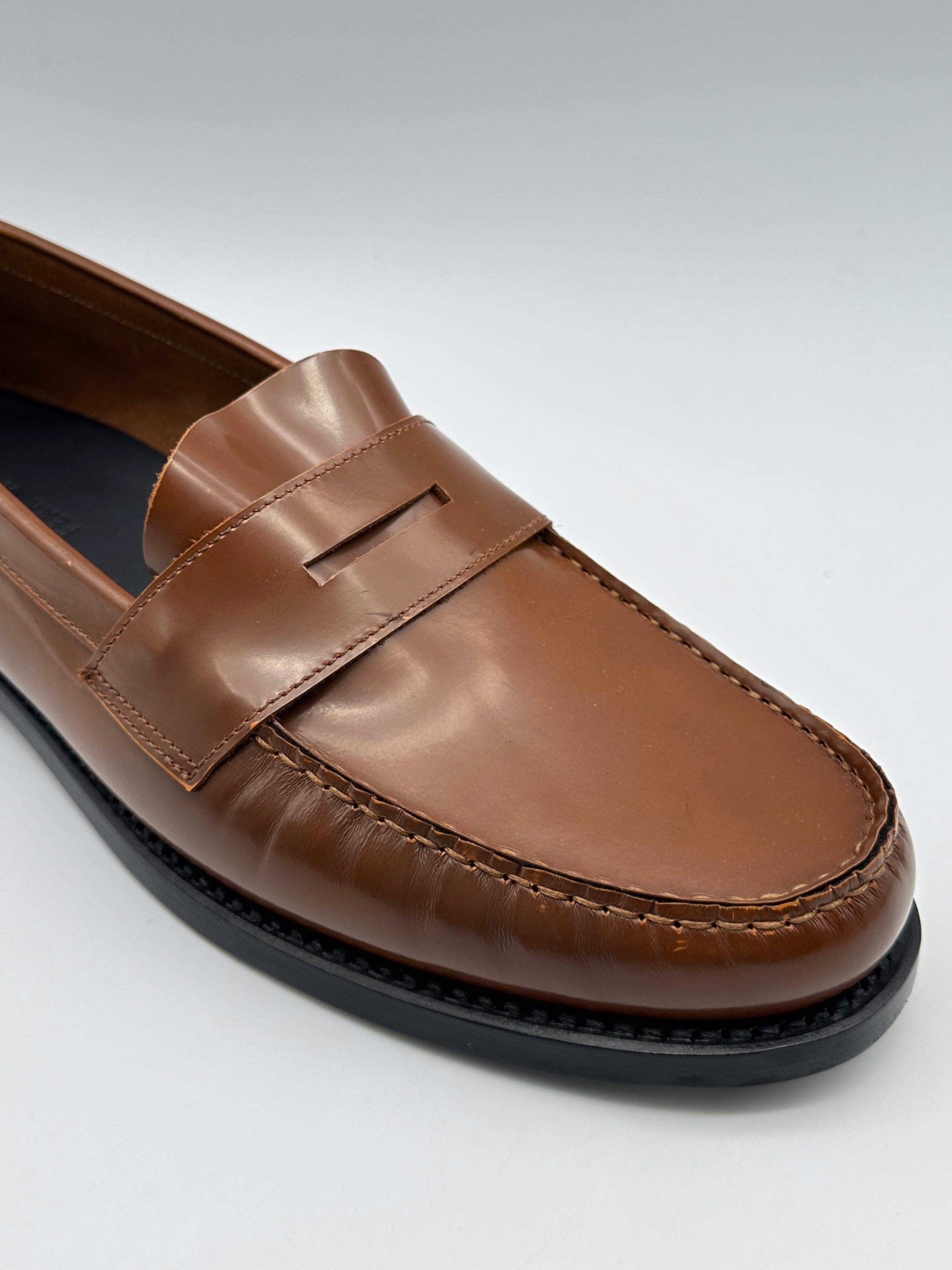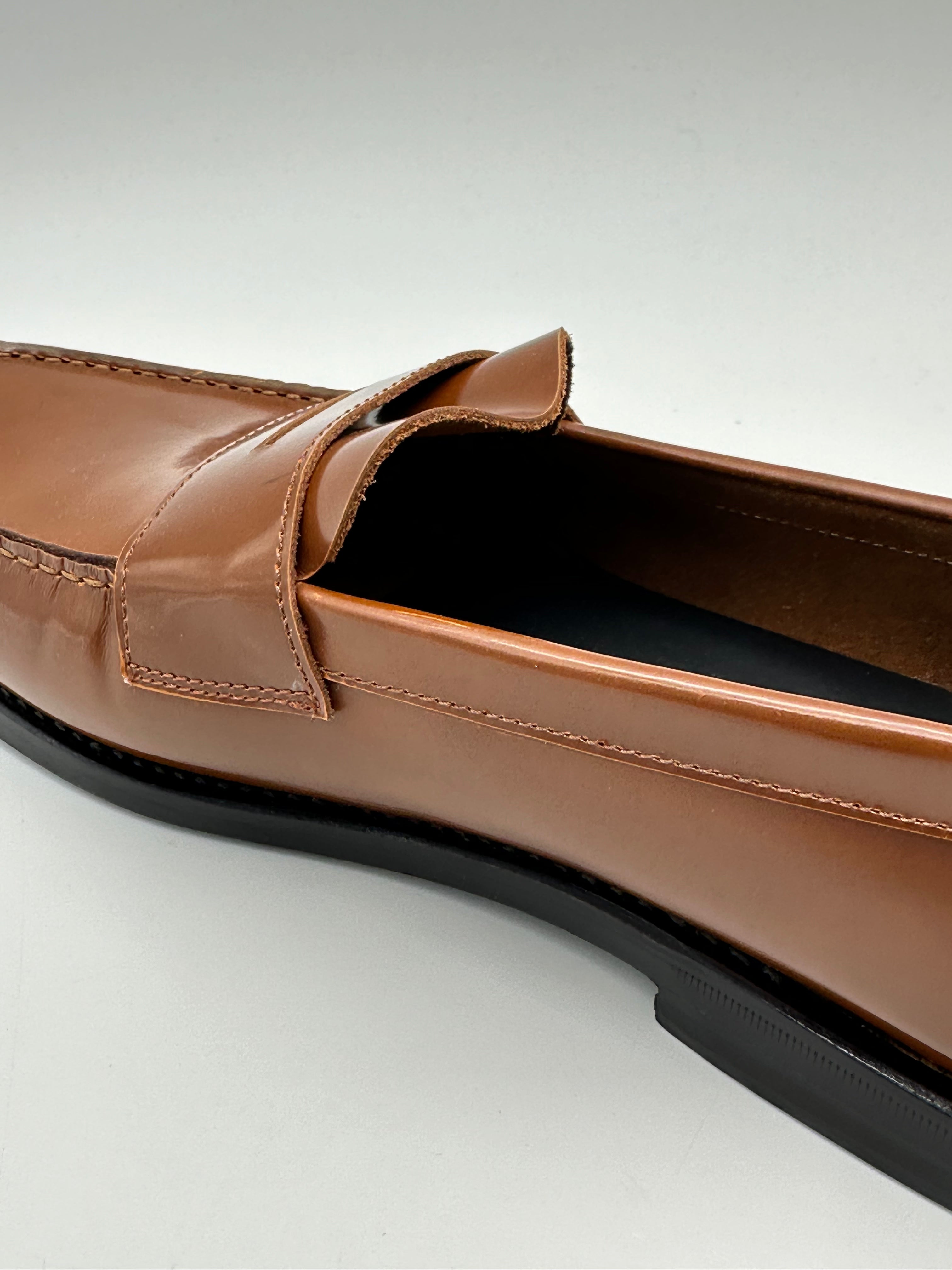 Penny loafer with a sophisticated style, crafted from fine, smooth, shiny leather in a warm shade of vicunia. This slip-on model features a tapered, minimal line, with a front vamp and a tone-on-tone rubber sole. Perfect for enhancing elegant or refined casual looks.