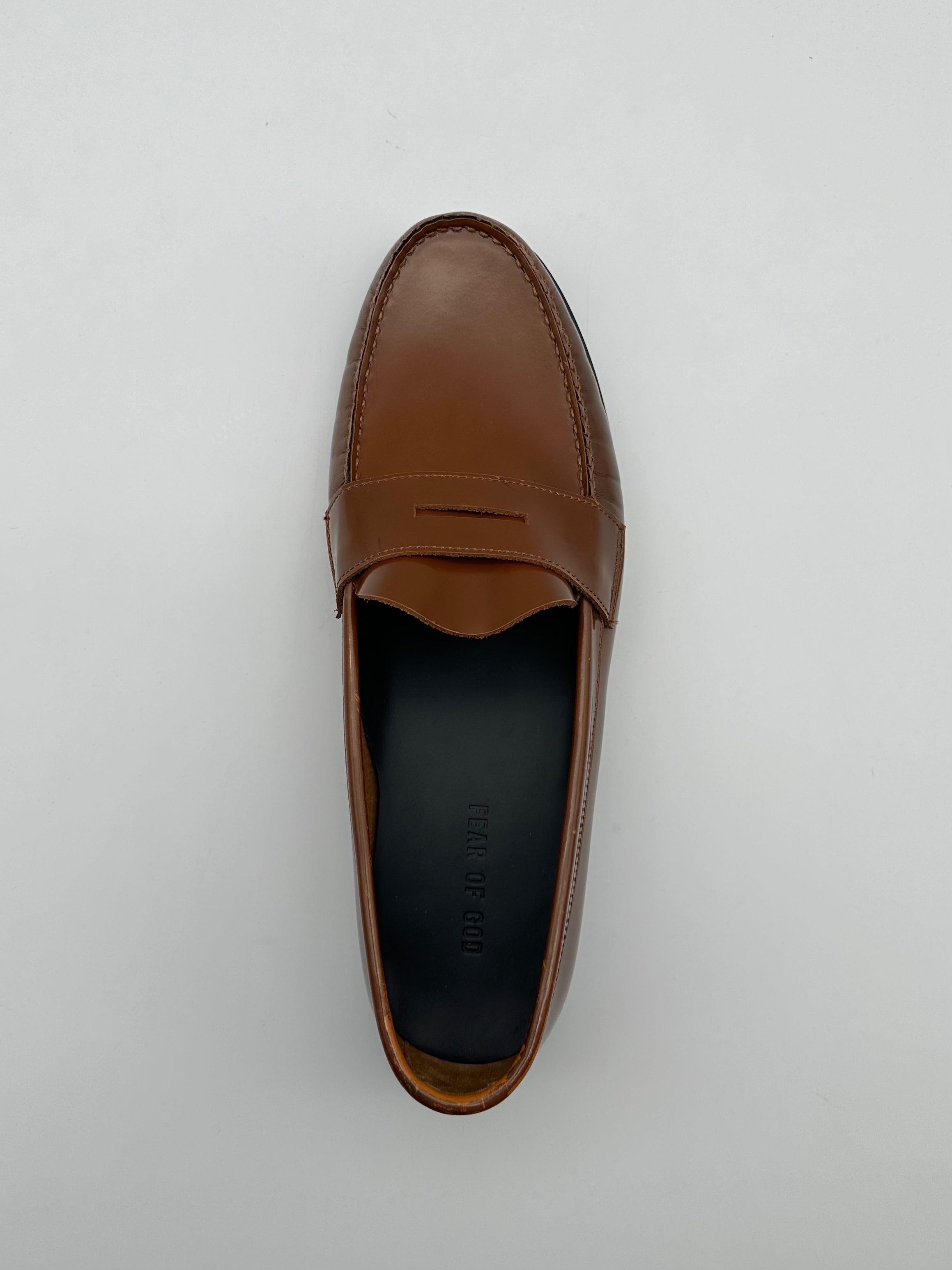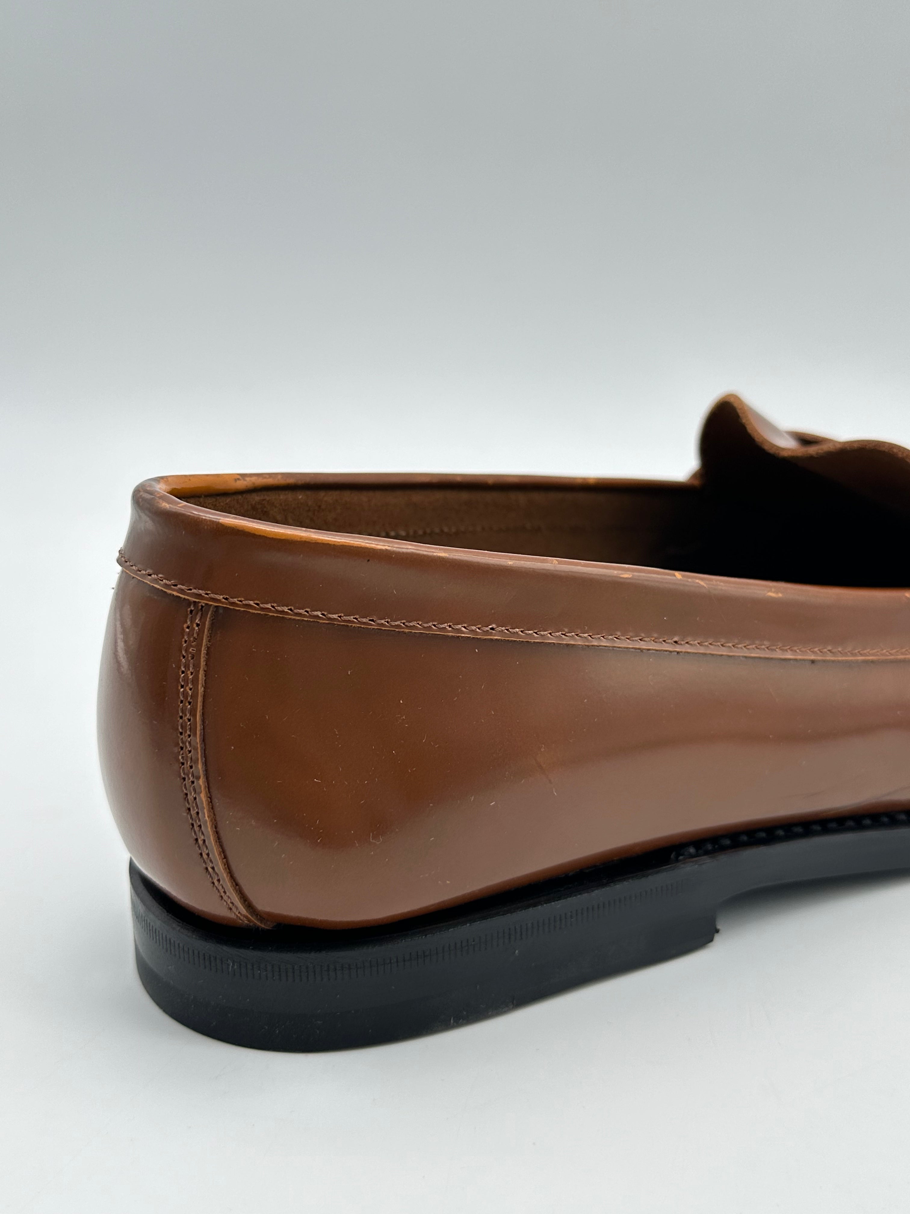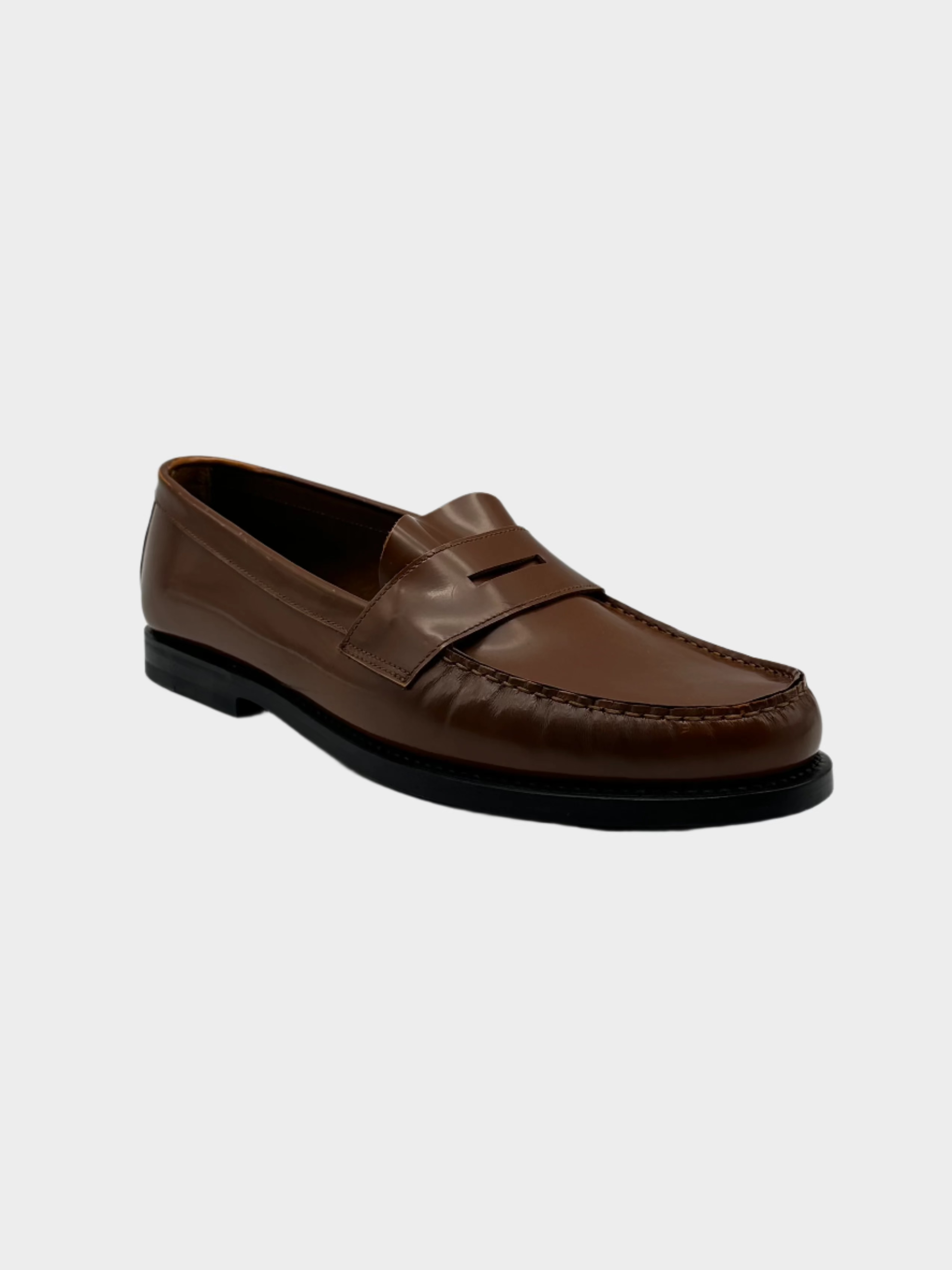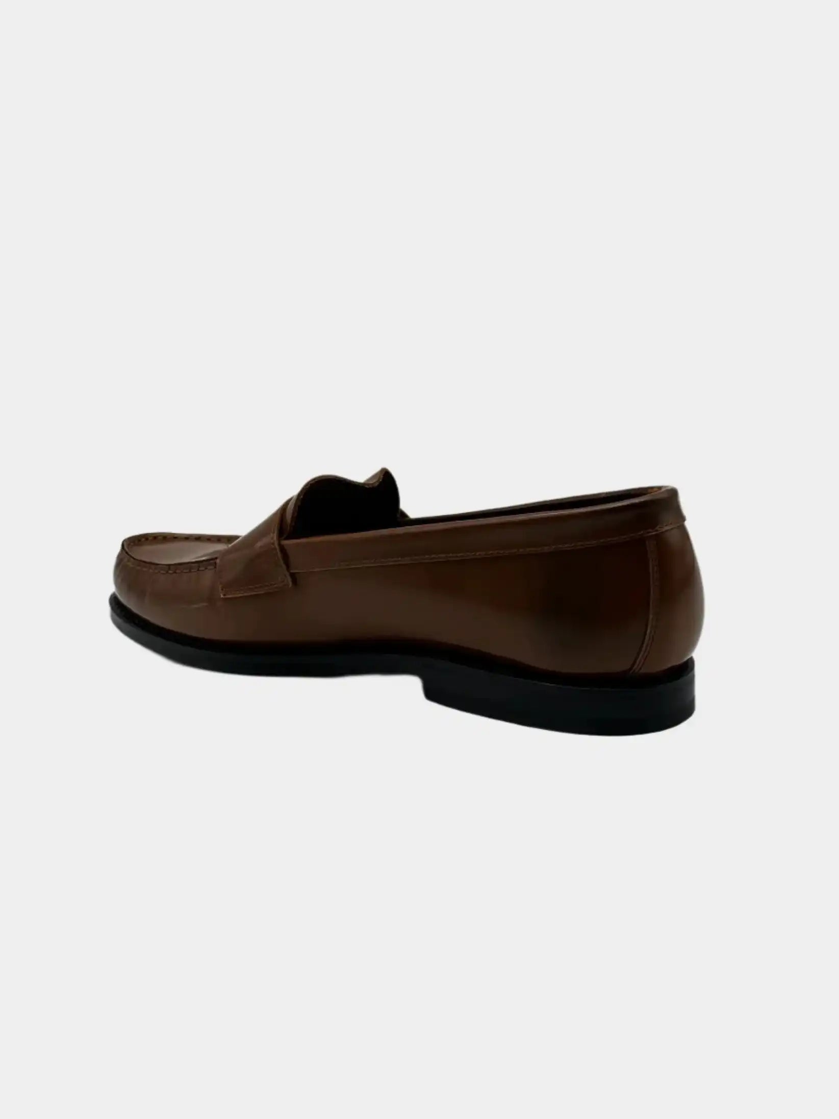 Penny loafer with a sophisticated style, crafted from fine, smooth, shiny leather in a warm shade of vicunia. This slip-on model features a tapered, minimal line, with a front vamp and a tone-on-tone rubber sole. Perfect for enhancing elegant or refined casual looks.