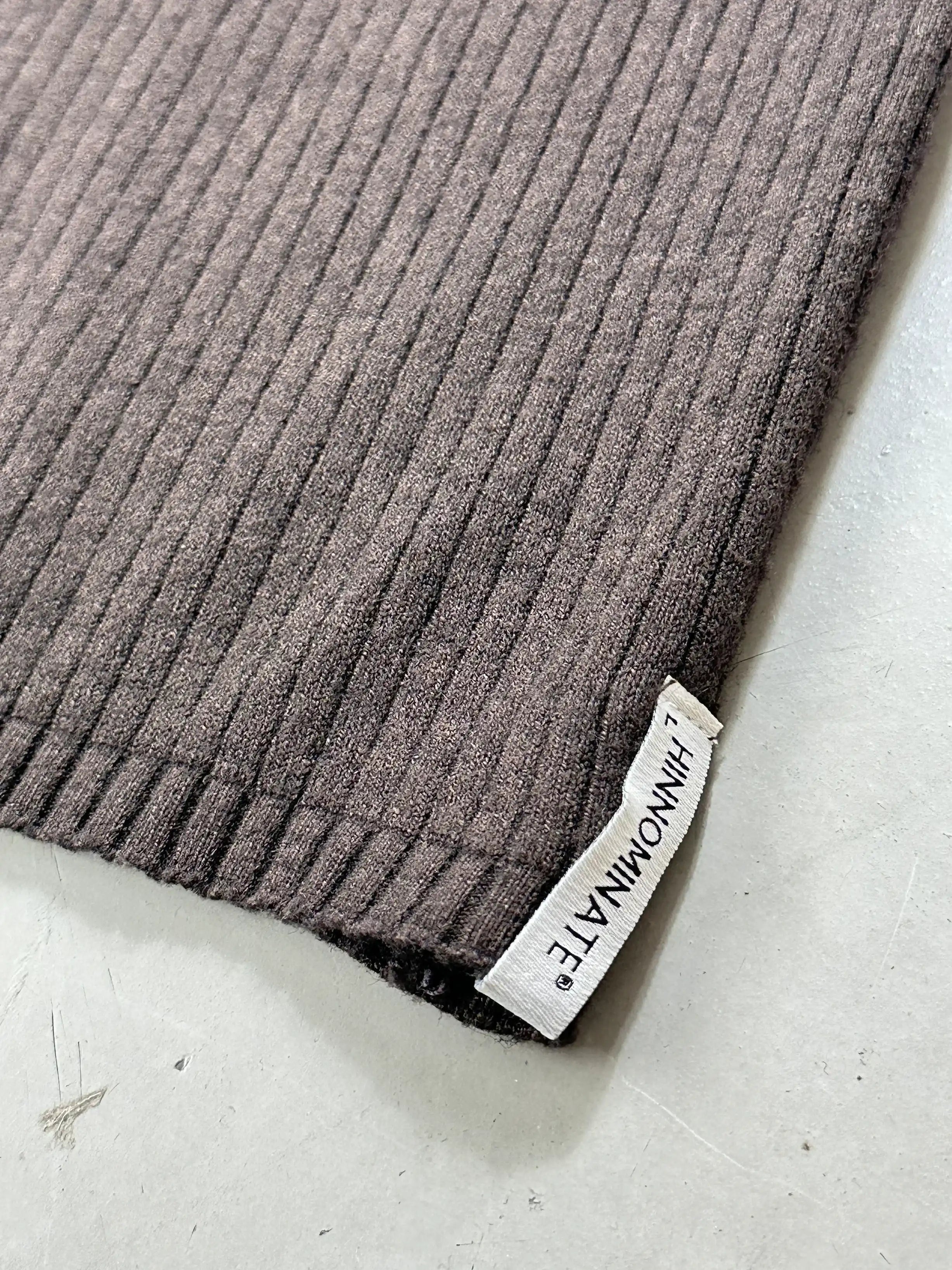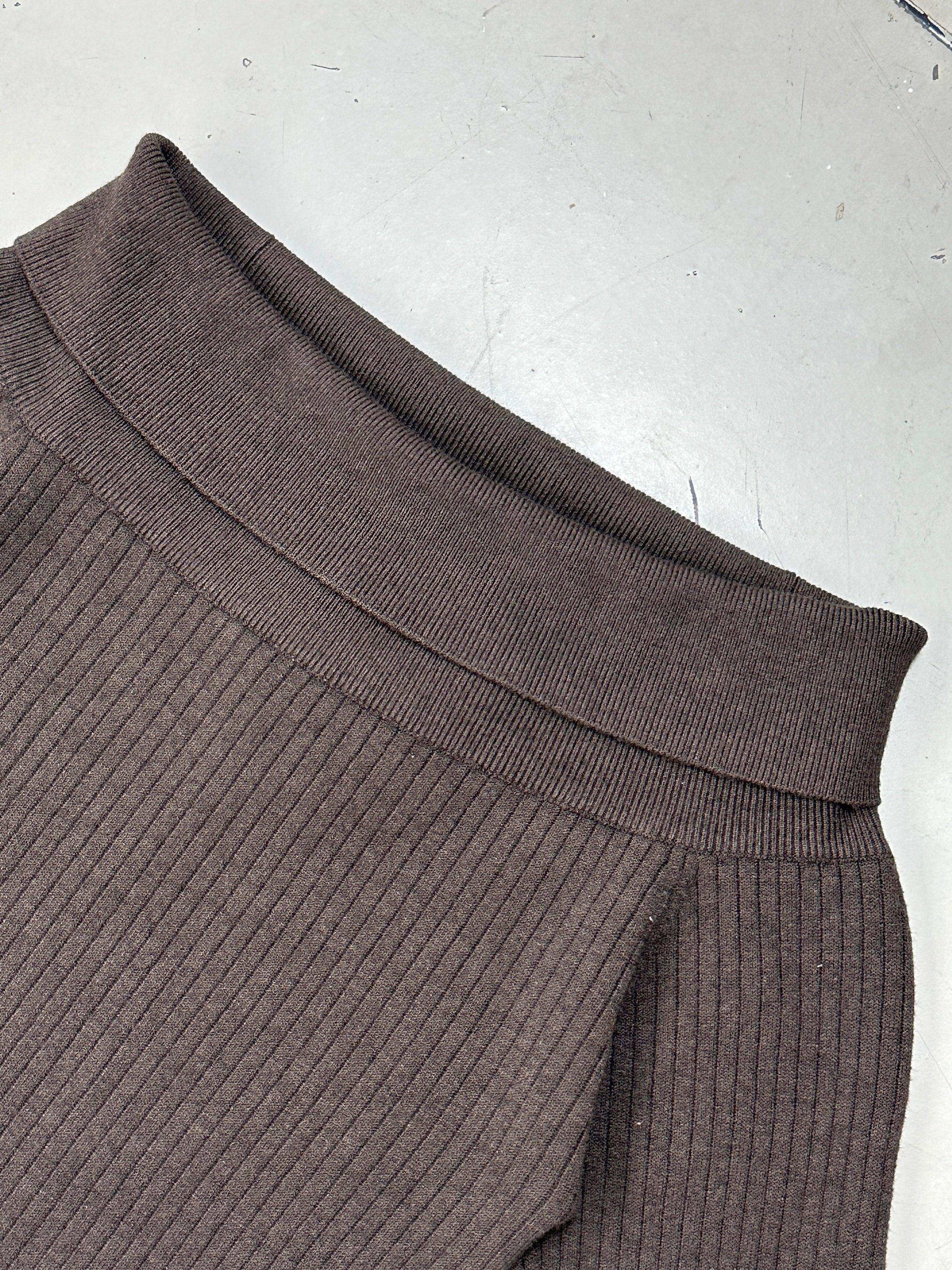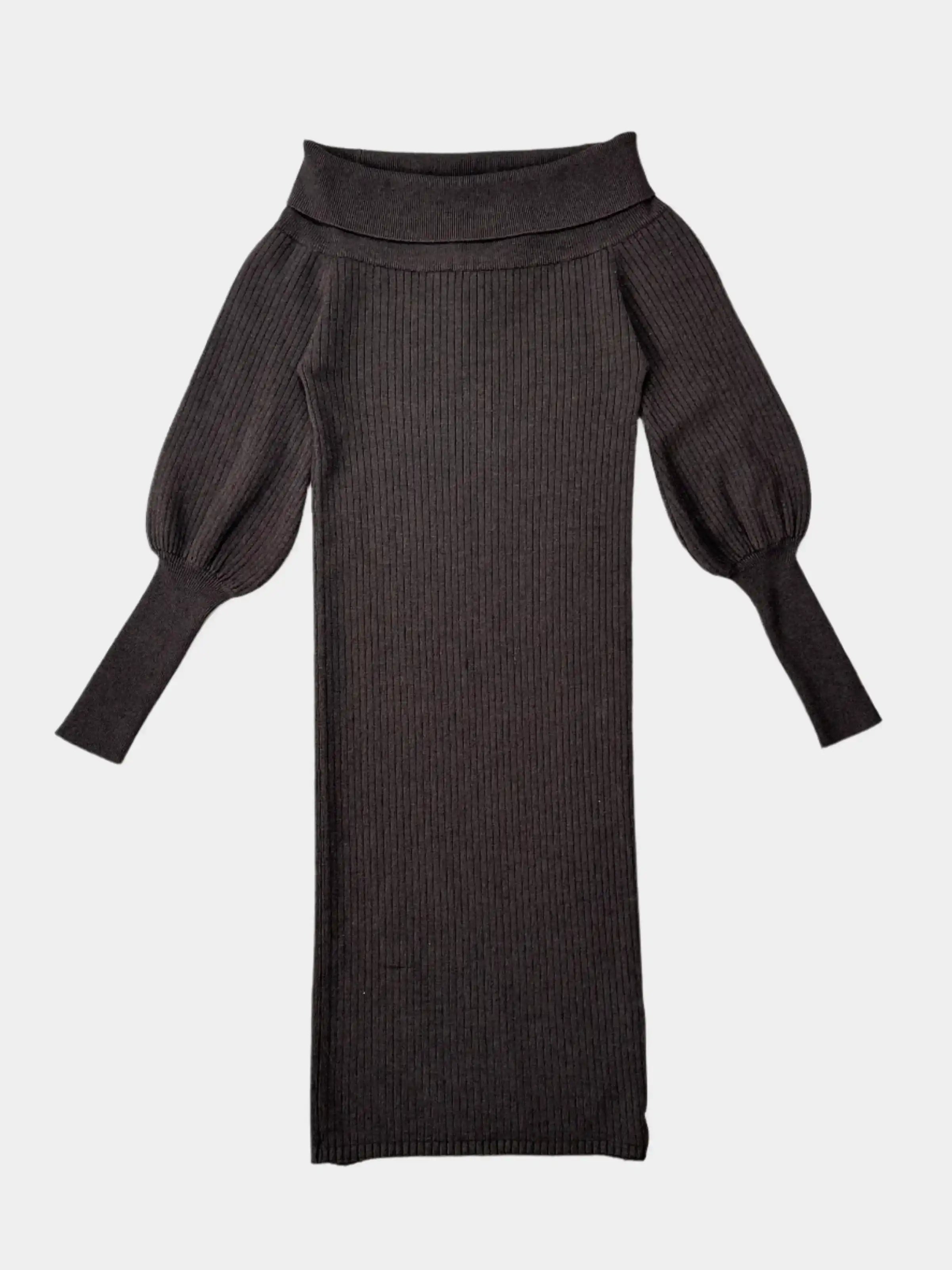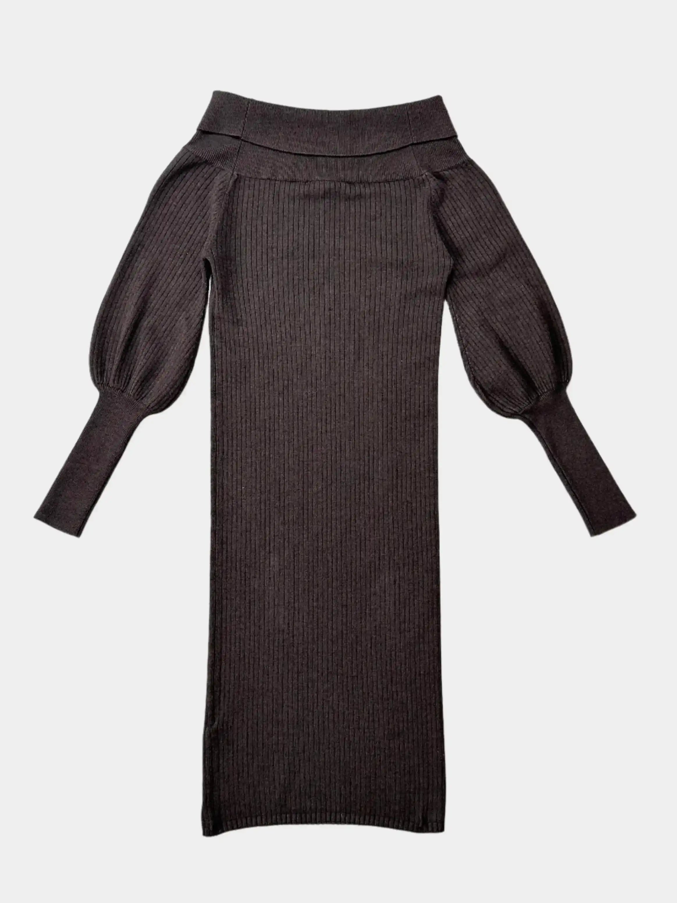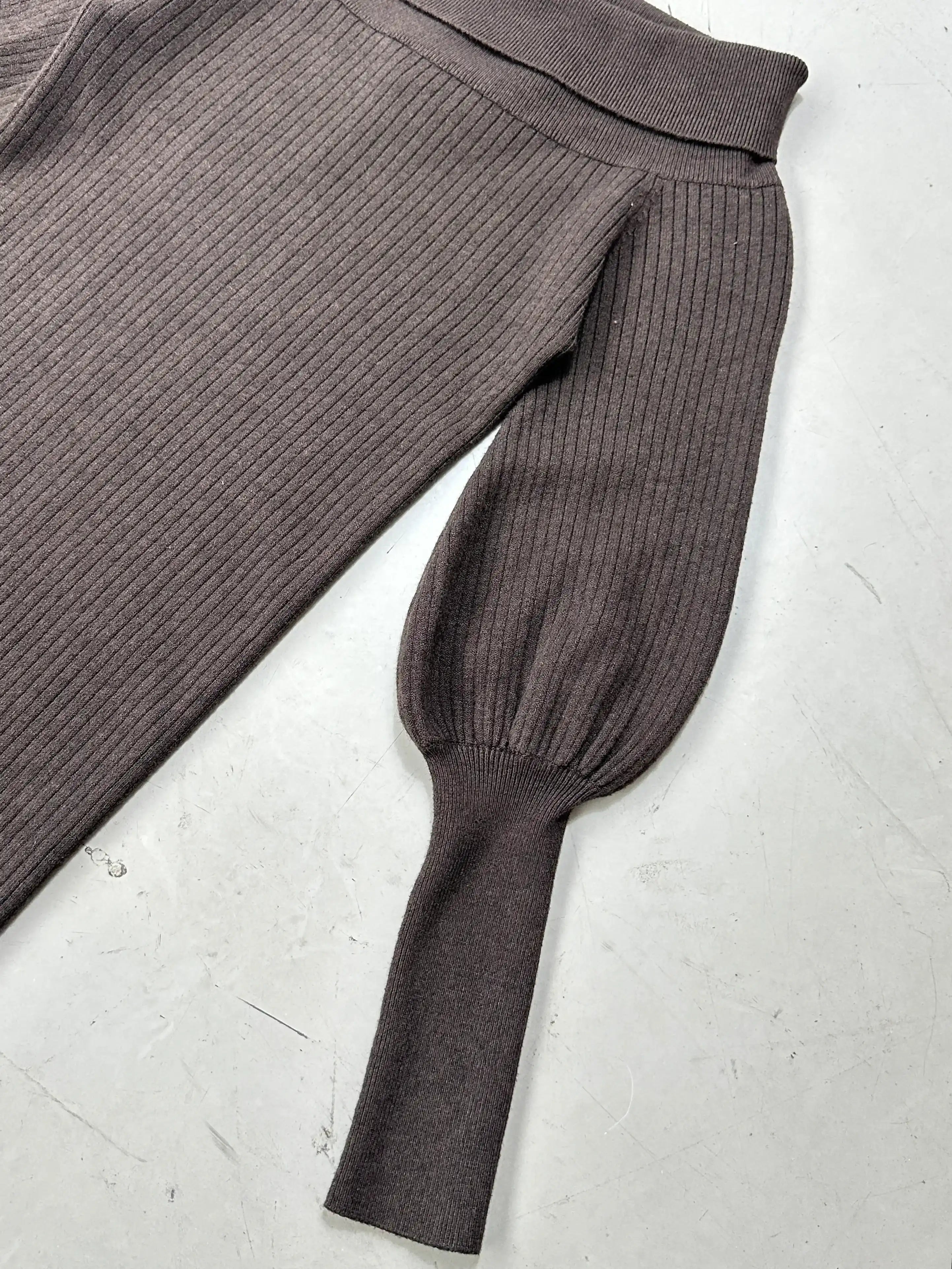 A refined and contemporary design, designed to flatter the figure. This dark brown ribbed knit dress combines comfort and femininity thanks to its slim fit, balloon sleeves with fitted cuffs, and turn-down collar. The label detail at the hem adds a distinctive and modern touch. Perfect for both day and night.