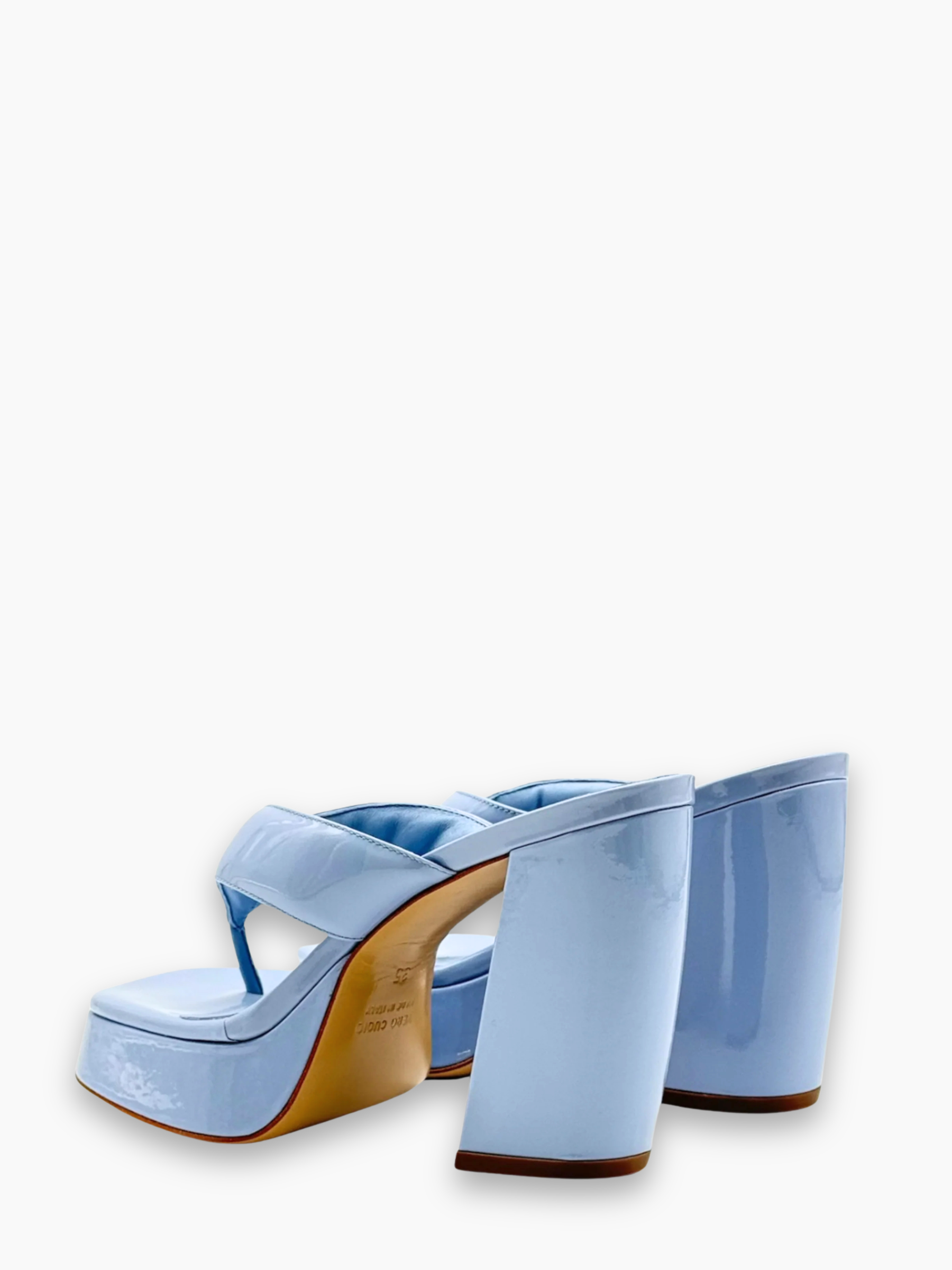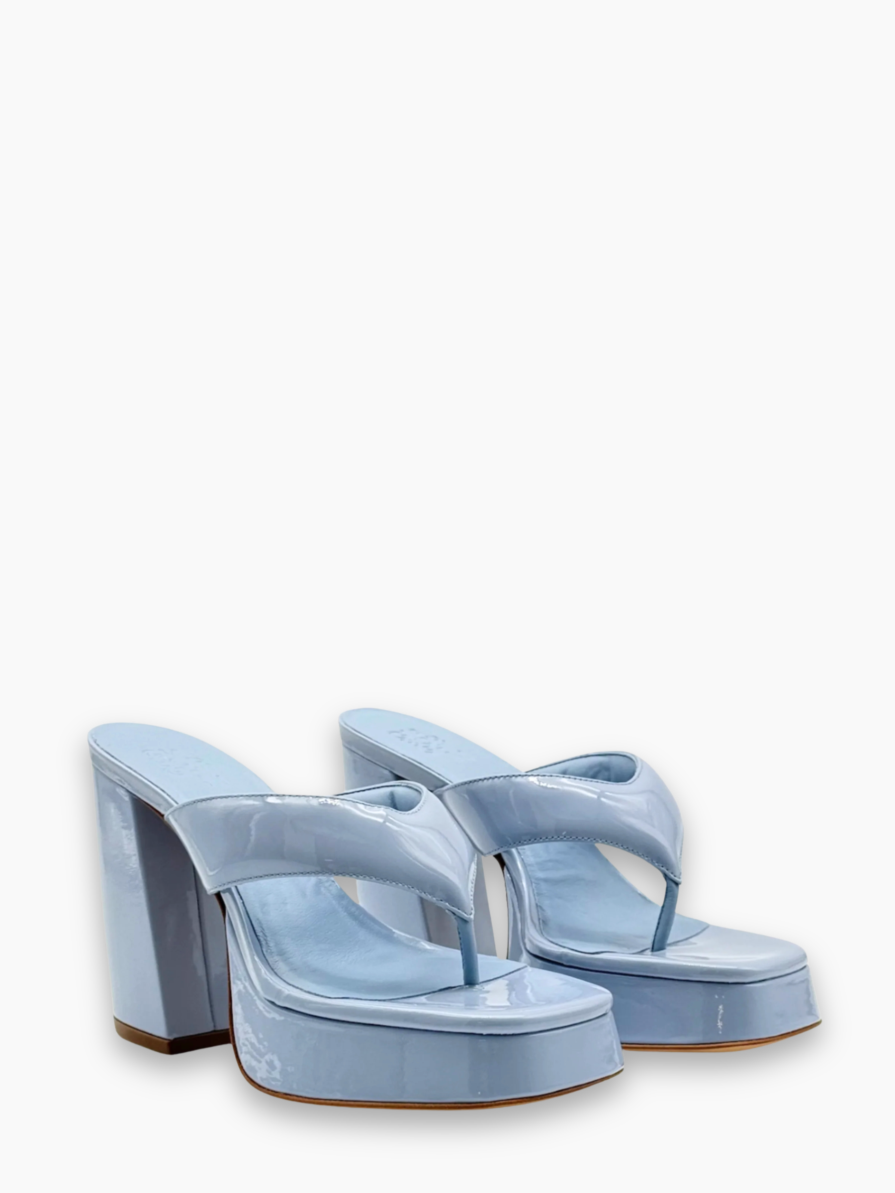 Sculptural sandals by Gia Borghini, crafted from light blue patent leather. The platform style with a block heel and thong strap lends a retro yet contemporary allure, perfect for adding a statement touch to any summer look.