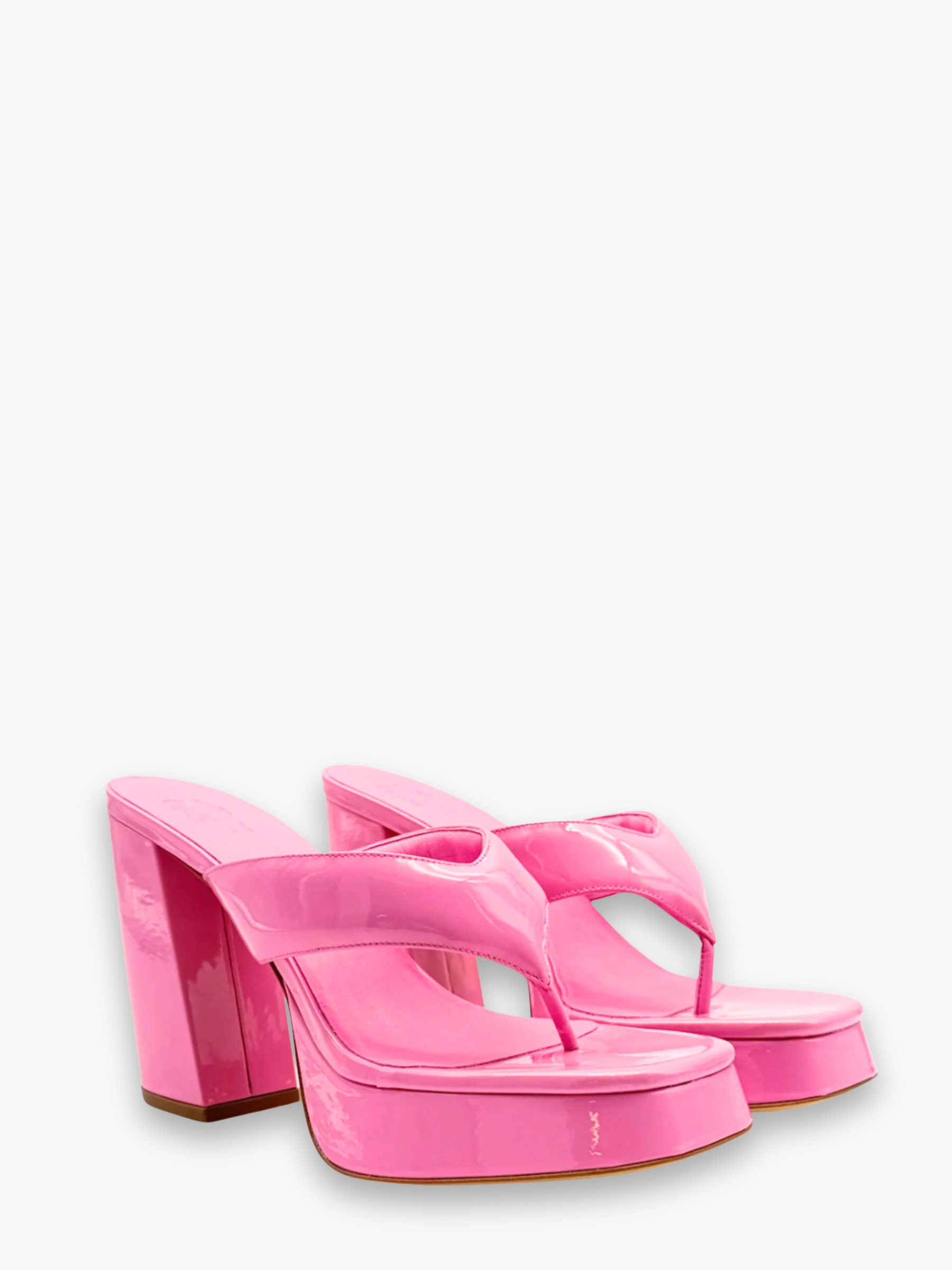 Bold and contemporary sandals by Gia Borghini, crafted from pink patent leather. The platform style with a block heel and padded toe cap combines comfort and style, perfect for adding a pop and refined touch to your summer looks.
