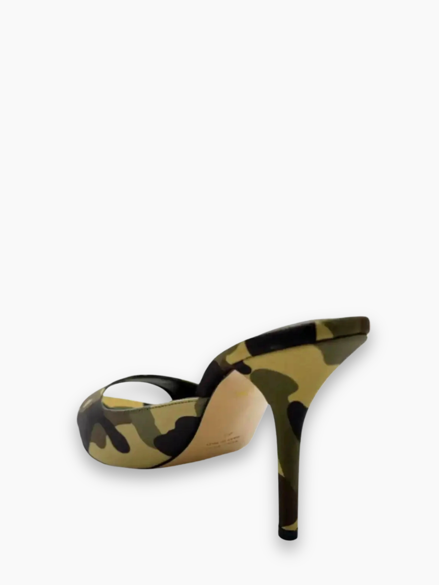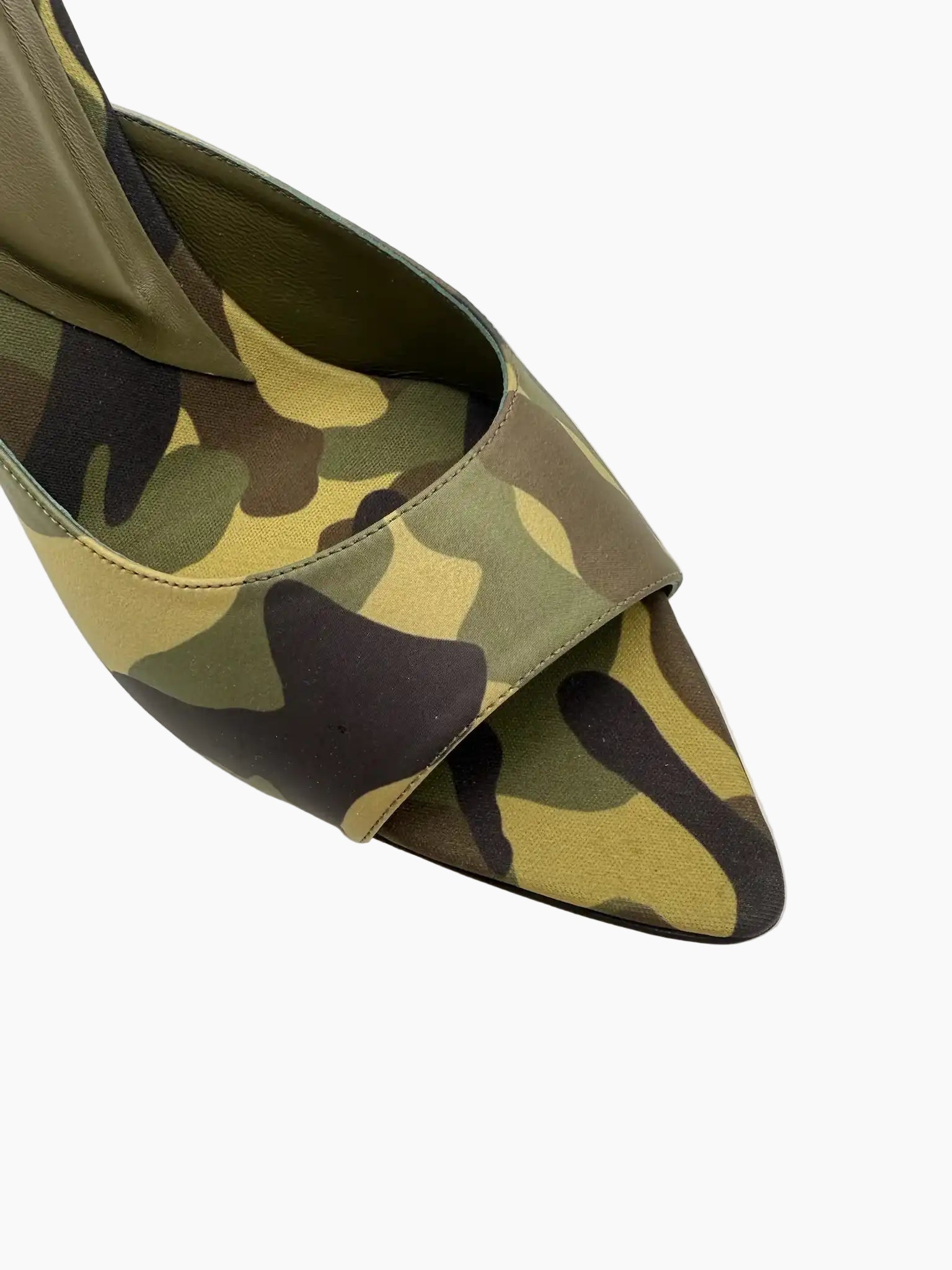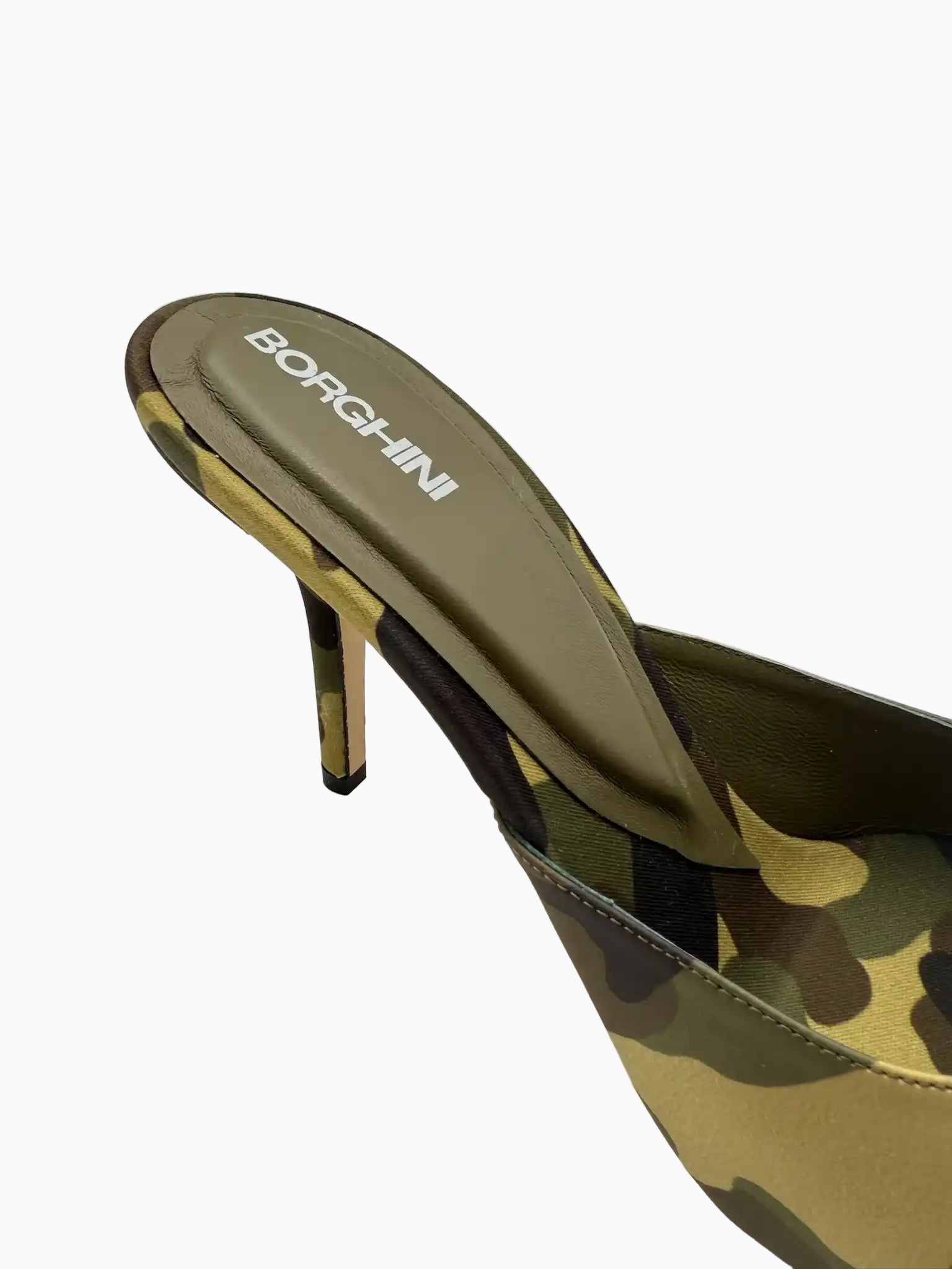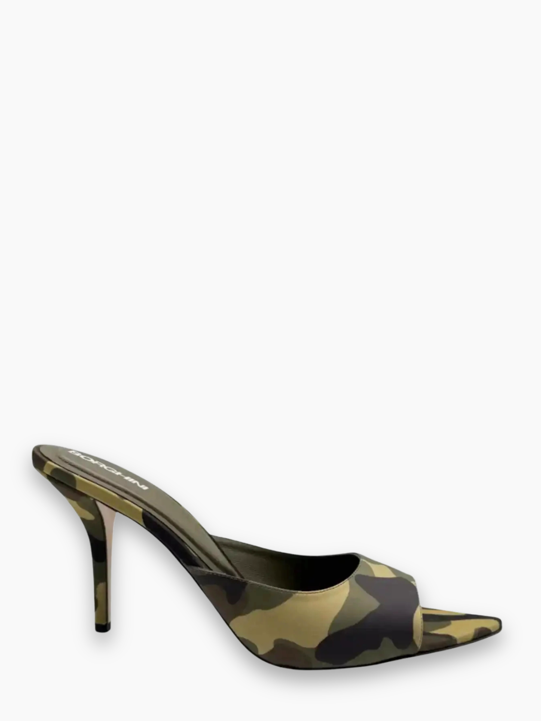 Borghini's camouflage mule sandals feature a pointed toe and a clean yet bold silhouette. The military-print upper pairs with a high stiletto heel that slims the silhouette. Perfect for adding a bold touch to evening or casual-chic looks.