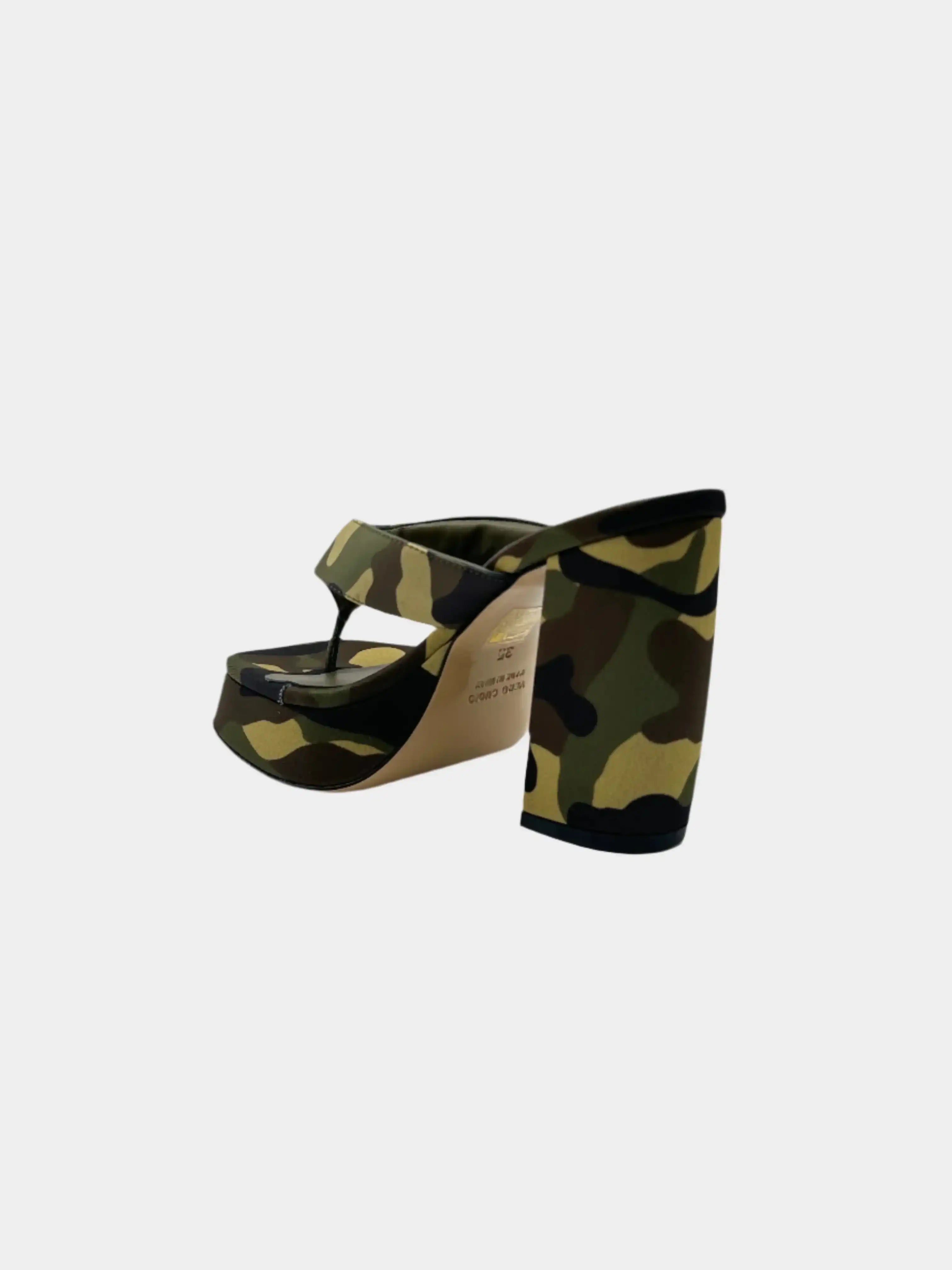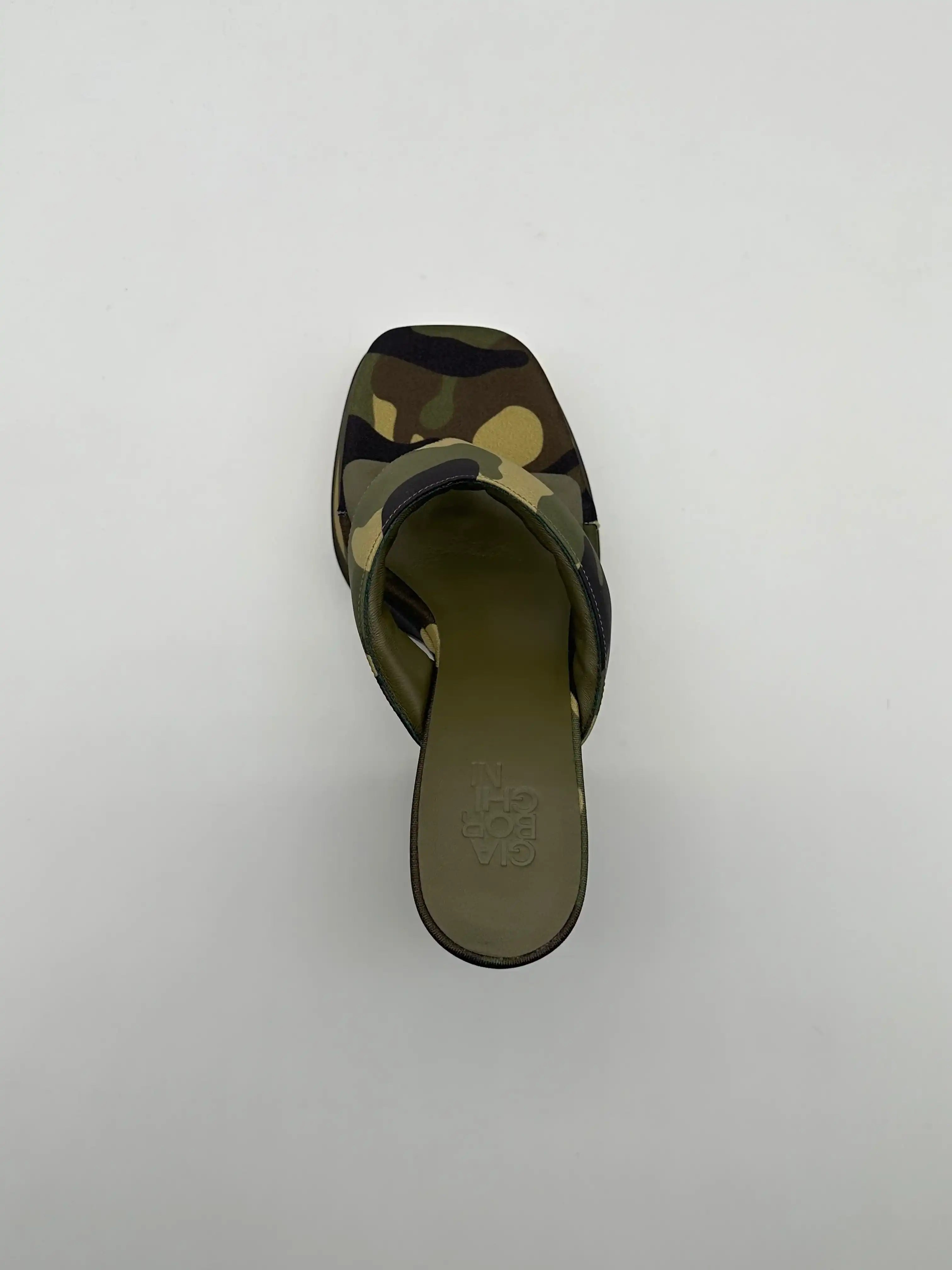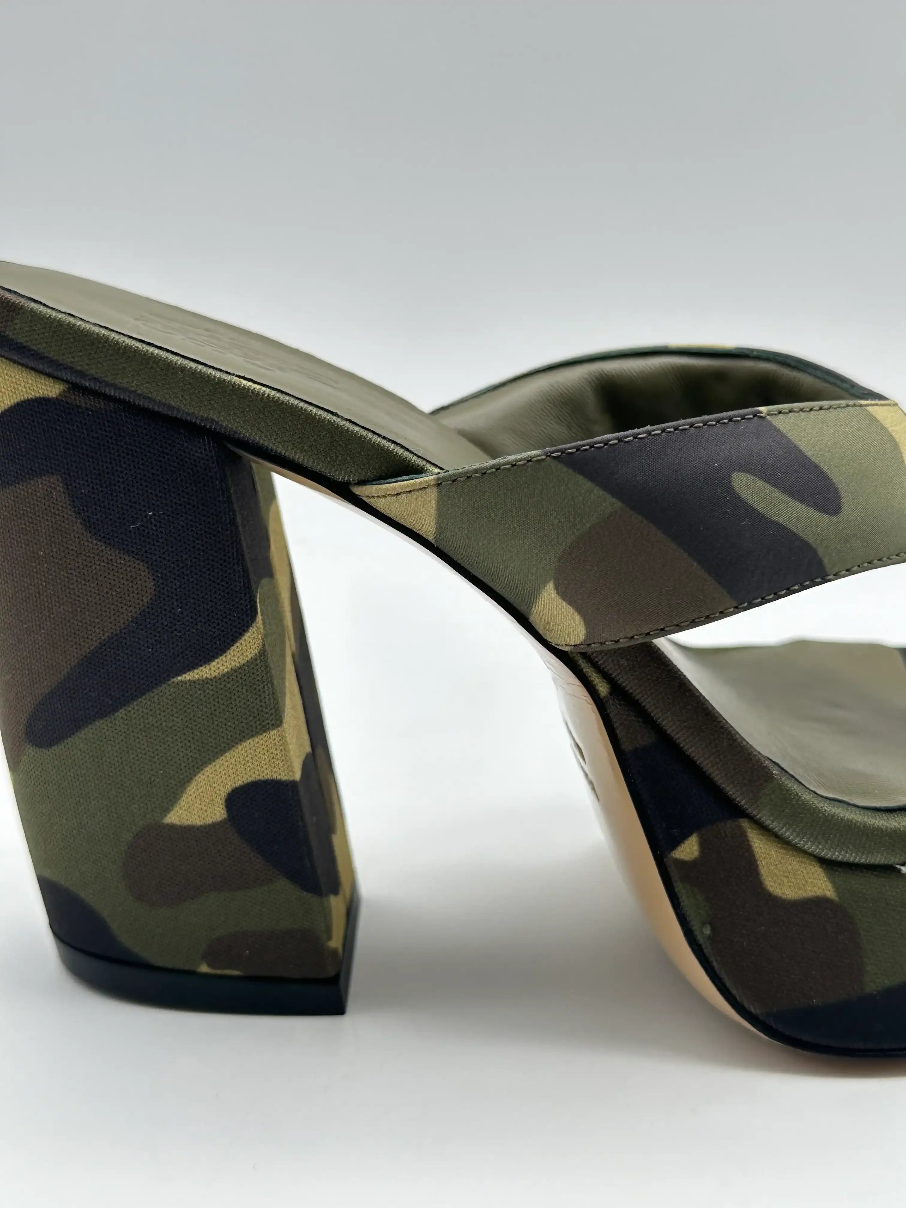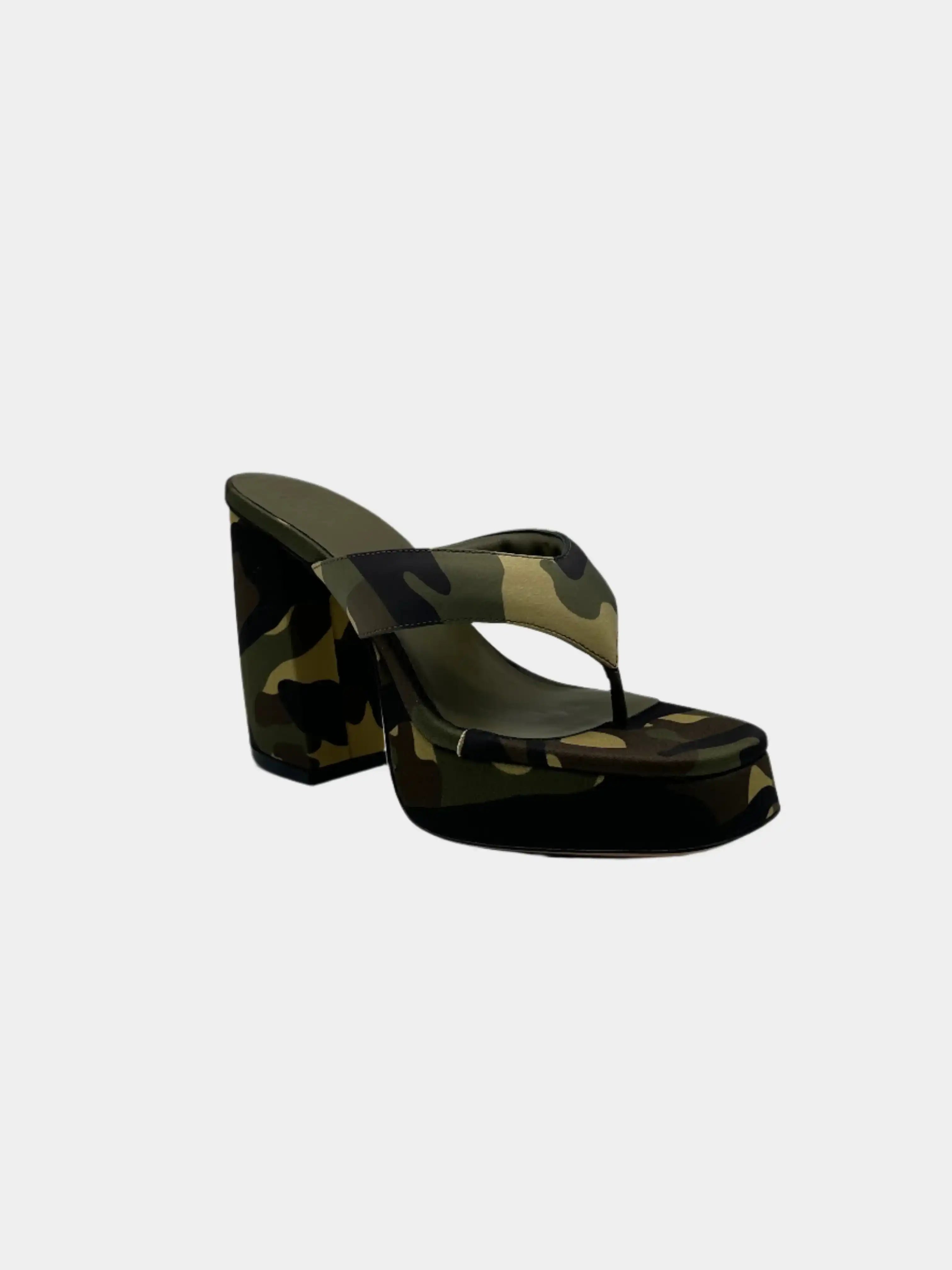 These heeled sandals by Gia Borghini stand out for their bold and decisive design. The camouflage printed fabric upper perfectly matches the voluminous structure with front platform and square heel. The flip-flop model adds a modern and casual touch, ideal for those looking for a bold but sophisticated look . The product comes with the original box