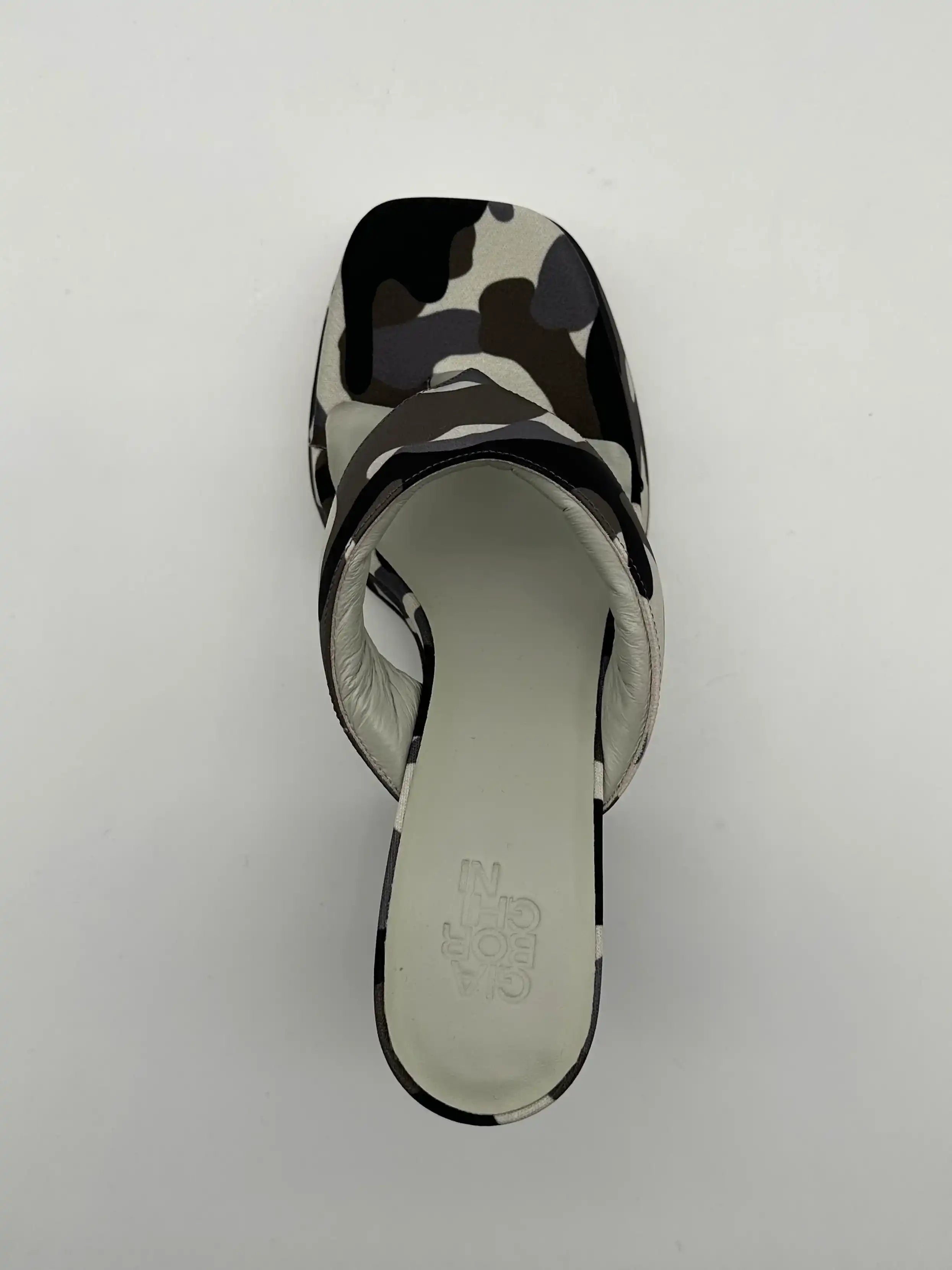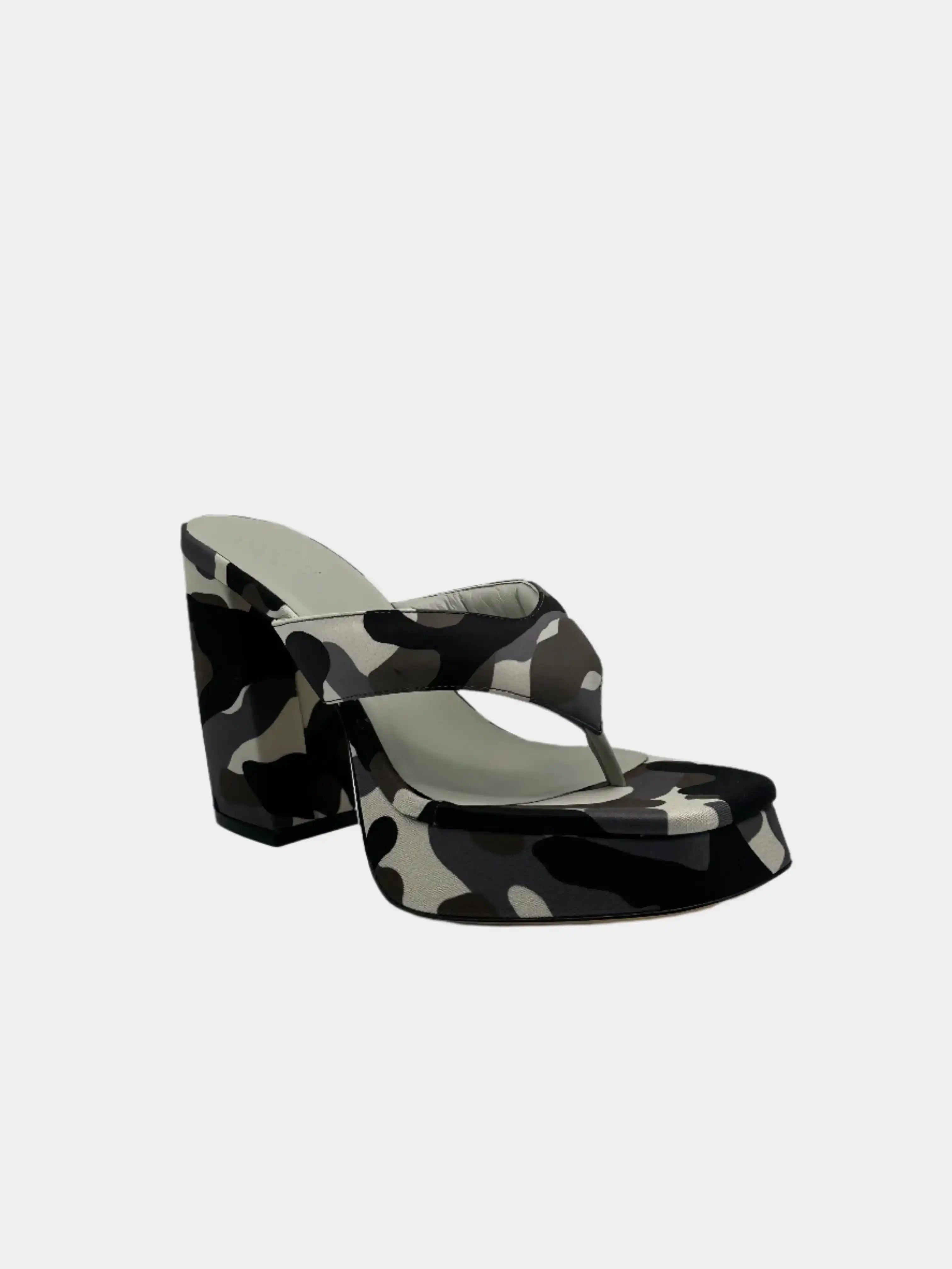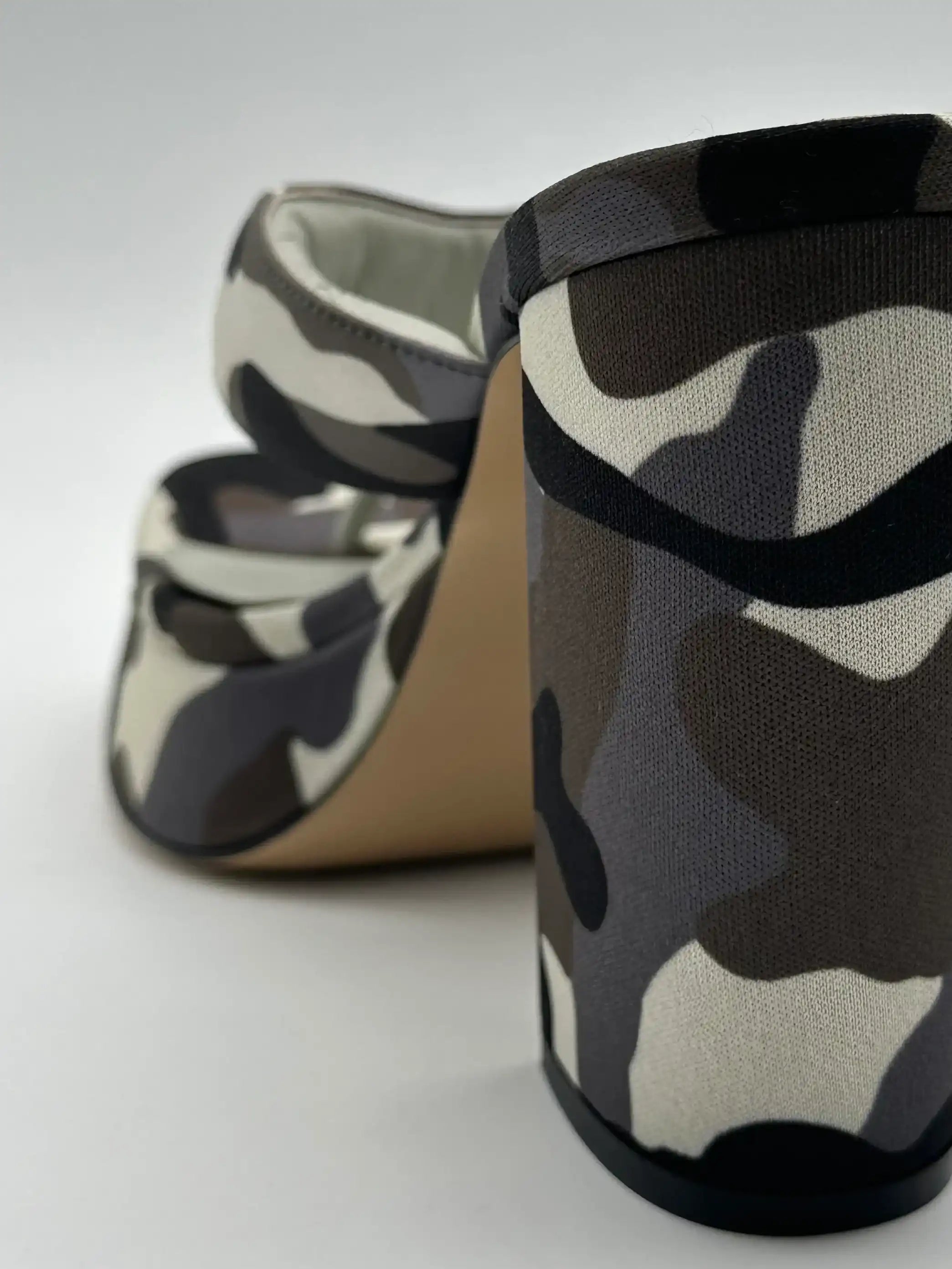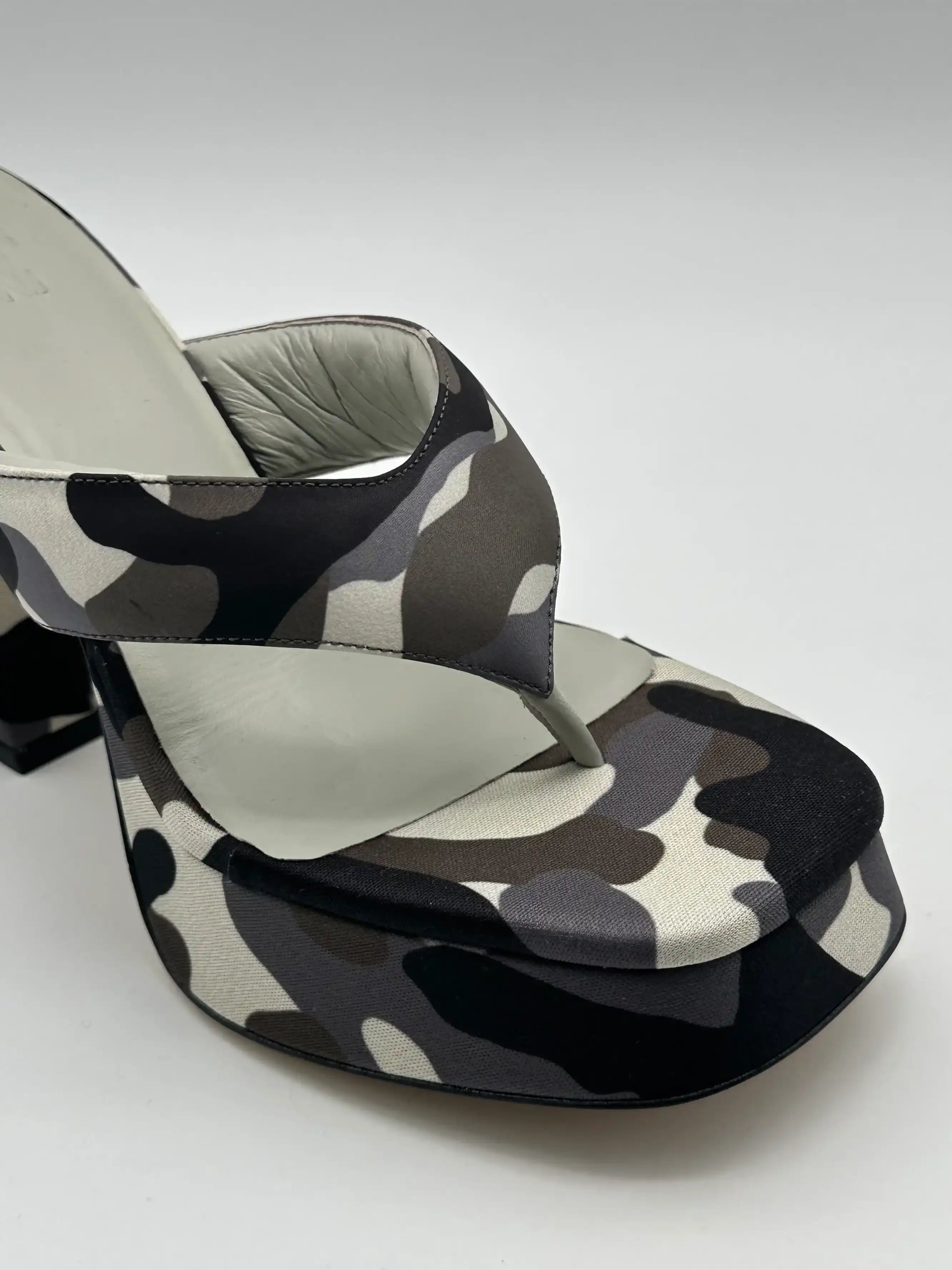 Block heel sandals by Gia Borghini, covered in camouflage fabric in shades of black, grey and beige. Featuring a square toe, padded band and leather footbed, they are completed with a solid structured heel and a tonal covered platform. A bold mix of urban style and architectural design.