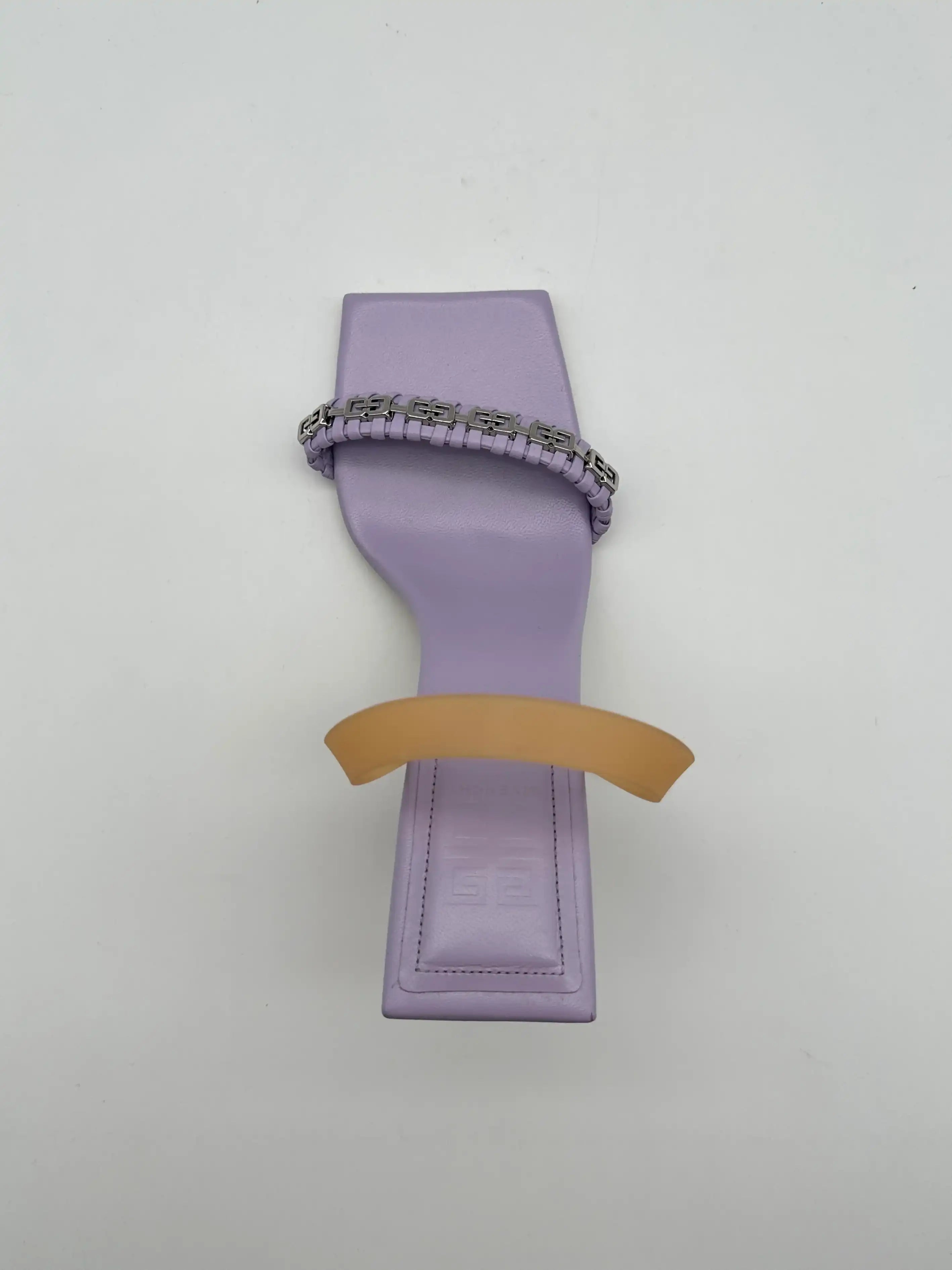 An elegant and modern sandal, made of lilac leather with a transparent strap on the heel and a braided front band embellished with a silver metal chain. The slender silhouette and square toe give the model a contemporary and sophisticated aesthetic. Ideal for completing evening looks or sophisticated daytime outfits.