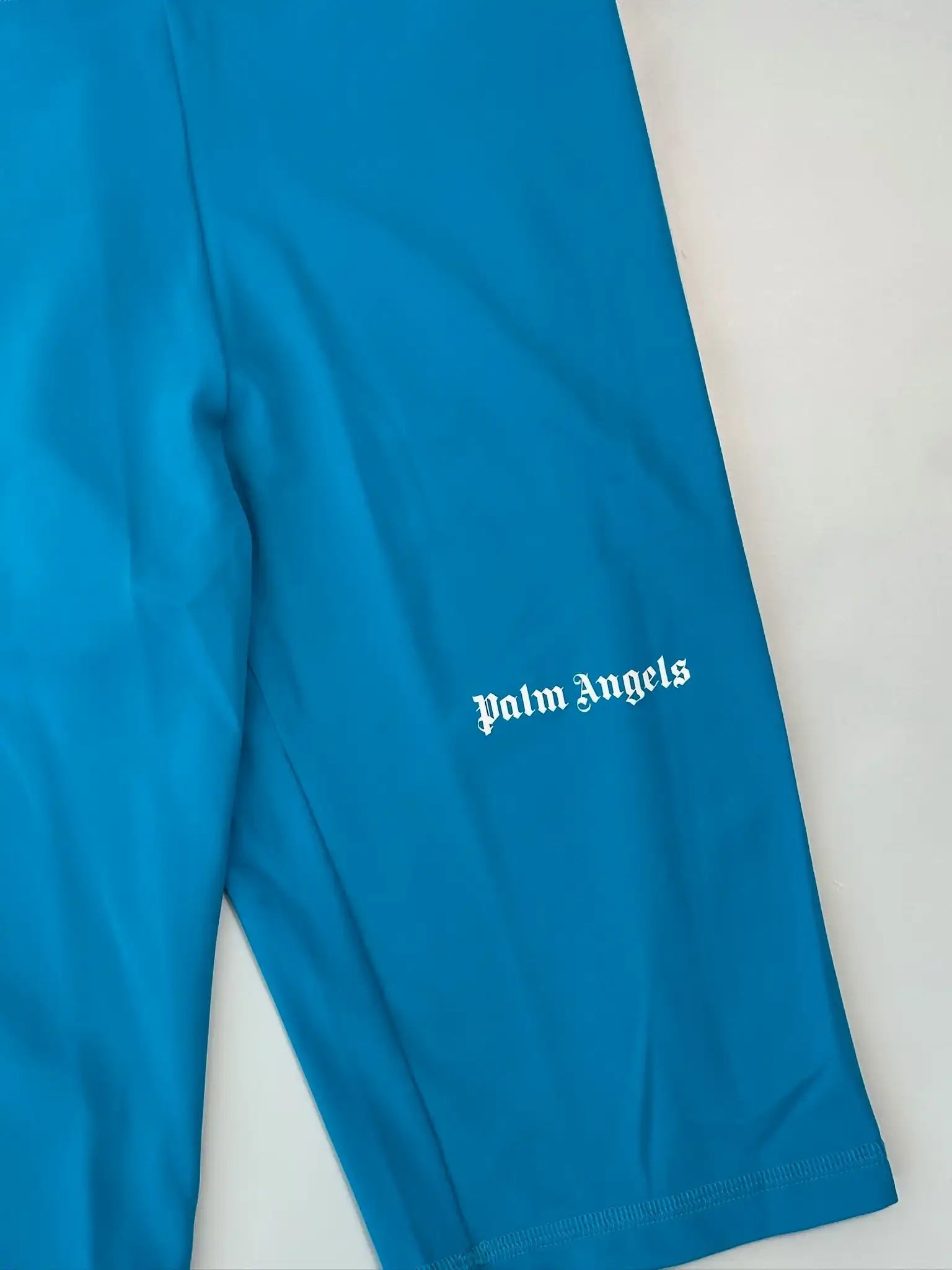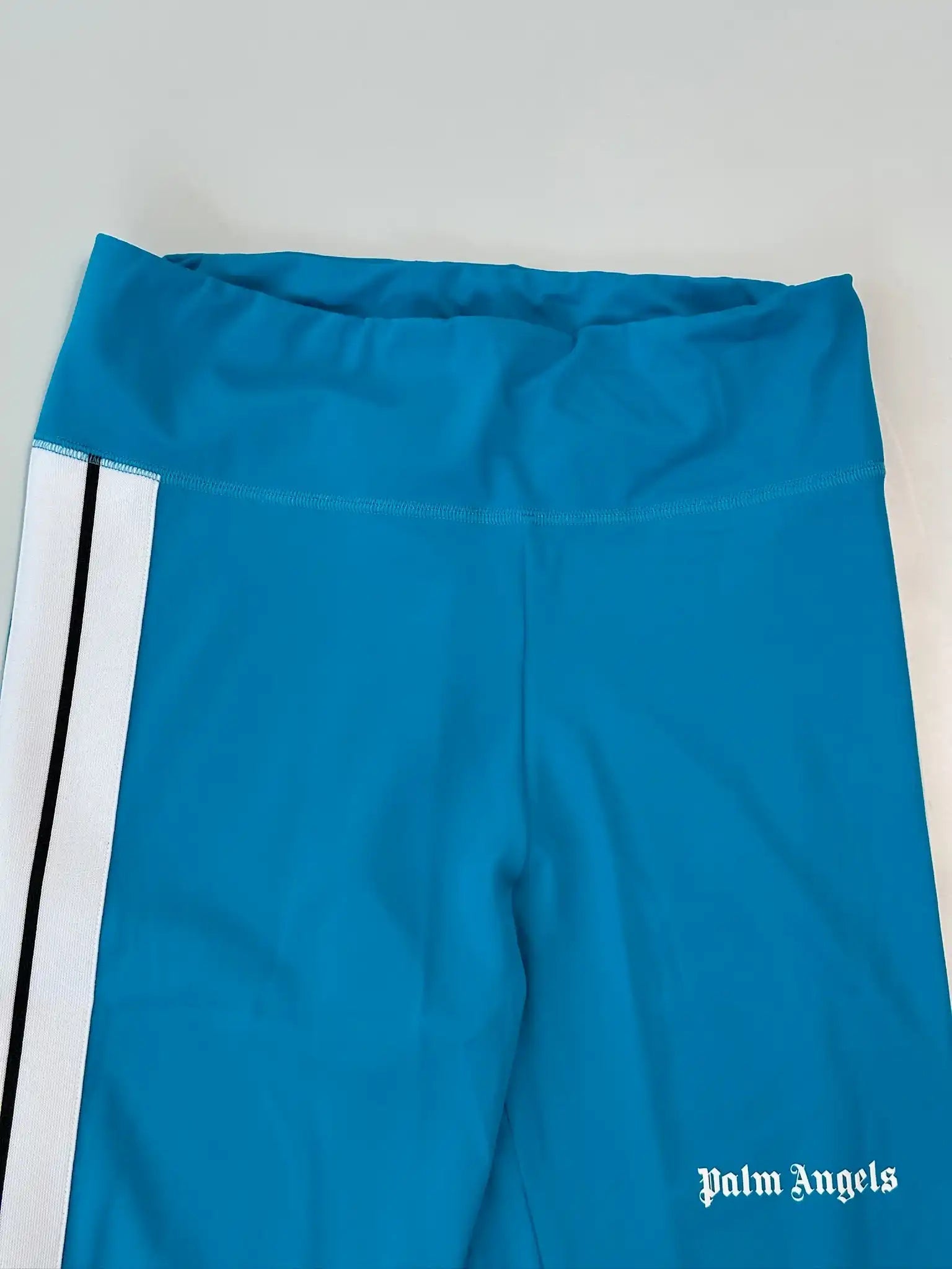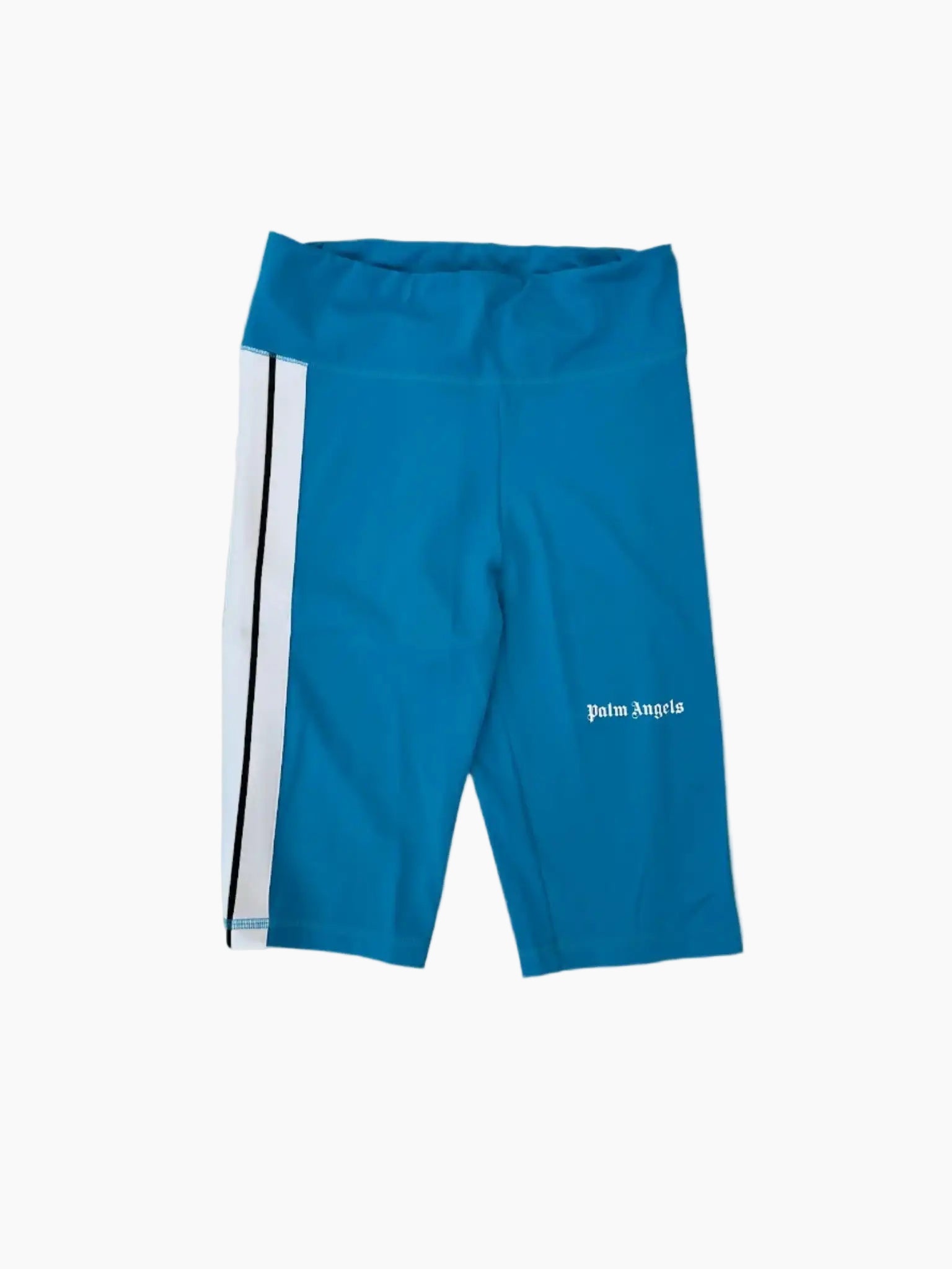 Palm Angels cycling shorts stand out for their sporty and bold style. Made from stretch technical fabric, they feature an eye-catching blue colorway with contrasting white side stripes and a white Palm Angels logo printed on the leg. Designed for training and leisure, these shorts hug the body with a snug and comfortable fit, creating a dynamic, urban look. Ideal for pairing with cropped tops or oversized sweatshirts for a contemporary streetwear style.
