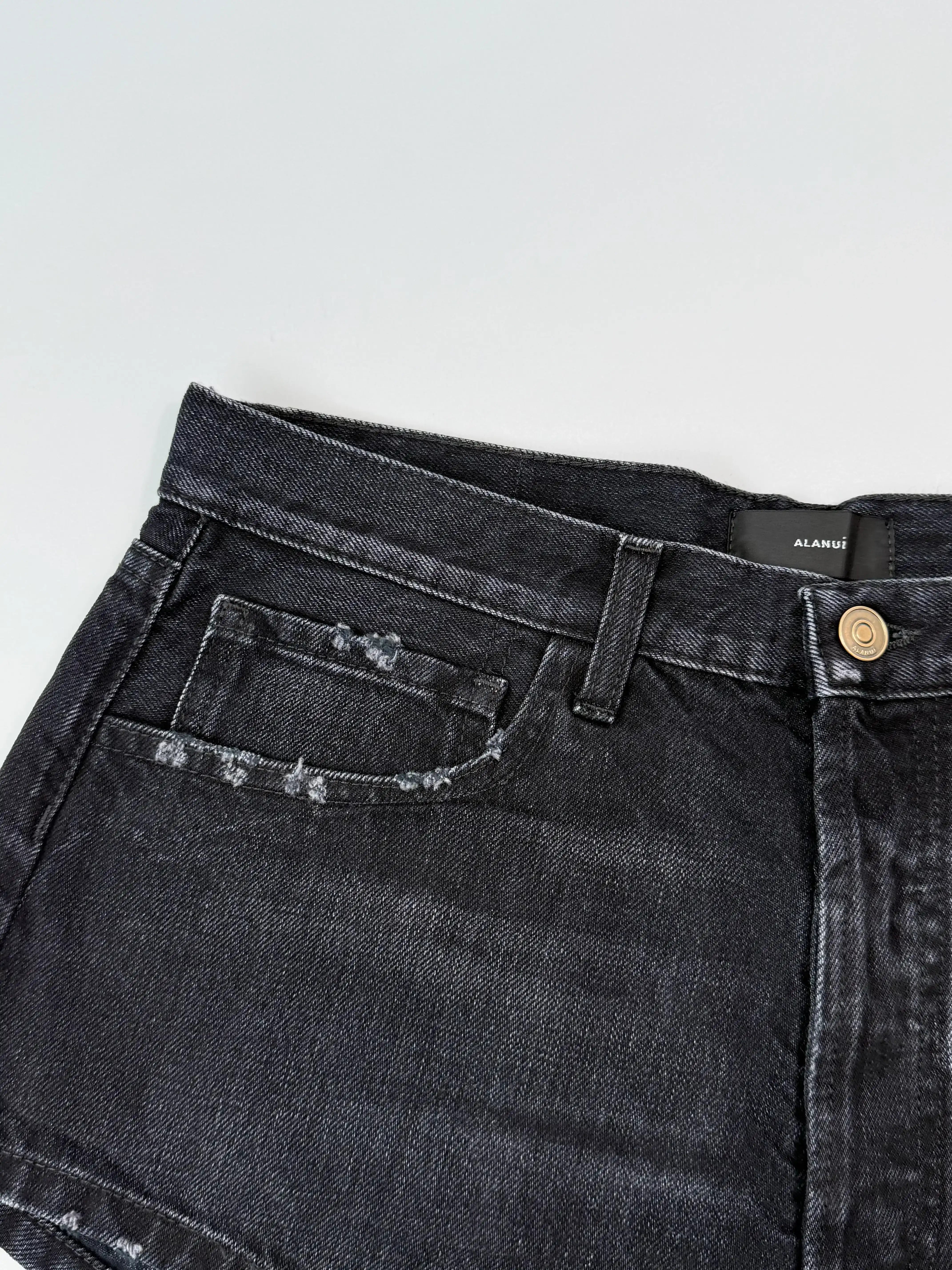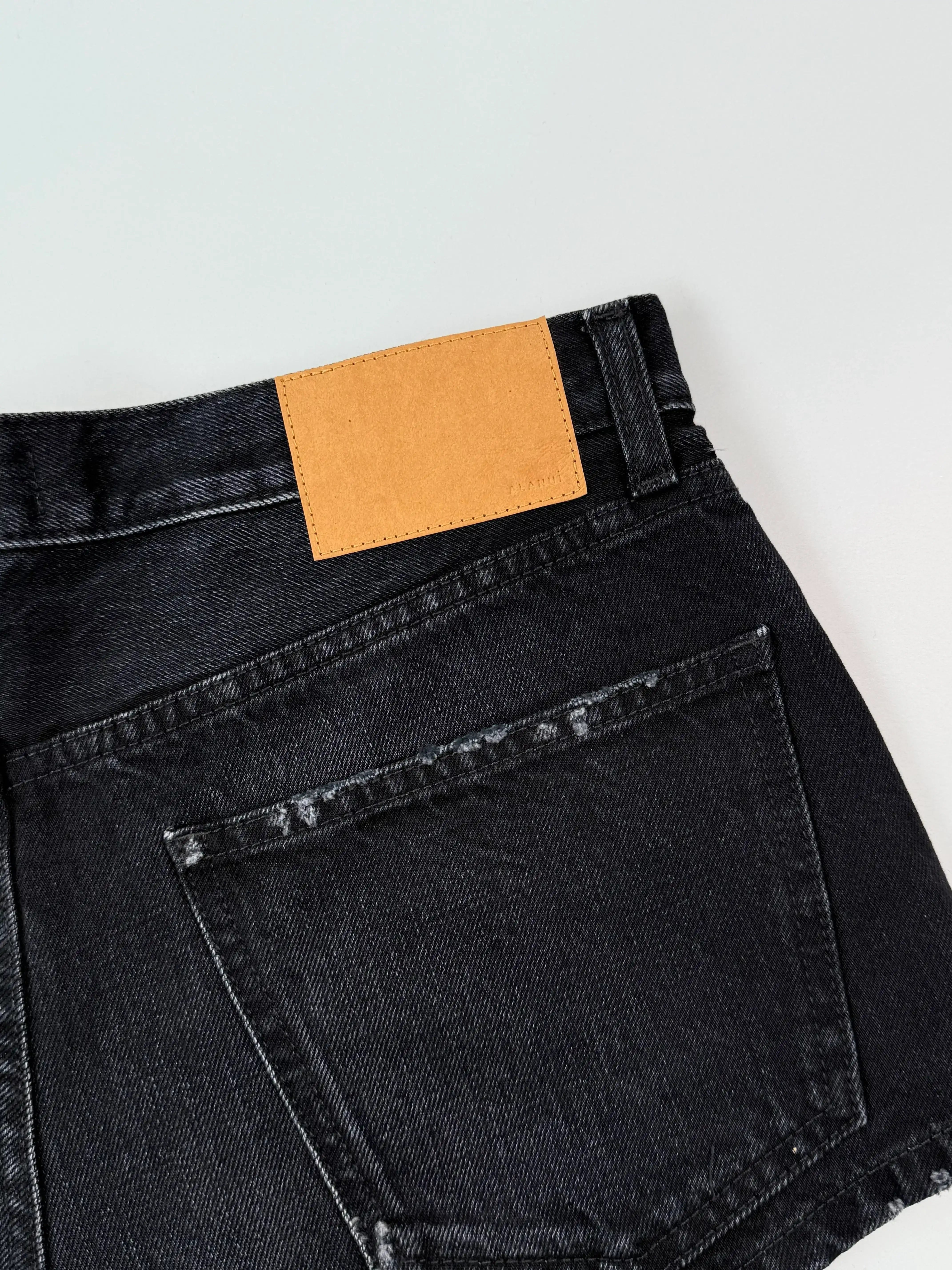 With a bold, contemporary design, these black denim shorts feature a cropped fit and a tapered silhouette that's perfect for flattering the figure. The slightly faded wash and raw hem give them a rugged appeal, perfect for summer outfits with an urban edge.