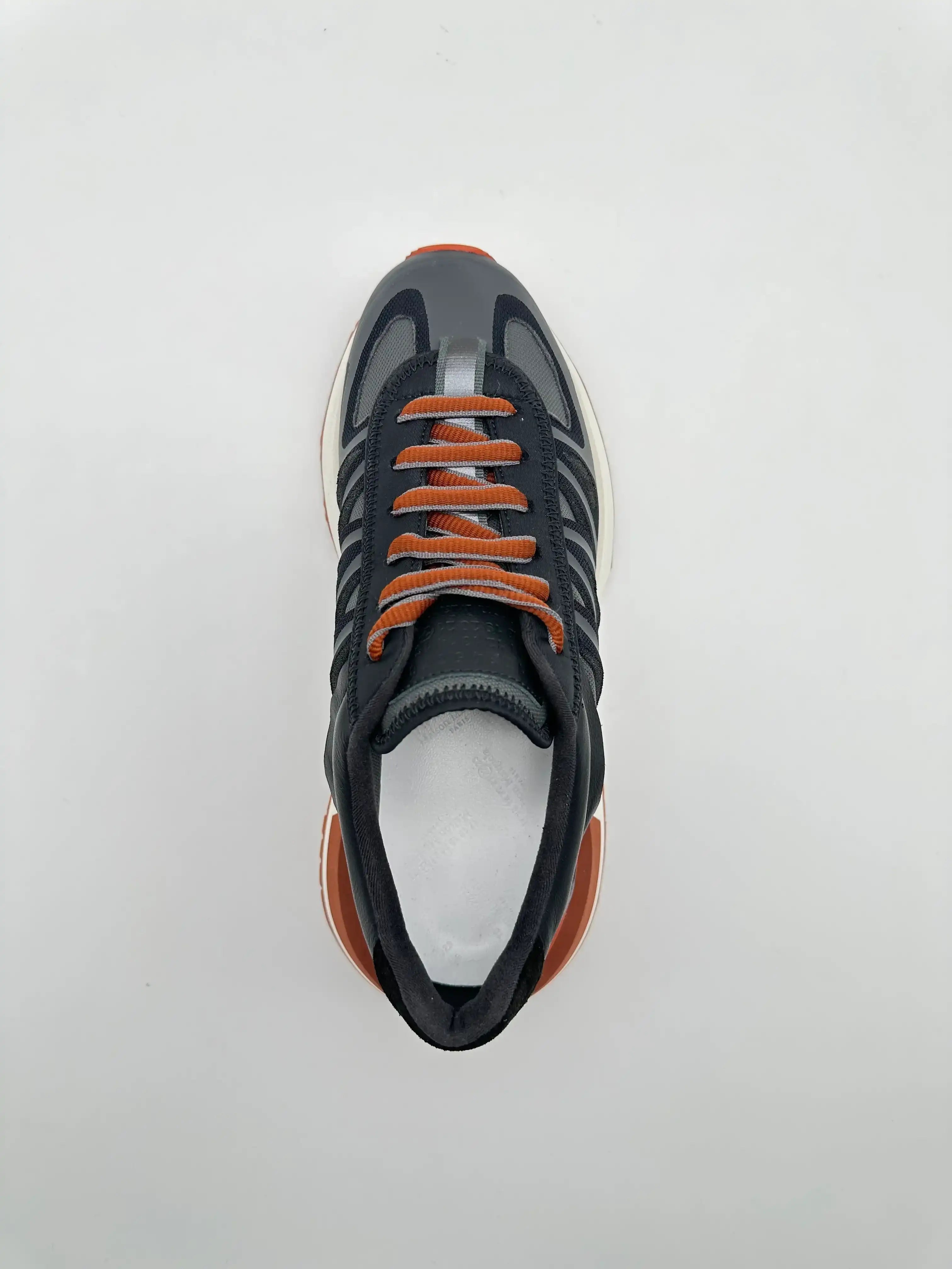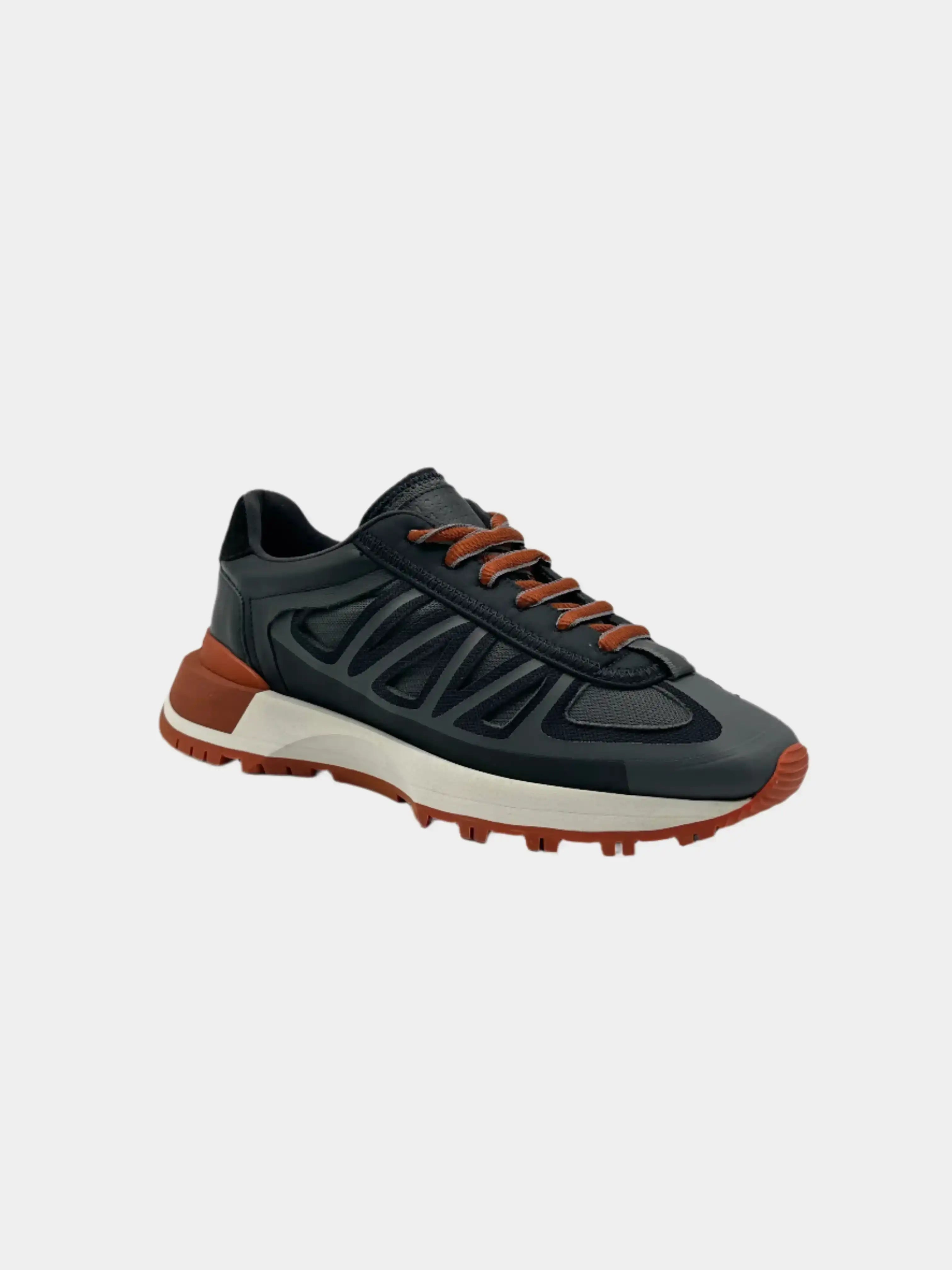 This running sneaker by Maison Margiela combines technical aesthetics and sophisticated details. Crafted in a combination of mesh, smooth leather and rubberised inserts, it features a chunky two-tone rubber sole with a serrated profile and contrasting orange laces. A shoe designed for those seeking a contemporary urban style with sporty and sophisticated accents.