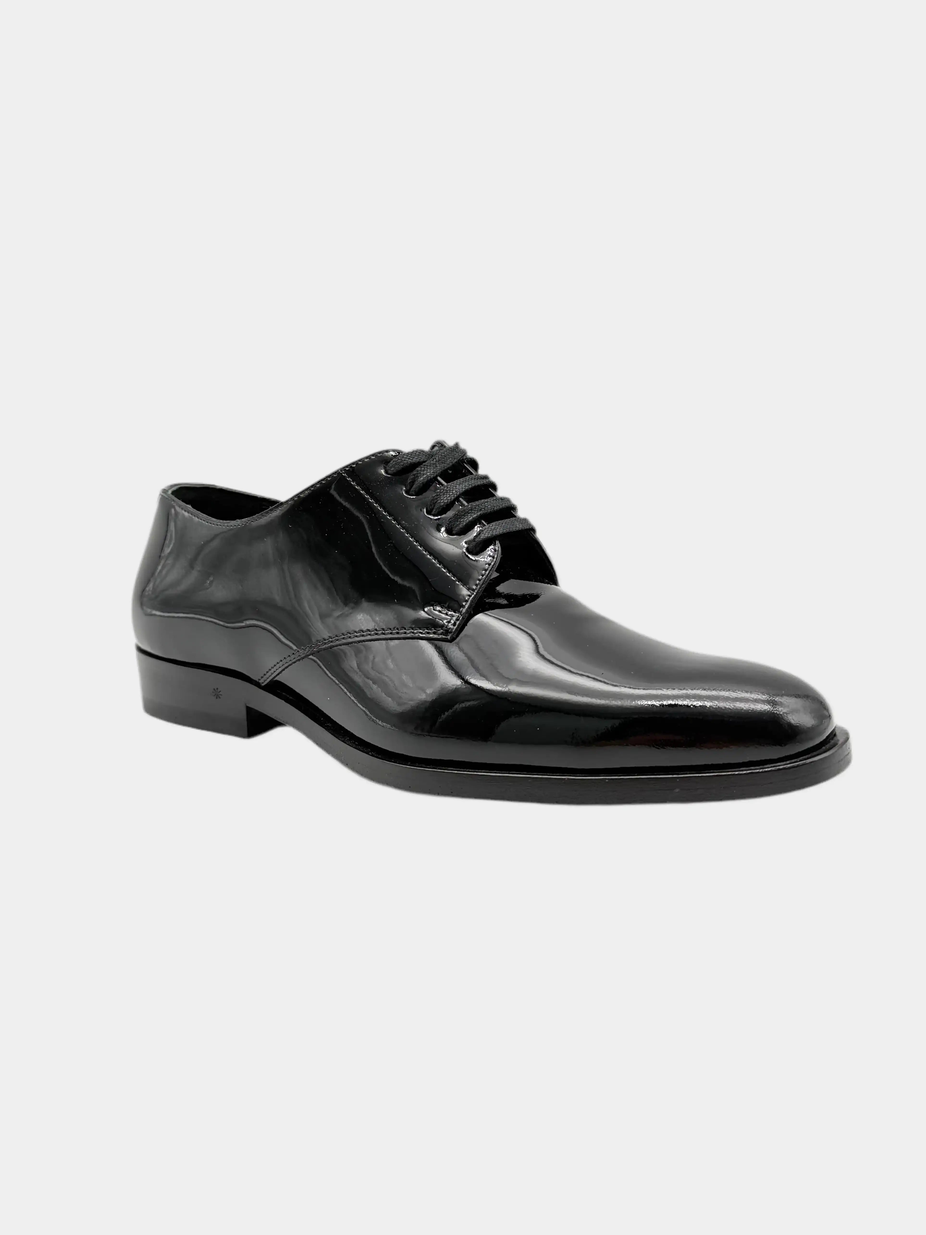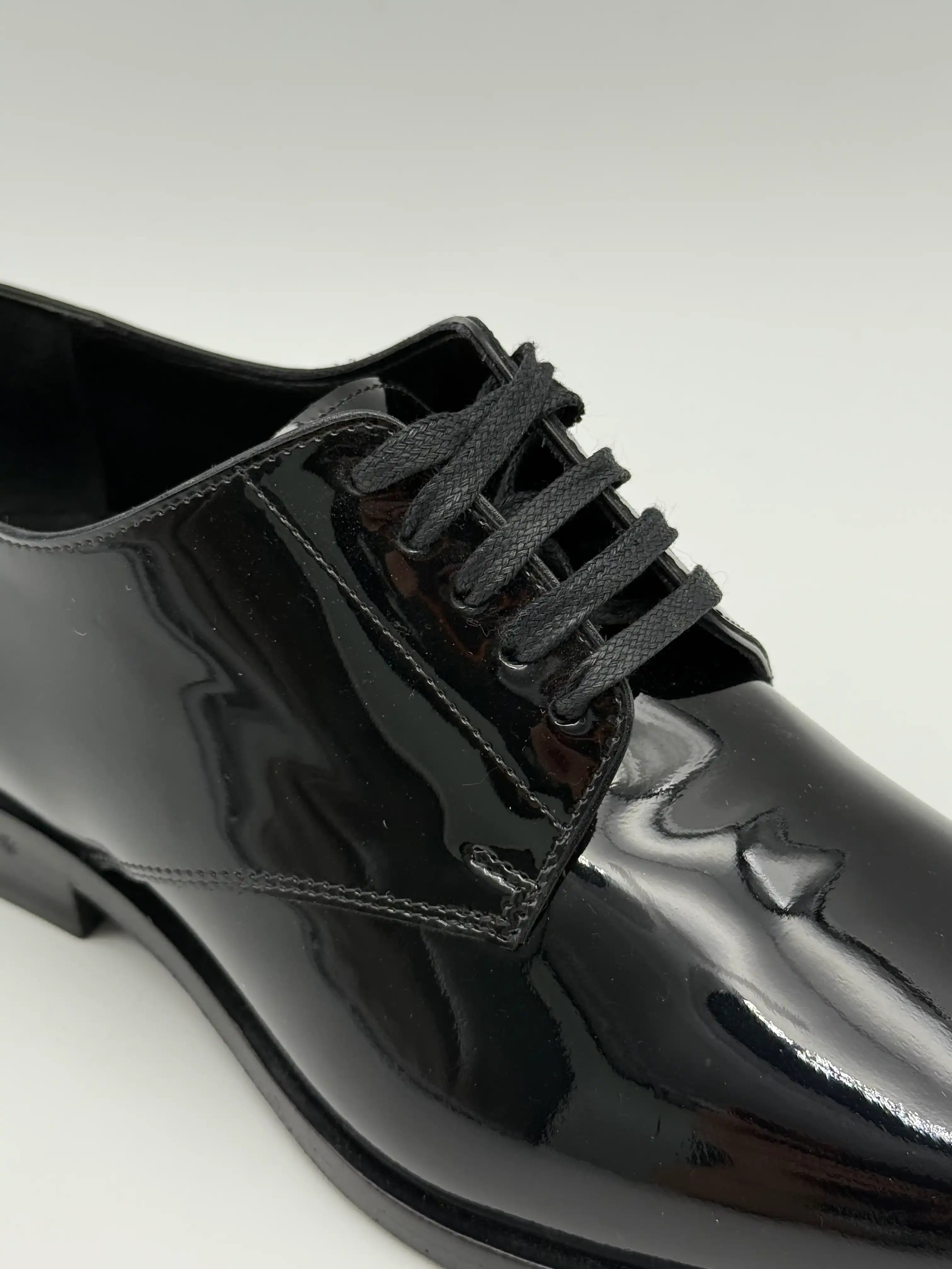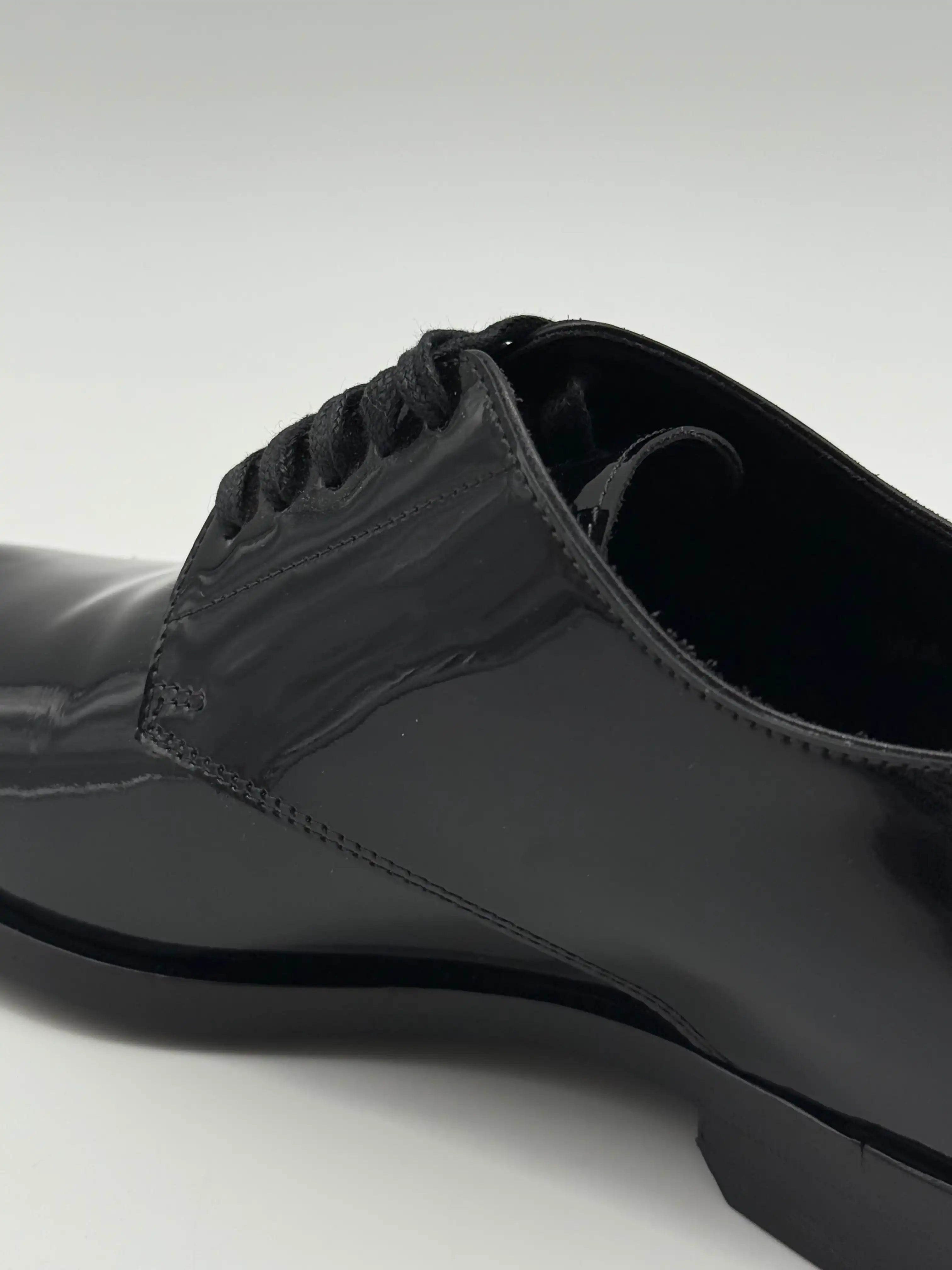 These black patent leather Saint Laurent lace-ups are the perfect balance between classic elegance and contemporary attitude. The tapered silhouette, glossy finish and craftsmanship make them a must-have for any sophisticated wardrobe. Ideal with tailored suits or minimal looks, they represent an exclusive detail that adds further value and uniqueness.