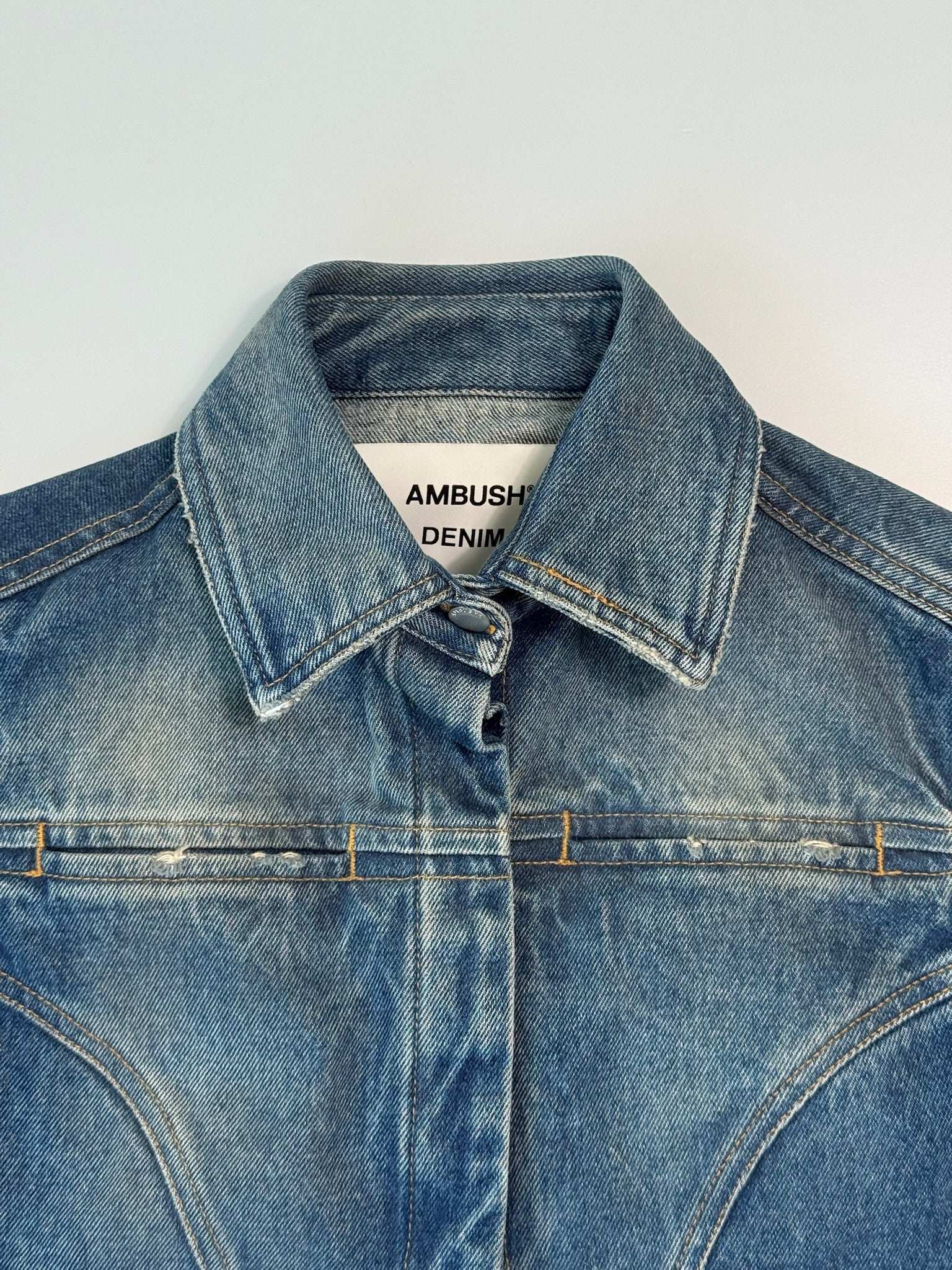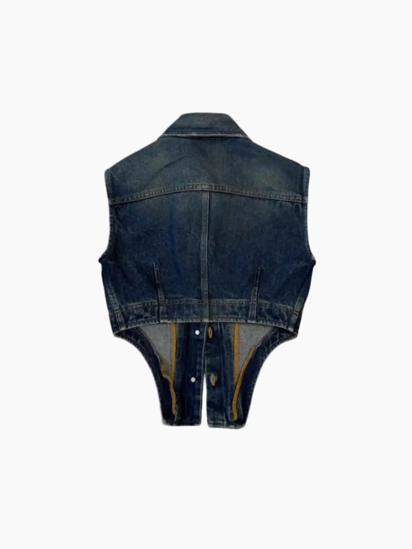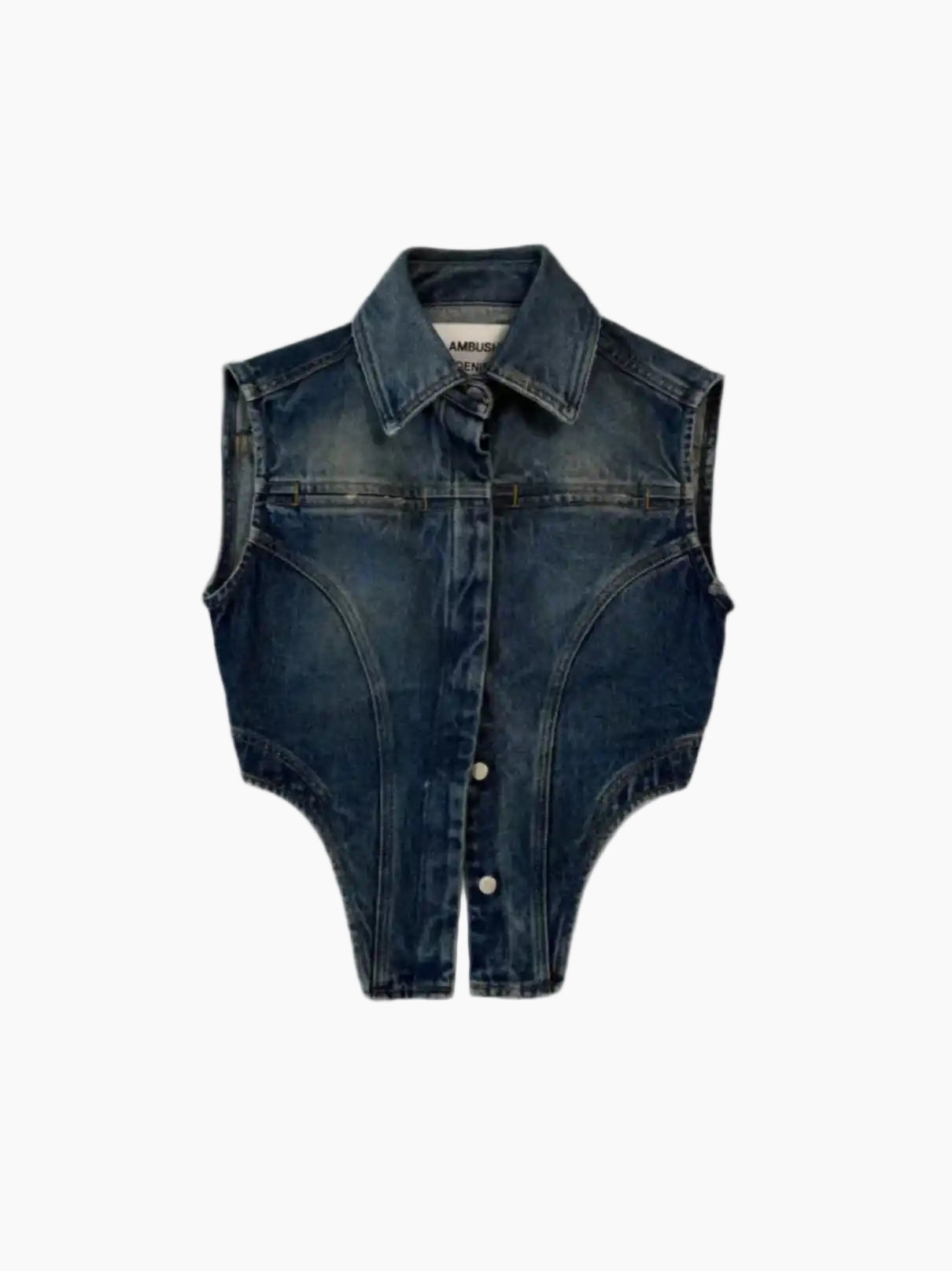 The Ambush top in blue denim reinterprets the classic denim jacket in a contemporary and experimental way. Featuring a sleeveless cut and a fitted silhouette with a rounded bottom and snap buttons, it is a bold and decisive piece. Ideal for layering looks or to give an innovative and characterful streetwear touch to your outfits.