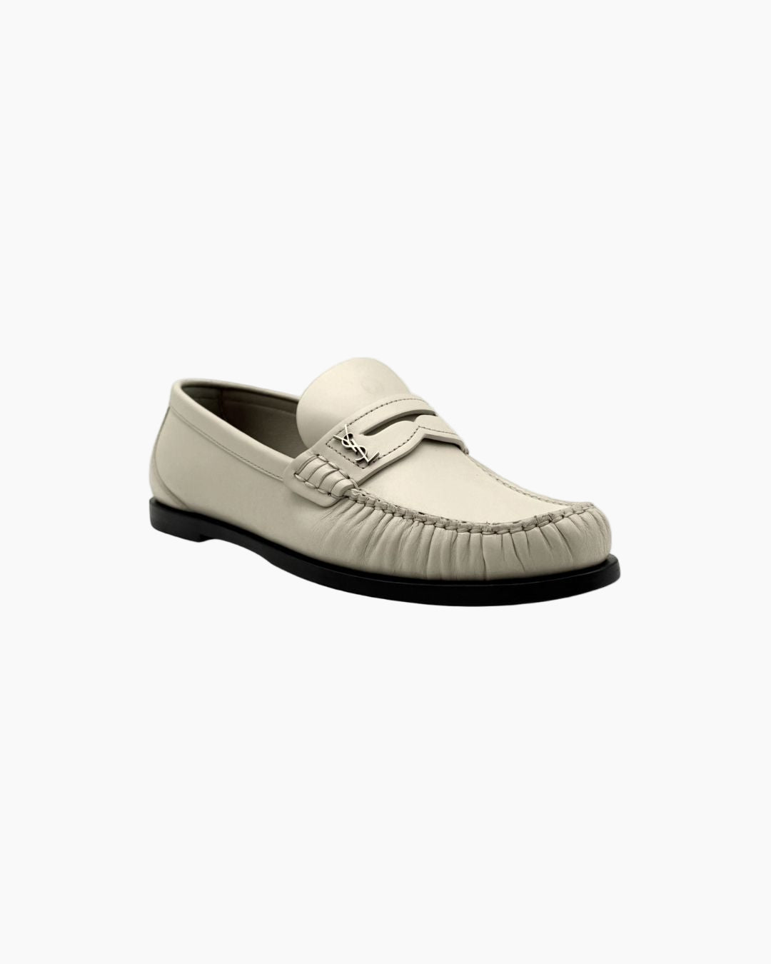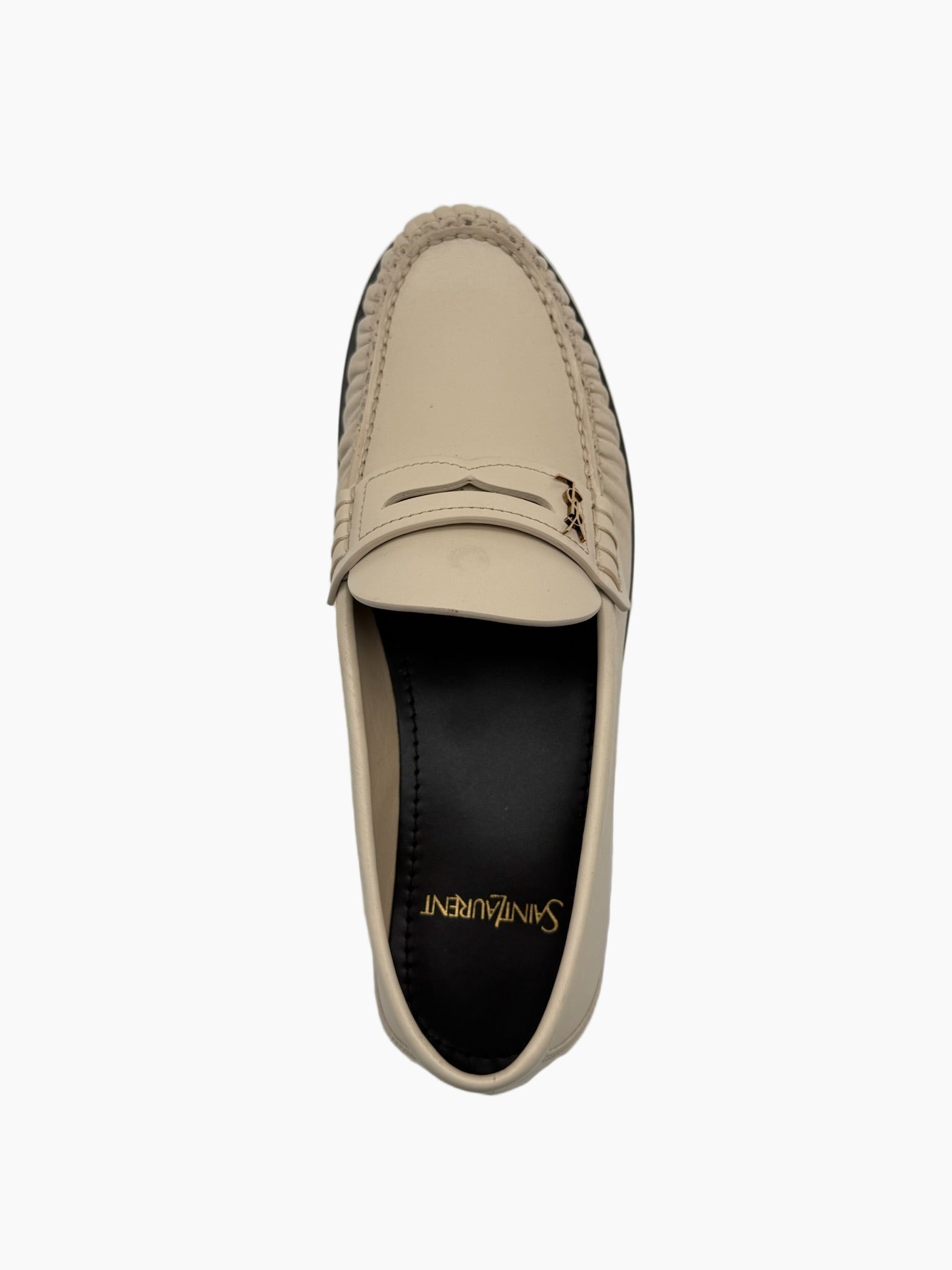 These cream Saint Laurent loafers combine the refinement of classic design with modern, distinctive details. Crafted from soft, smooth leather, they feature a gold-tone metal YSL logo vamp and a clean, elegant silhouette. Versatile and timeless, they're perfect for both refined and casual looks.
