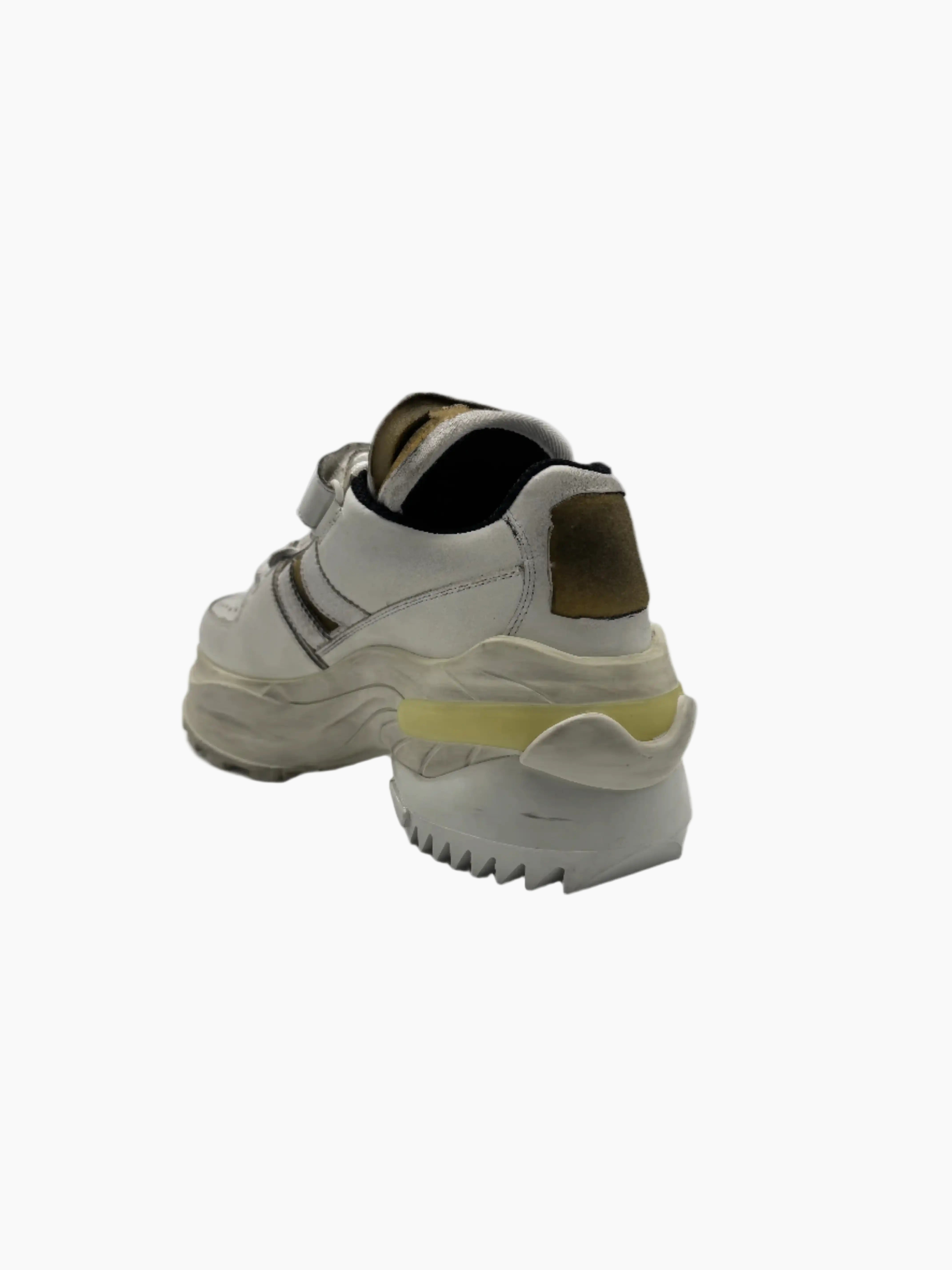 The Reebok shoes in collaboration with Maison Margiela reinterpret the classic sports model in a conceptual key. The white leather upper with yellow and brown details is combined with a sculpted chunky sole, giving a futuristic and structured aesthetic. Perfect for those looking for an urban and distinctive look.
