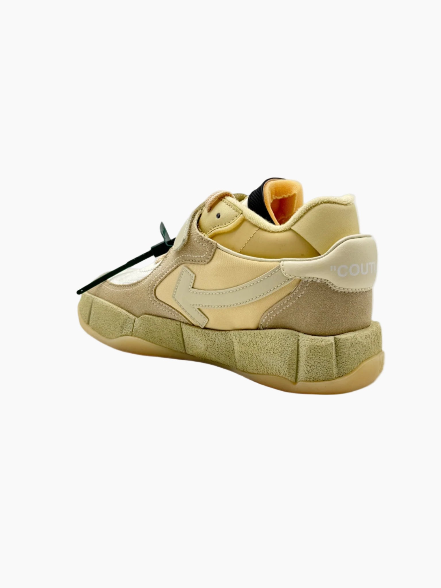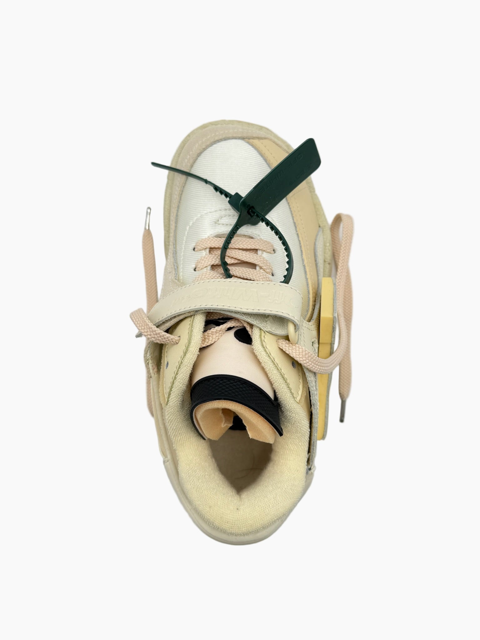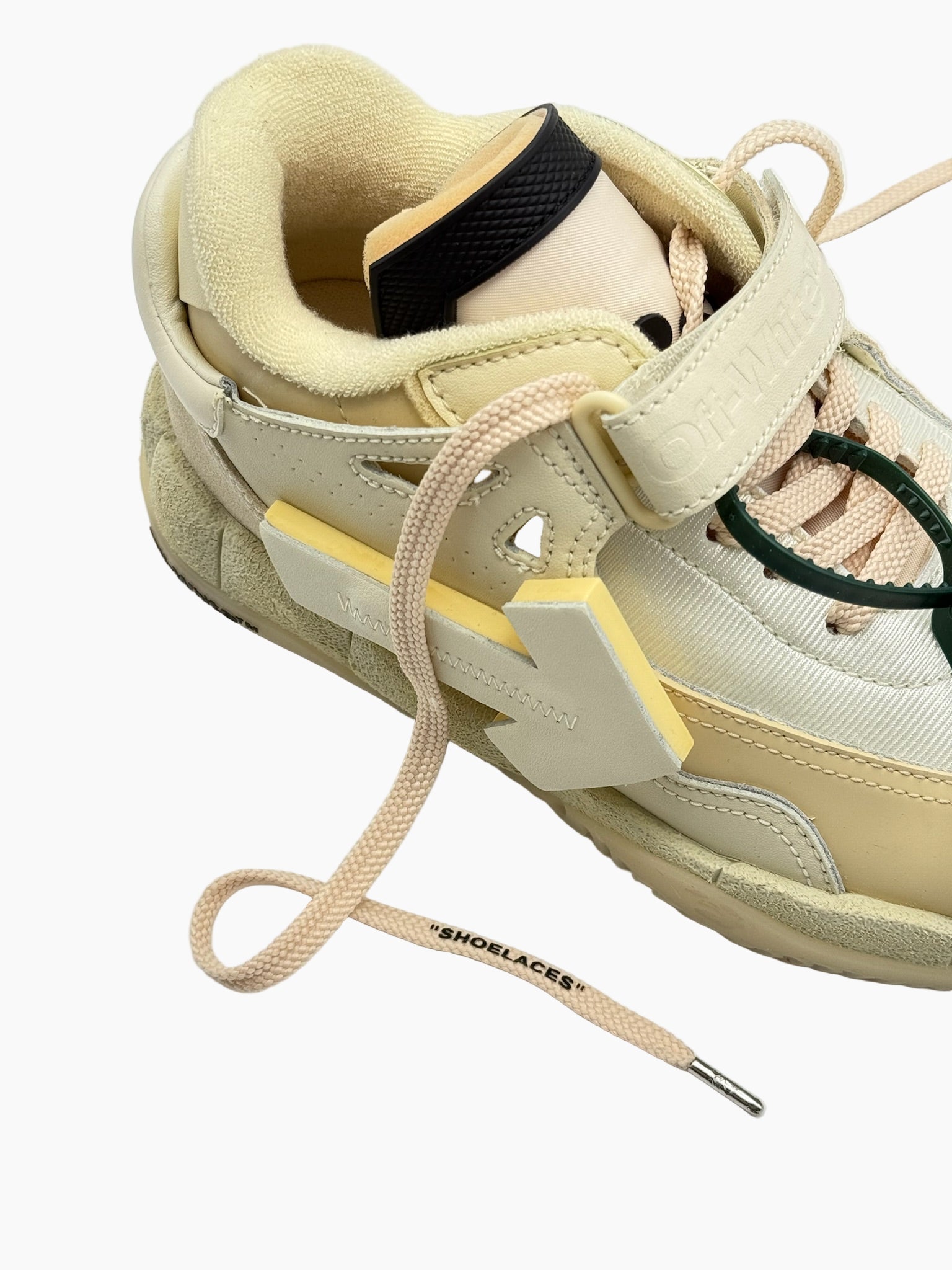 Off-White low-top sneaker crafted from a mix of technical materials and suede, featuring signature details such as the embossed arrow on the side, a green zip tie, and "SHOELACES" lettering on the laces. The chunky design and multi-layered construction make this model bold and distinctive.