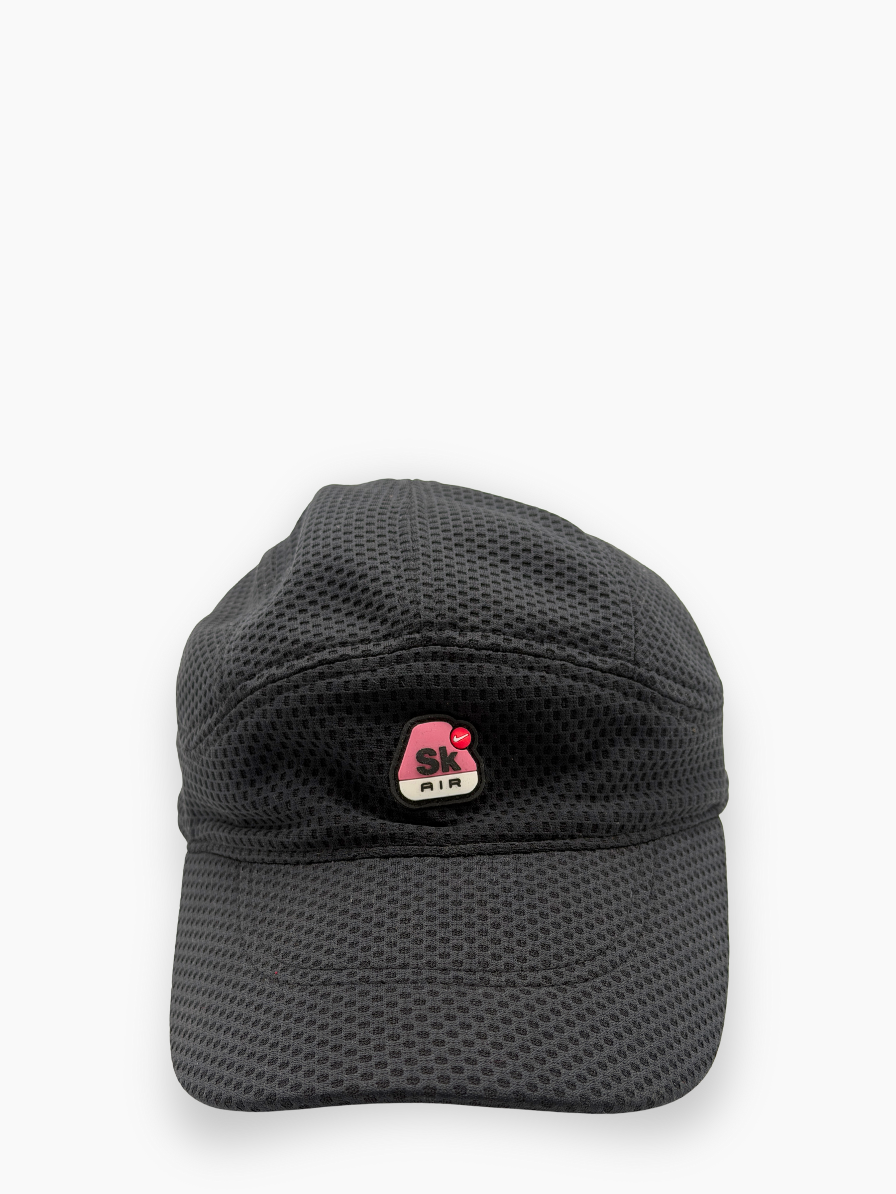 Black cap in breathable mesh fabric, lightweight and comfortable, ideal for sports and streetwear outfits. It features a front patch with the SK Air logo in shades of red and ivory, adding a distinctive detail to the technical design. The flexible construction and curved visor ensure a comfortable and dynamic fit for everyday use.