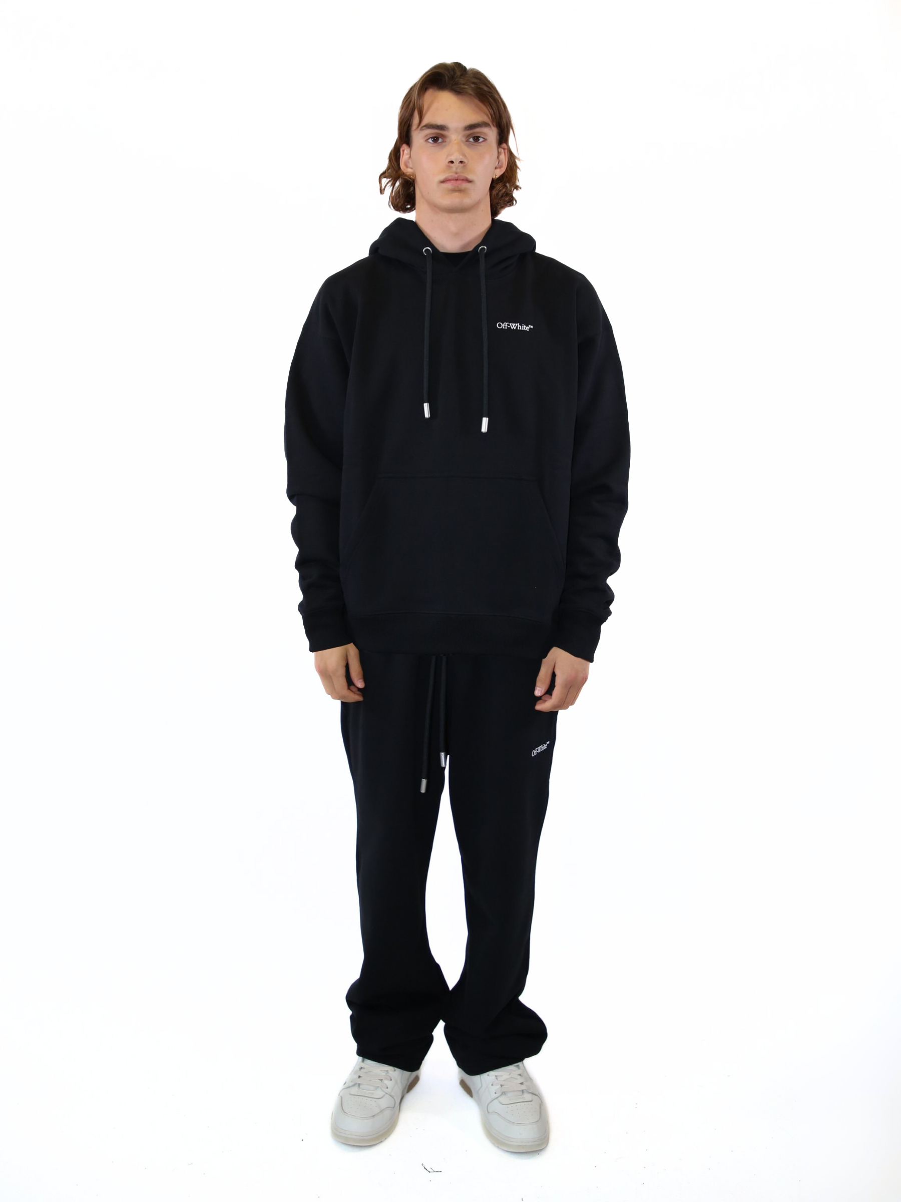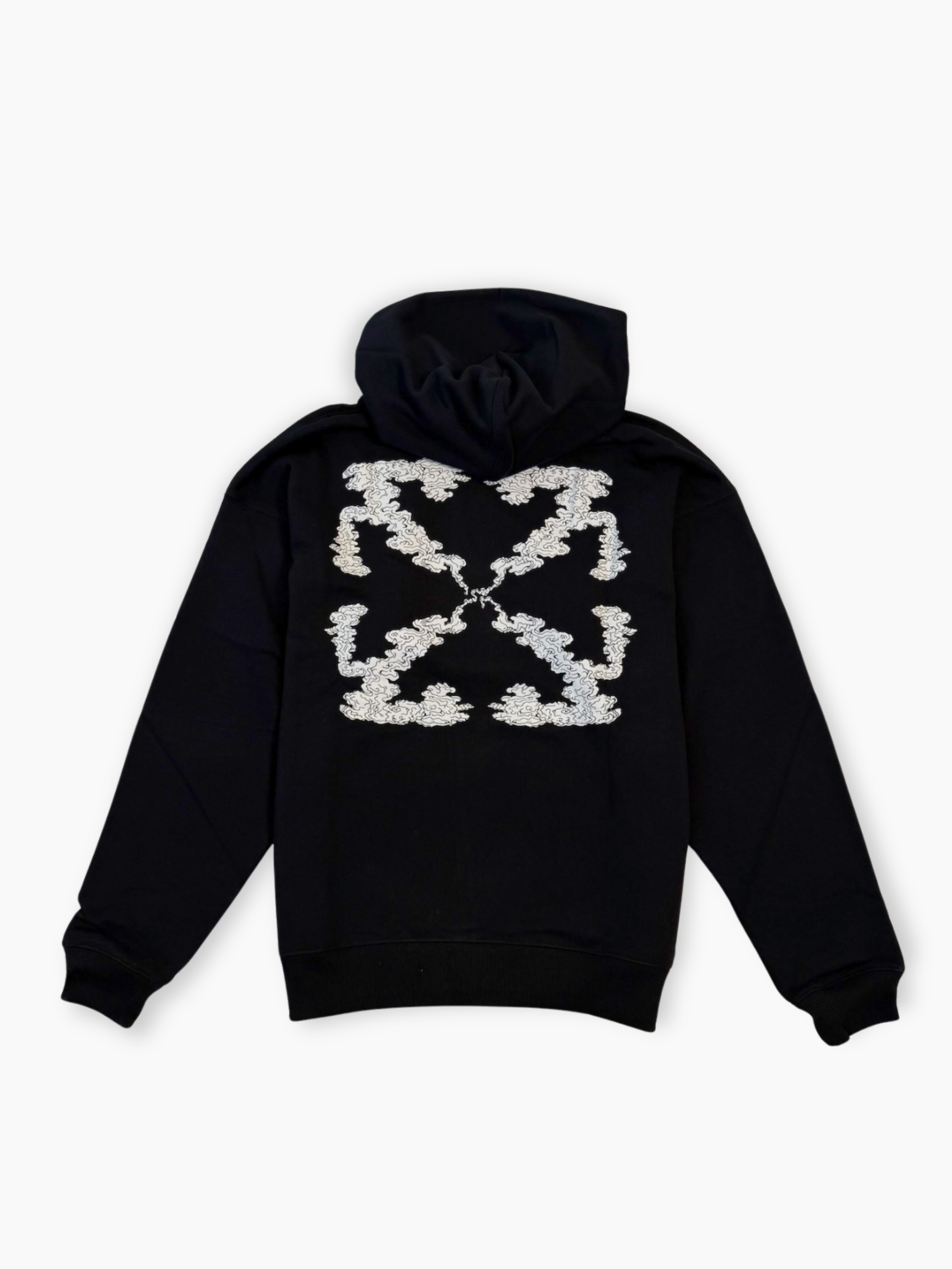 Black Off-White hoodie, crafted from soft cotton. It features an adjustable drawstring hood, a front kangaroo pocket, and an embroidered "Off-White™" logo on the chest. The iconic wavy-effect embroidered arrow motif stands out on the back. A distinctive, urban piece, perfect for a contemporary streetwear look.