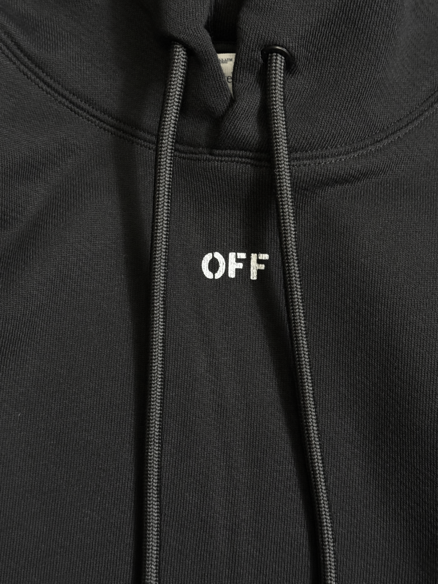 Felpa Off-White in cotone di alta qualità, con cappuccio e logo “OFF” stampato sul petto. Il design essenziale con tasca frontale a marsupio e vestibilità rilassata riflette lo stile urbano e moderno del brand. Perfetta per completare outfit streetwear dal carattere minimal ma distintivo.