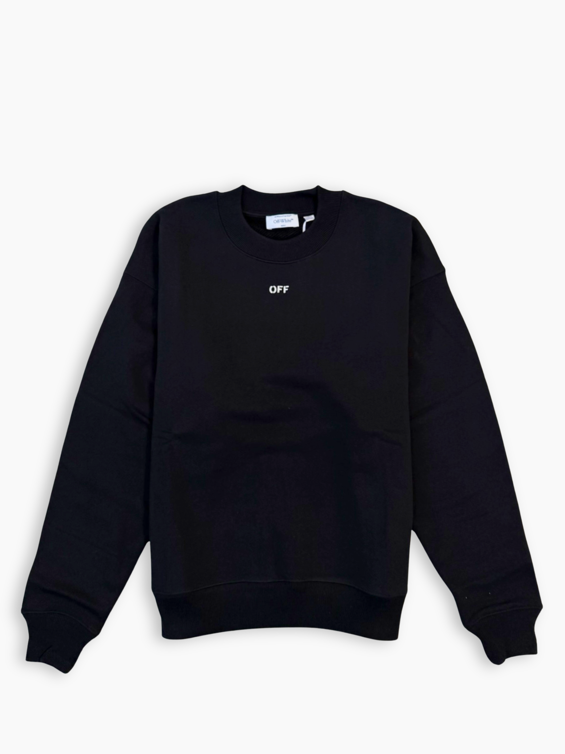 Black Off-White sweatshirt, made from soft, high-quality cotton. It features a ribbed crew neck, hem and cuffs, and a small, tone-on-tone "OFF" logo print on the chest. A versatile essential, perfect for adding a touch of streetwear to any outfit.